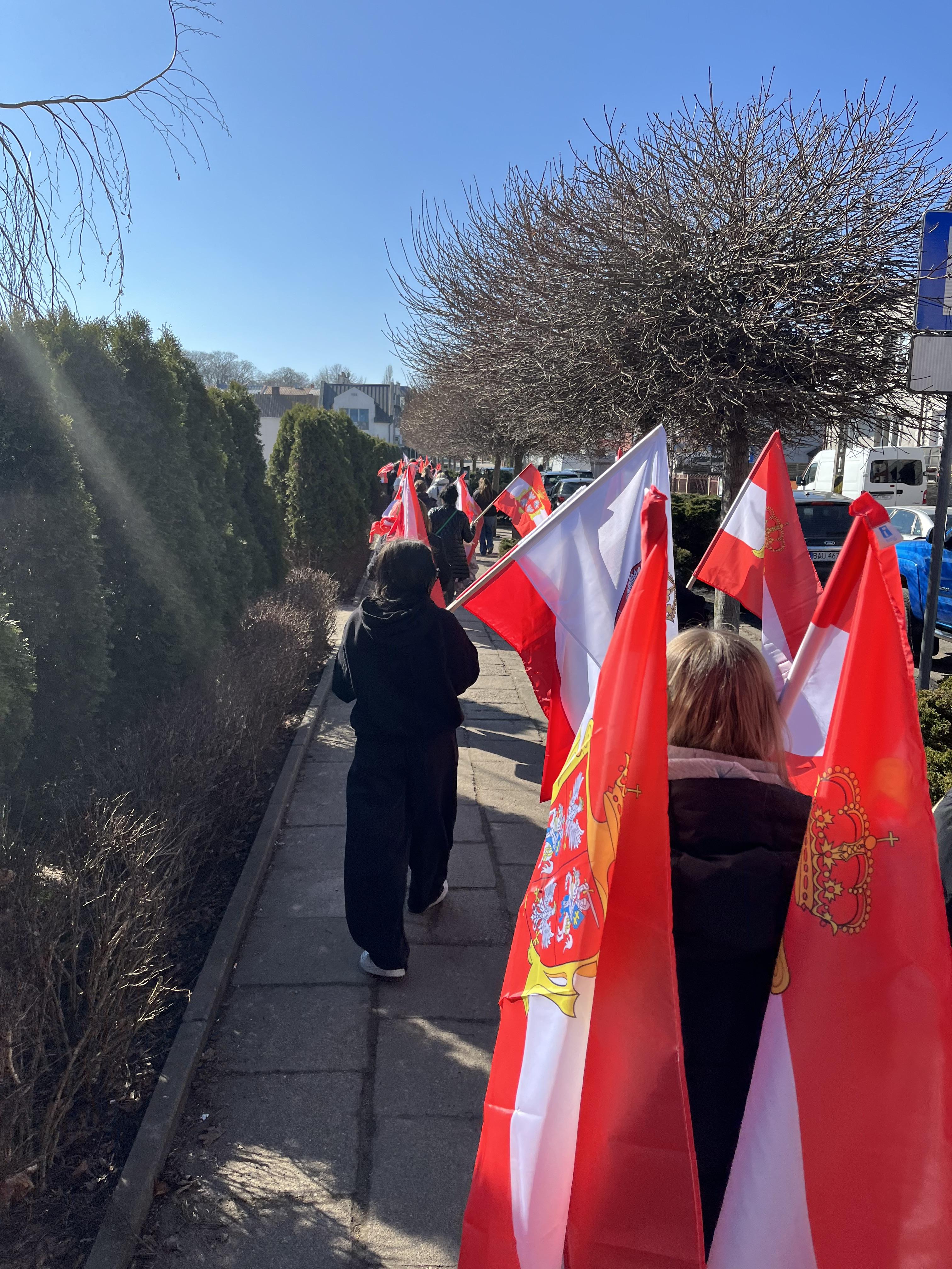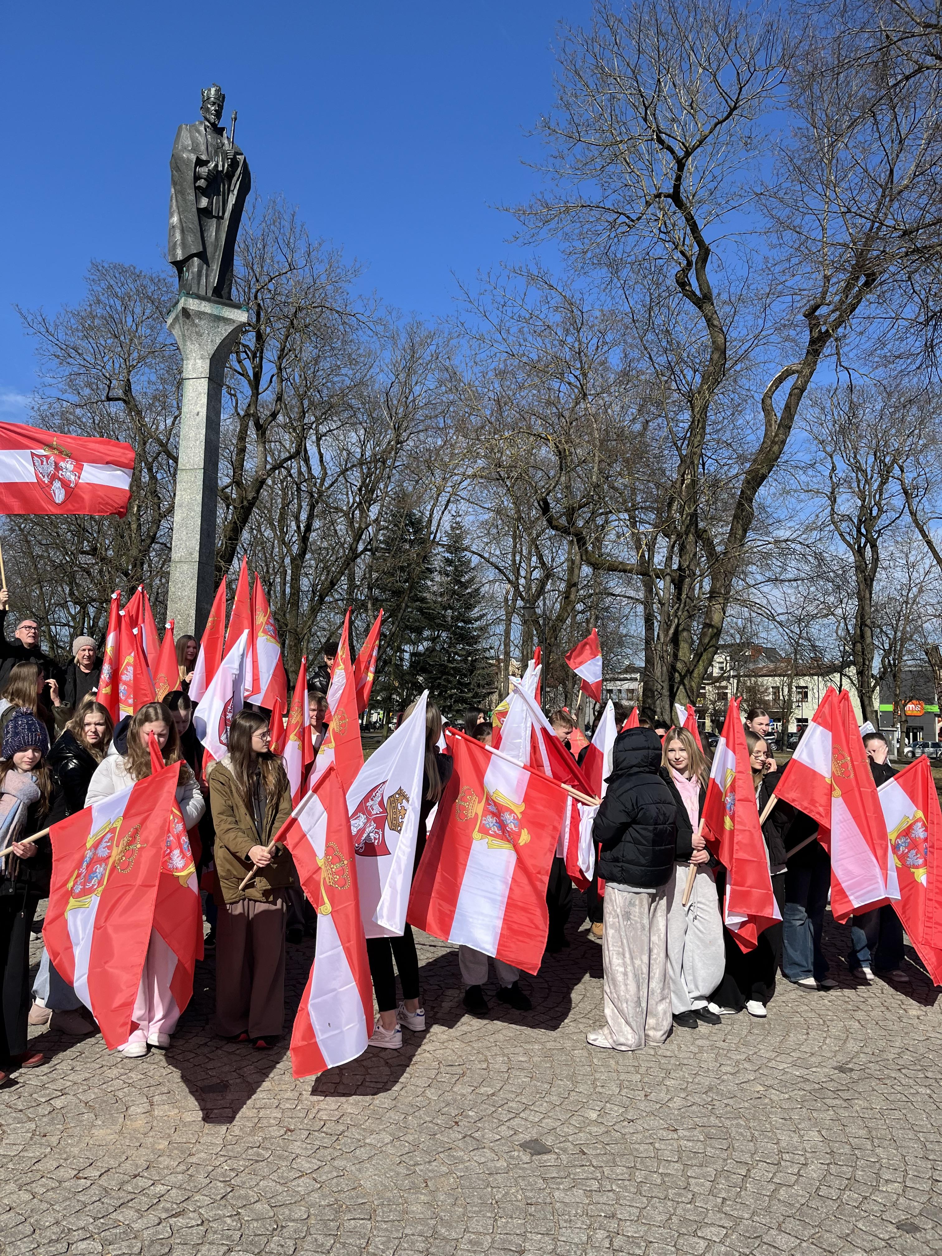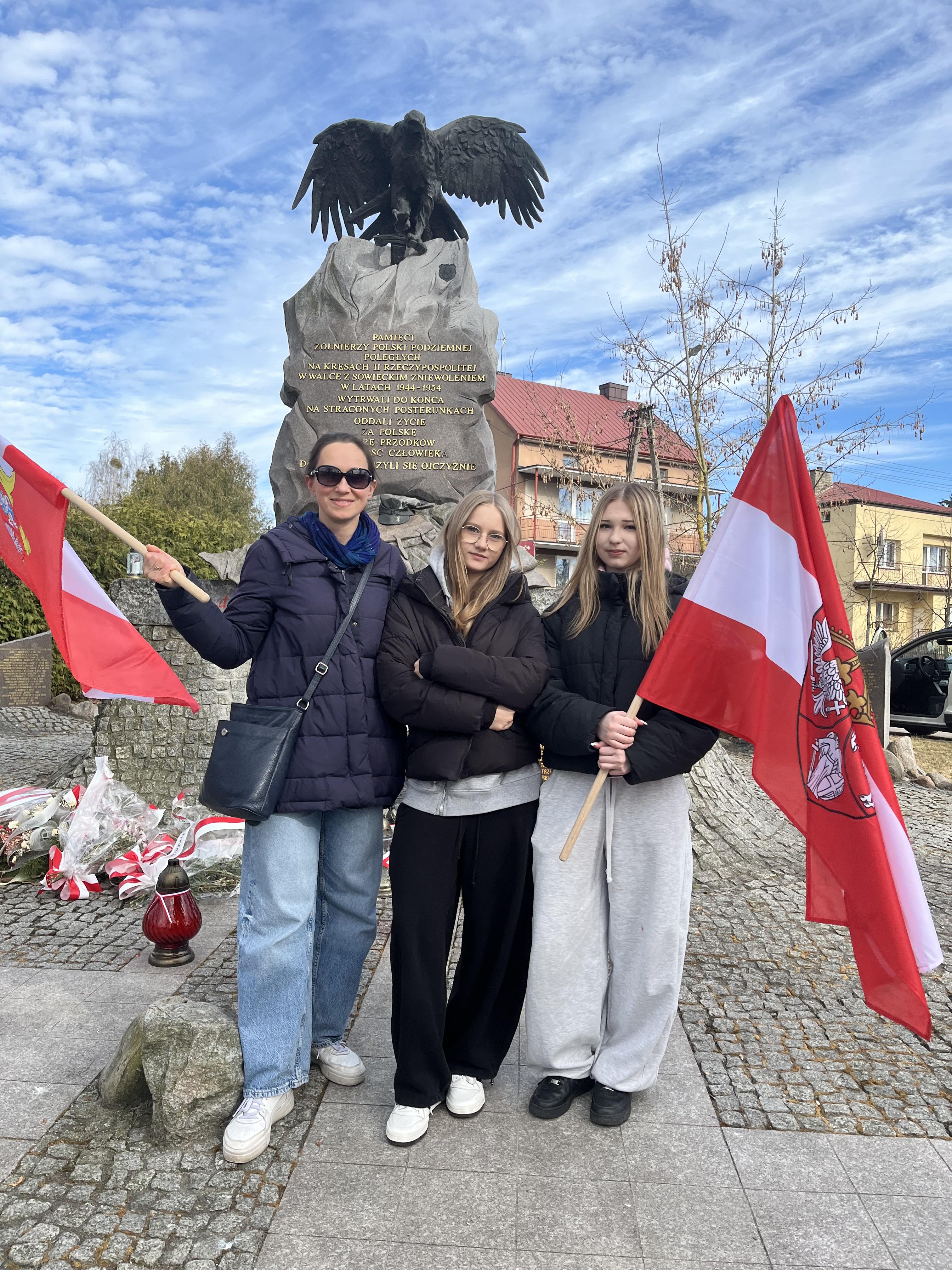 Pierwszym celem dzisiejszej podróży był Augustów. Po krótkim spacerze nad skutym lodem jeziorem Necko udaliśmy się pod pomnik króla S. Augusta Poniatowskiego, gdzie spotkaliśmy się z naszymi starszymi kolegami i koleżankami, a także wysłuchaliśmy krótkiego przemówienia wygłoszonego przez p. Cezarego Jurkiewicza- głównego organizatora Paczki na Kresy.