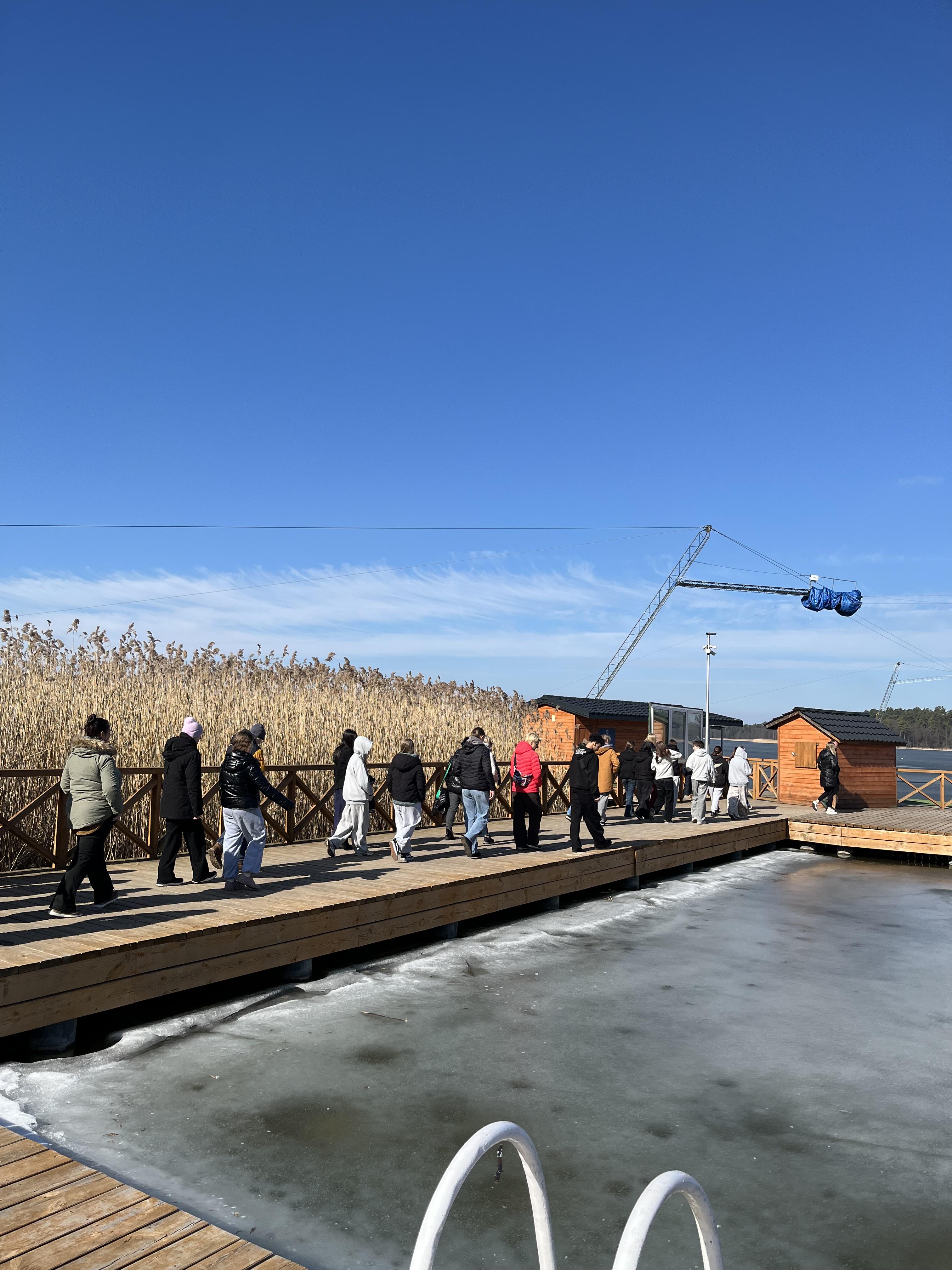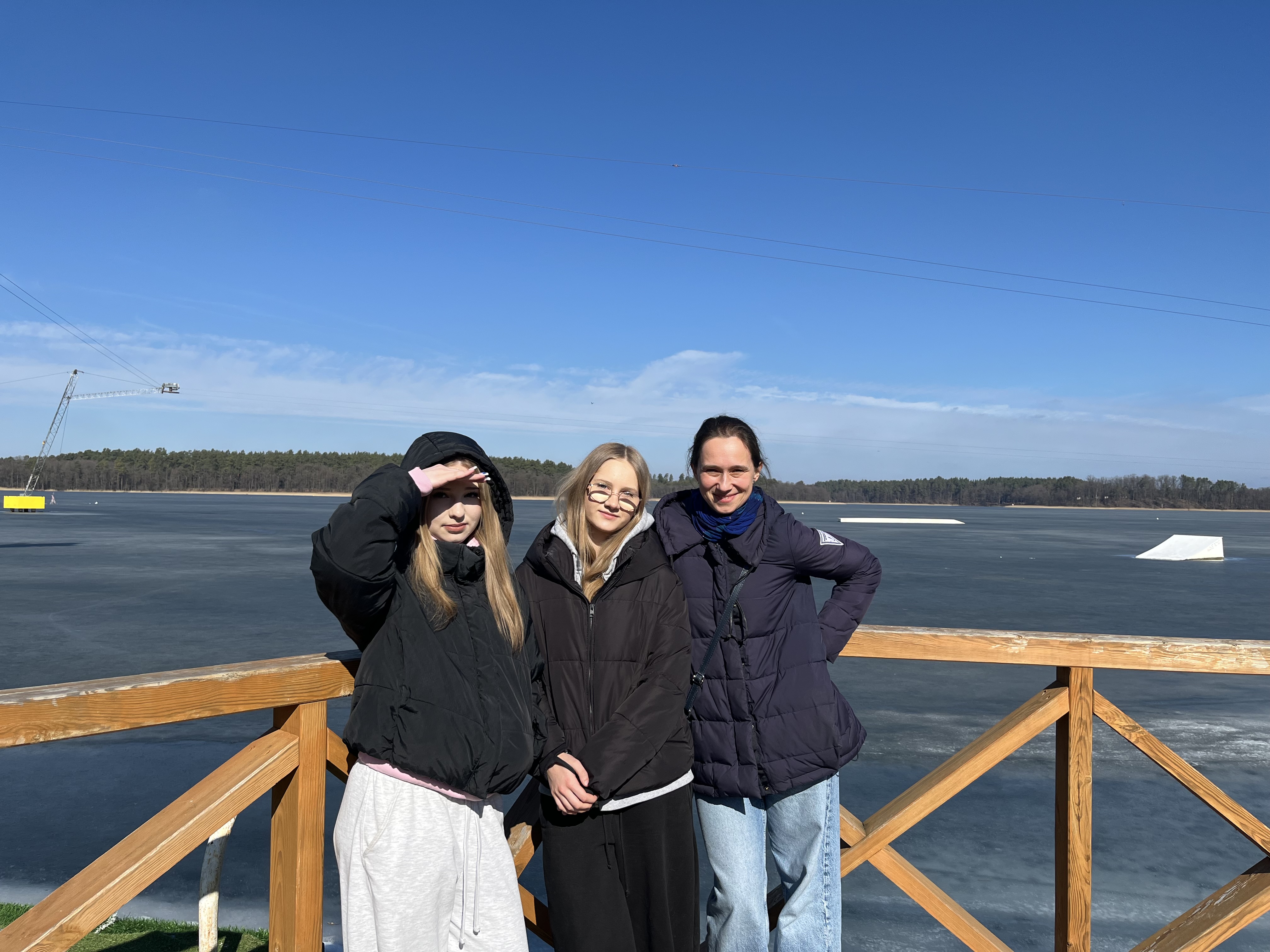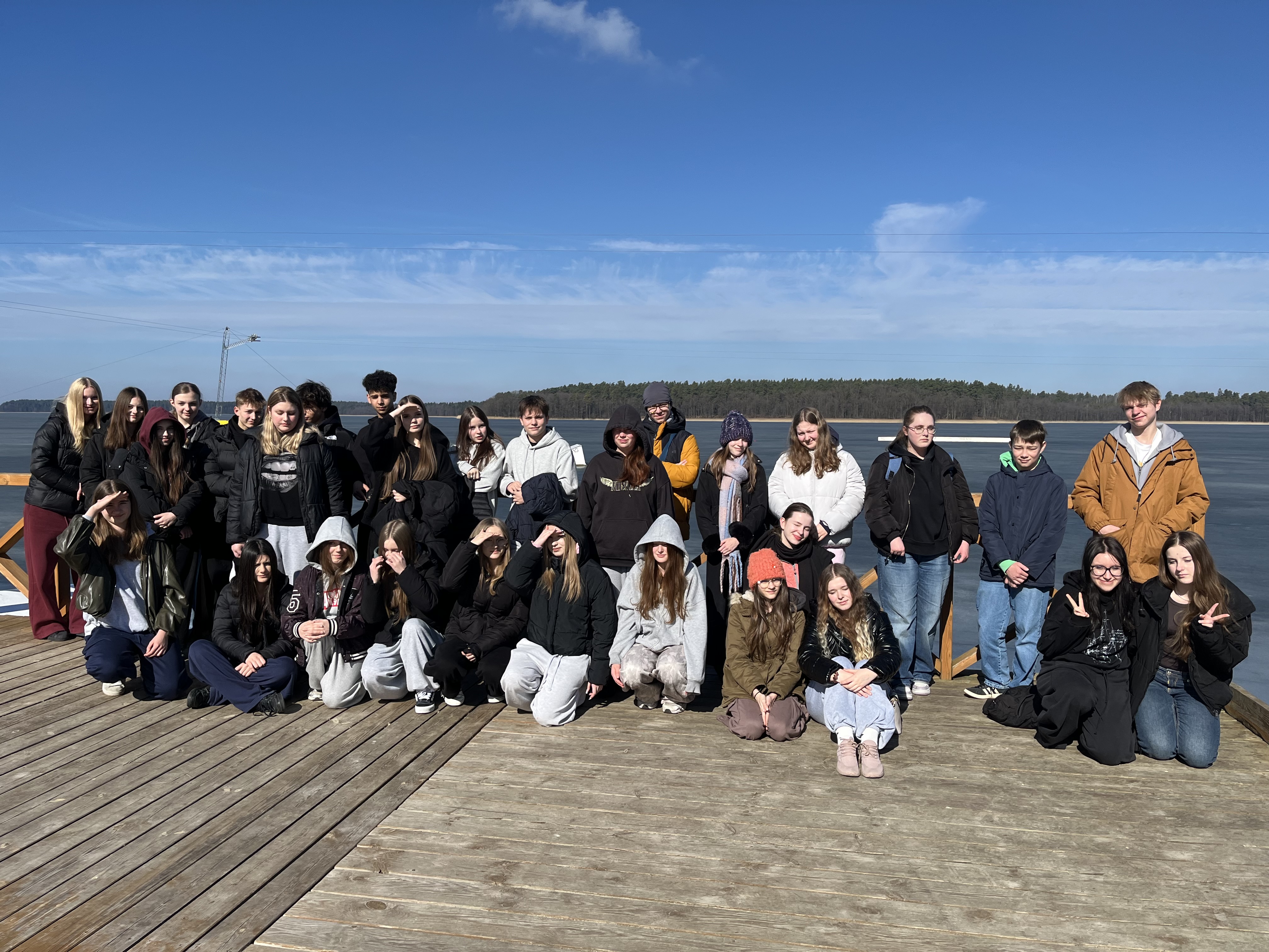 Pierwszym celem dzisiejszej podróży był Augustów. Po krótkim spacerze nad skutym lodem jeziorem Necko udaliśmy się pod pomnik króla S. Augusta Poniatowskiego, gdzie spotkaliśmy się z naszymi starszymi kolegami i koleżankami, a także wysłuchaliśmy krótkiego przemówienia wygłoszonego przez p. Cezarego Jurkiewicza- głównego organizatora Paczki na Kresy.