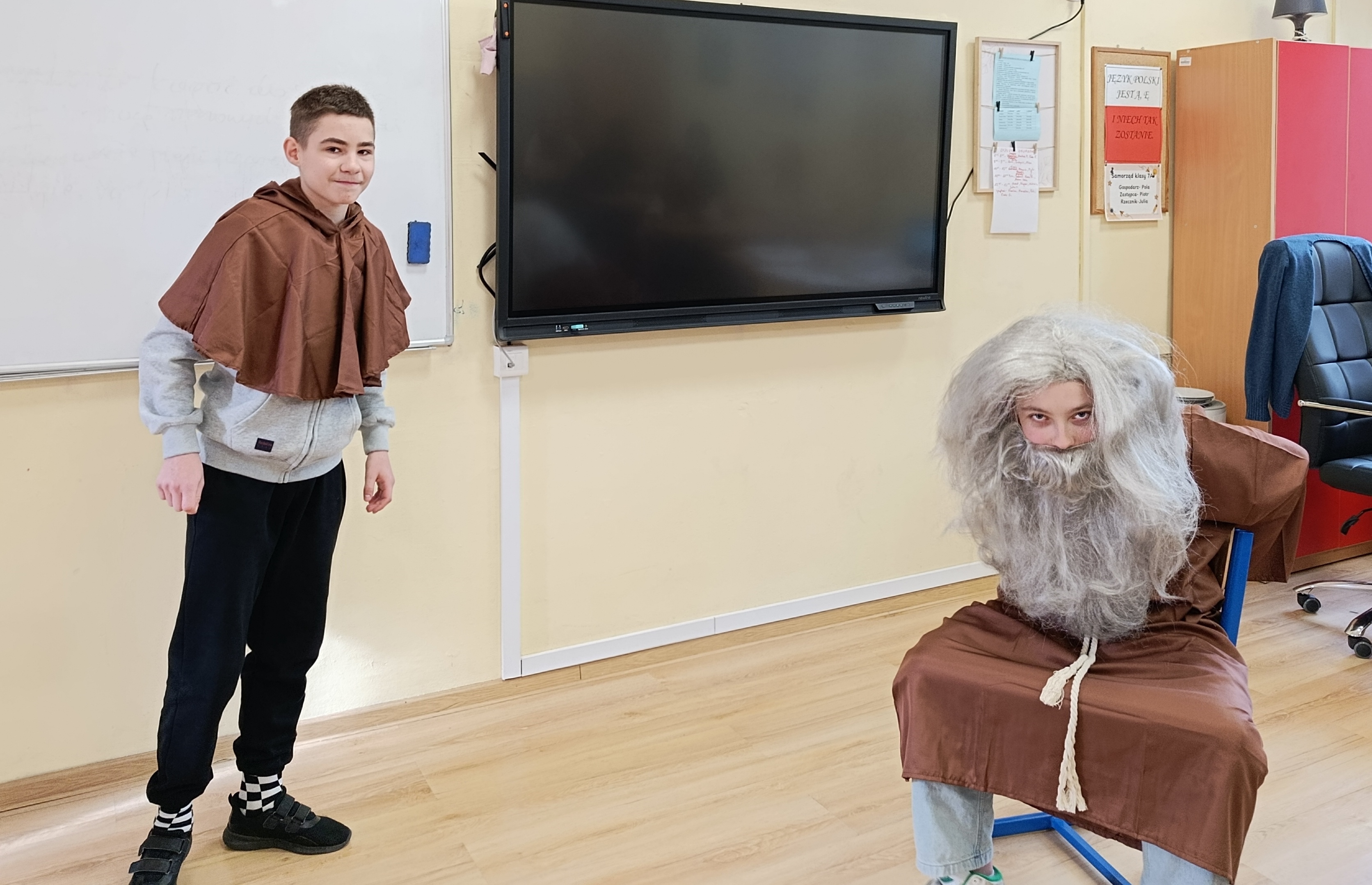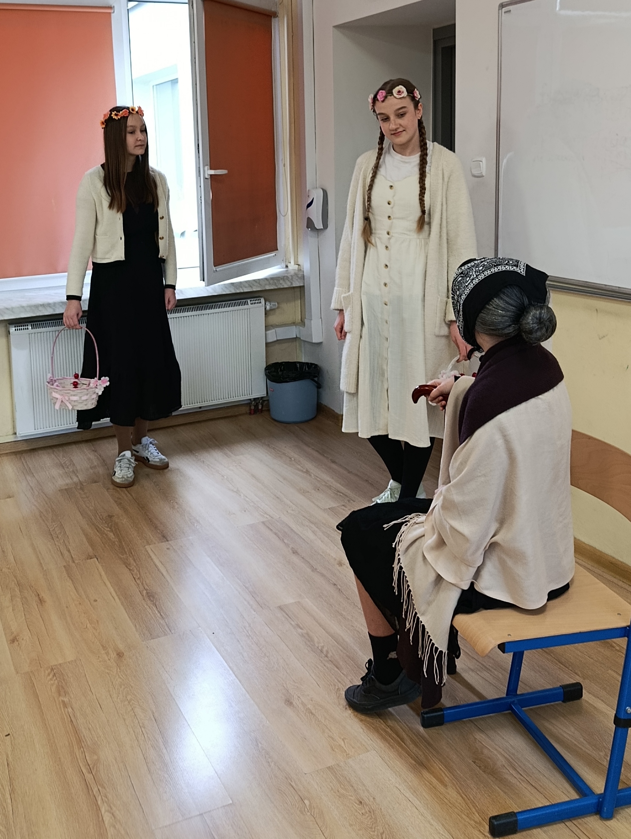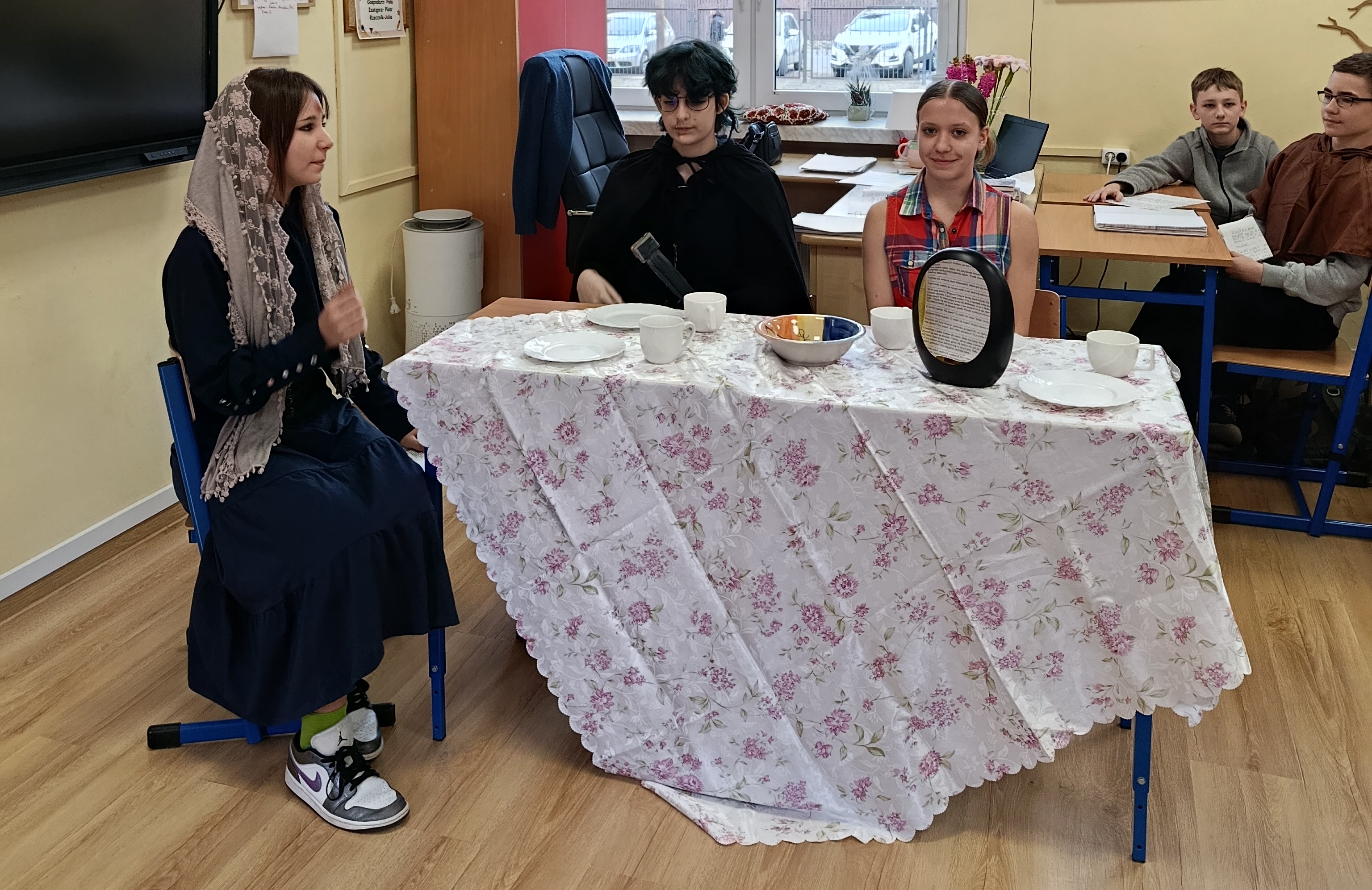 Dzisiaj sala nr 10 zamieniła się w mini scenę. Uczniowie klasy 7B wcielili się w postacie z dramatu Juliusza Słowackiego „Balladyna” i odegrali wybrane sceny z tragedii. Obejrzeliśmy rozmowę Pustelnika z Kirkorem, następnie spotkanie Wdowy i jej córek z księciem, konkurs malinowy między Aliną i Balladyną, wyrzeknięcie się matki przez Balladynę. Była to okazja do utrwalenia treści utworu, ale także poradzenia sobie z tremą przed występem.