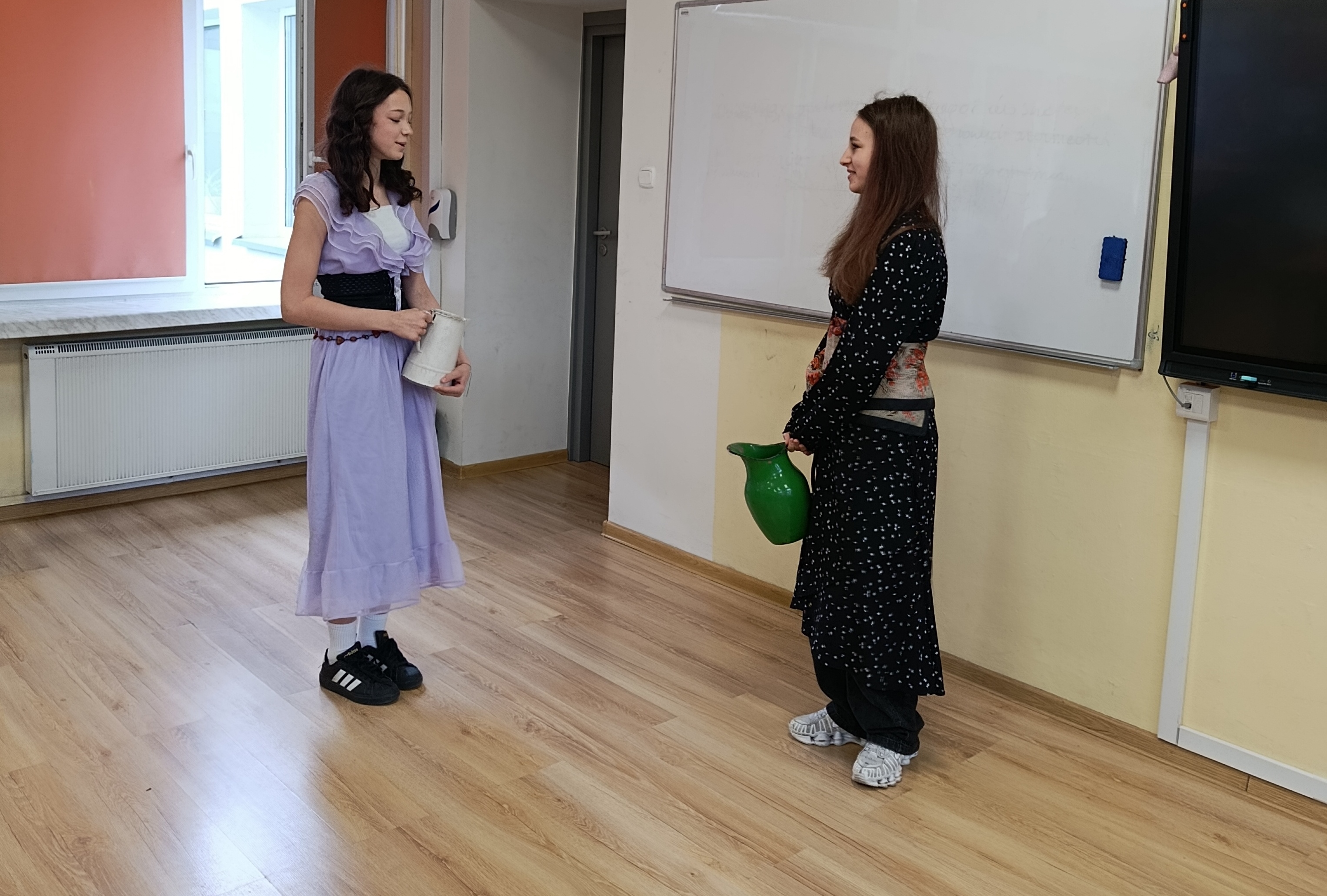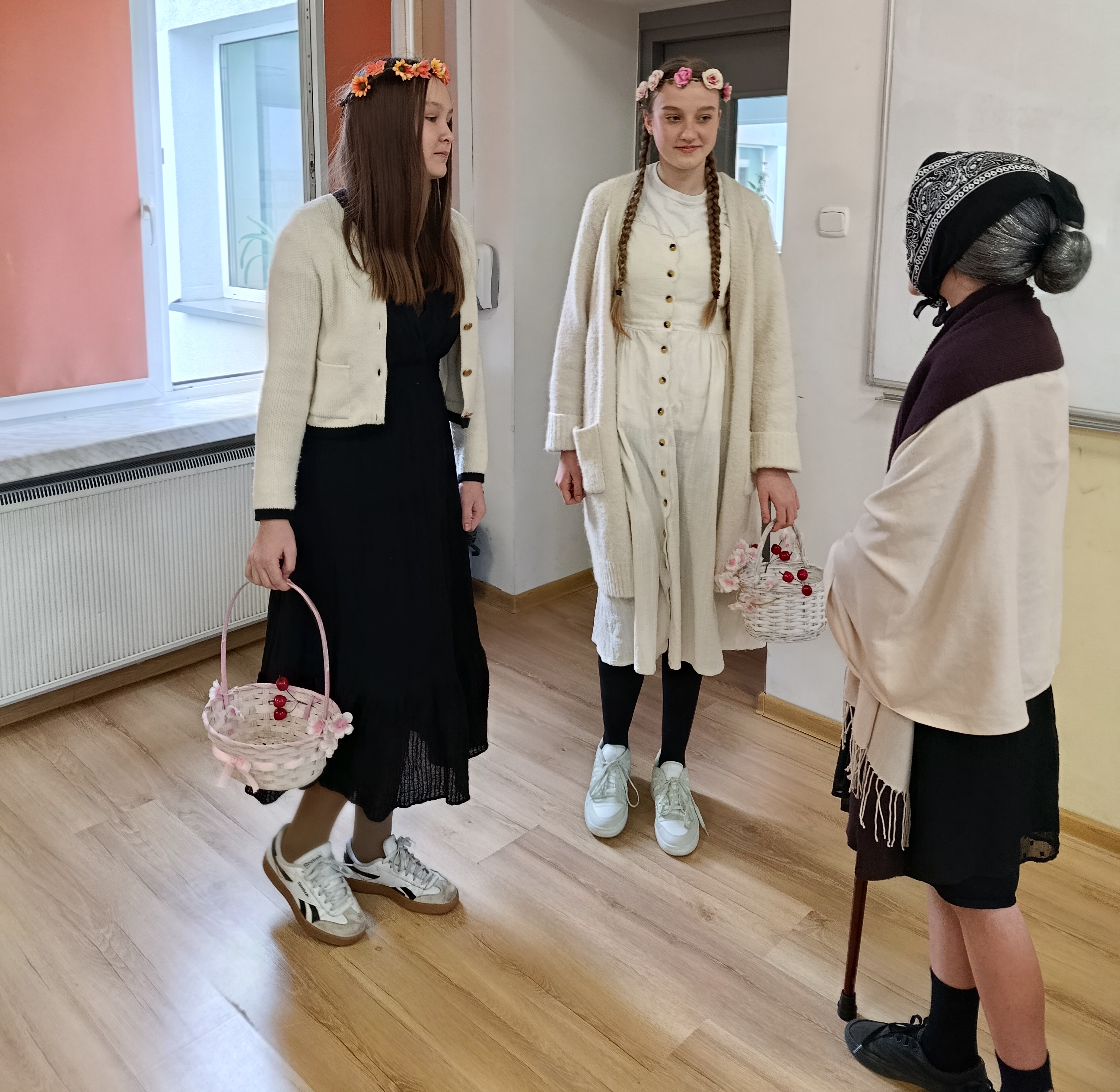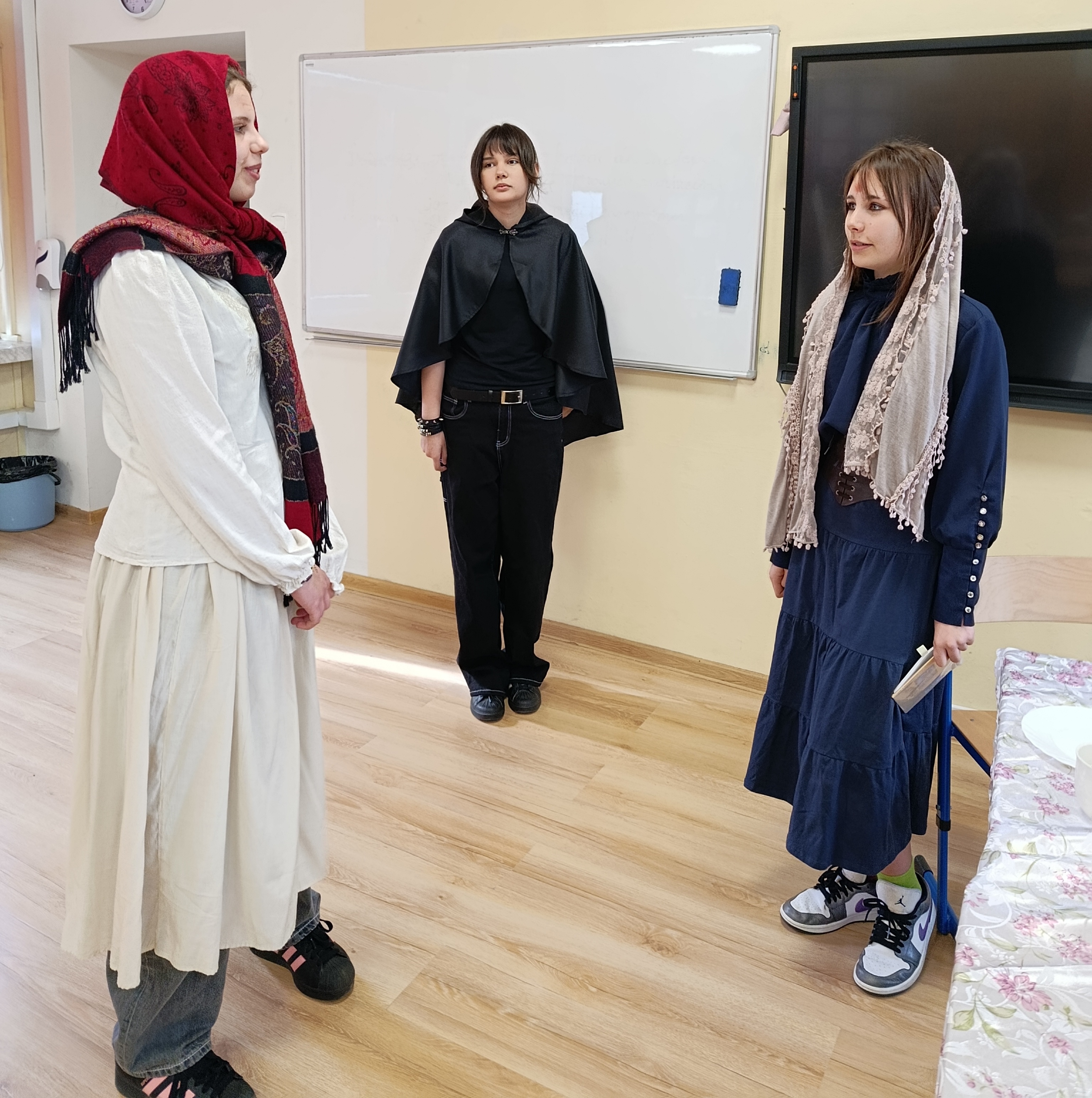 Dzisiaj sala nr 10 zamieniła się w mini scenę. Uczniowie klasy 7B wcielili się w postacie z dramatu Juliusza Słowackiego „Balladyna” i odegrali wybrane sceny z tragedii. Obejrzeliśmy rozmowę Pustelnika z Kirkorem, następnie spotkanie Wdowy i jej córek z księciem, konkurs malinowy między Aliną i Balladyną, wyrzeknięcie się matki przez Balladynę. Była to okazja do utrwalenia treści utworu, ale także poradzenia sobie z tremą przed występem.
