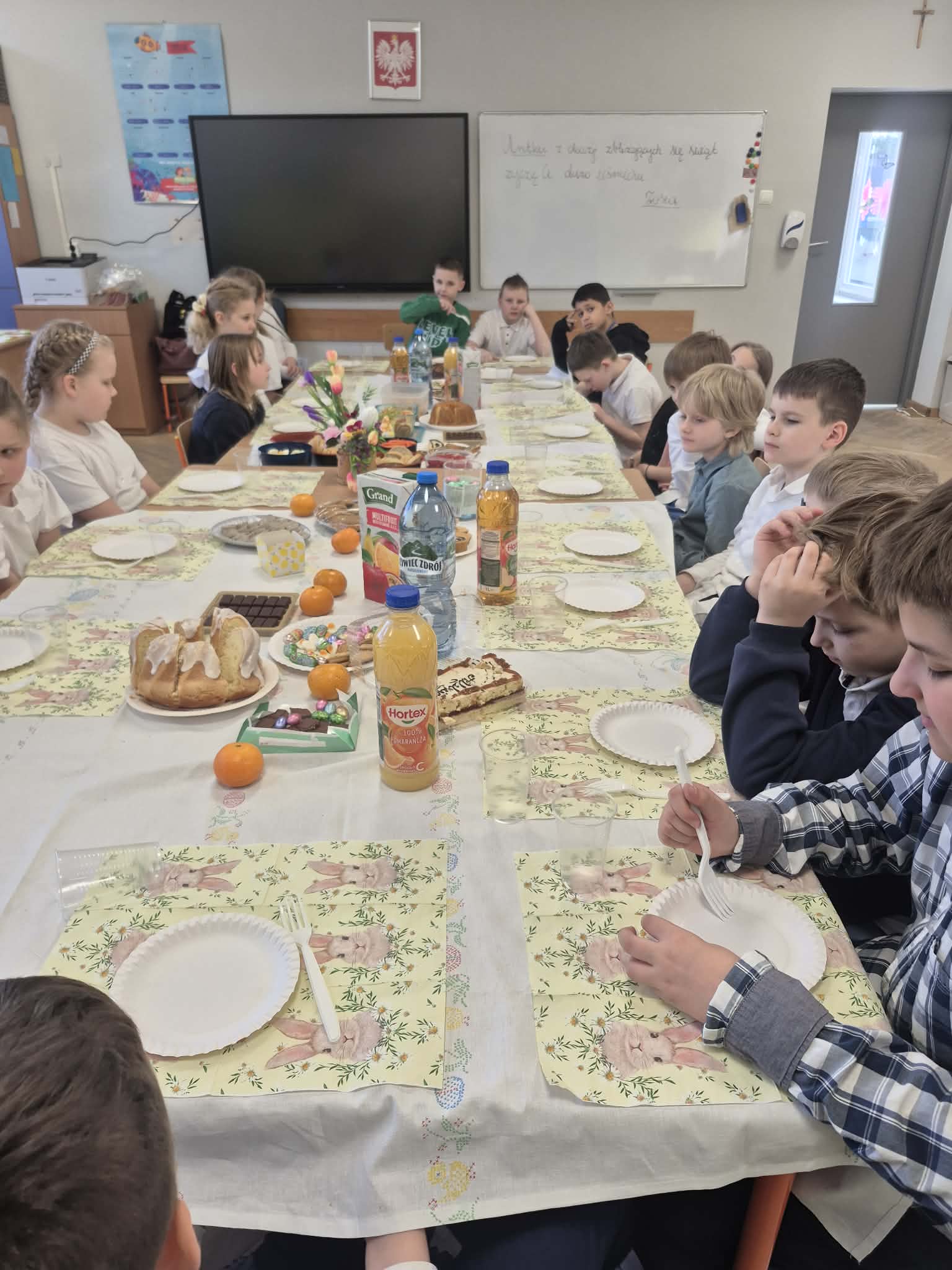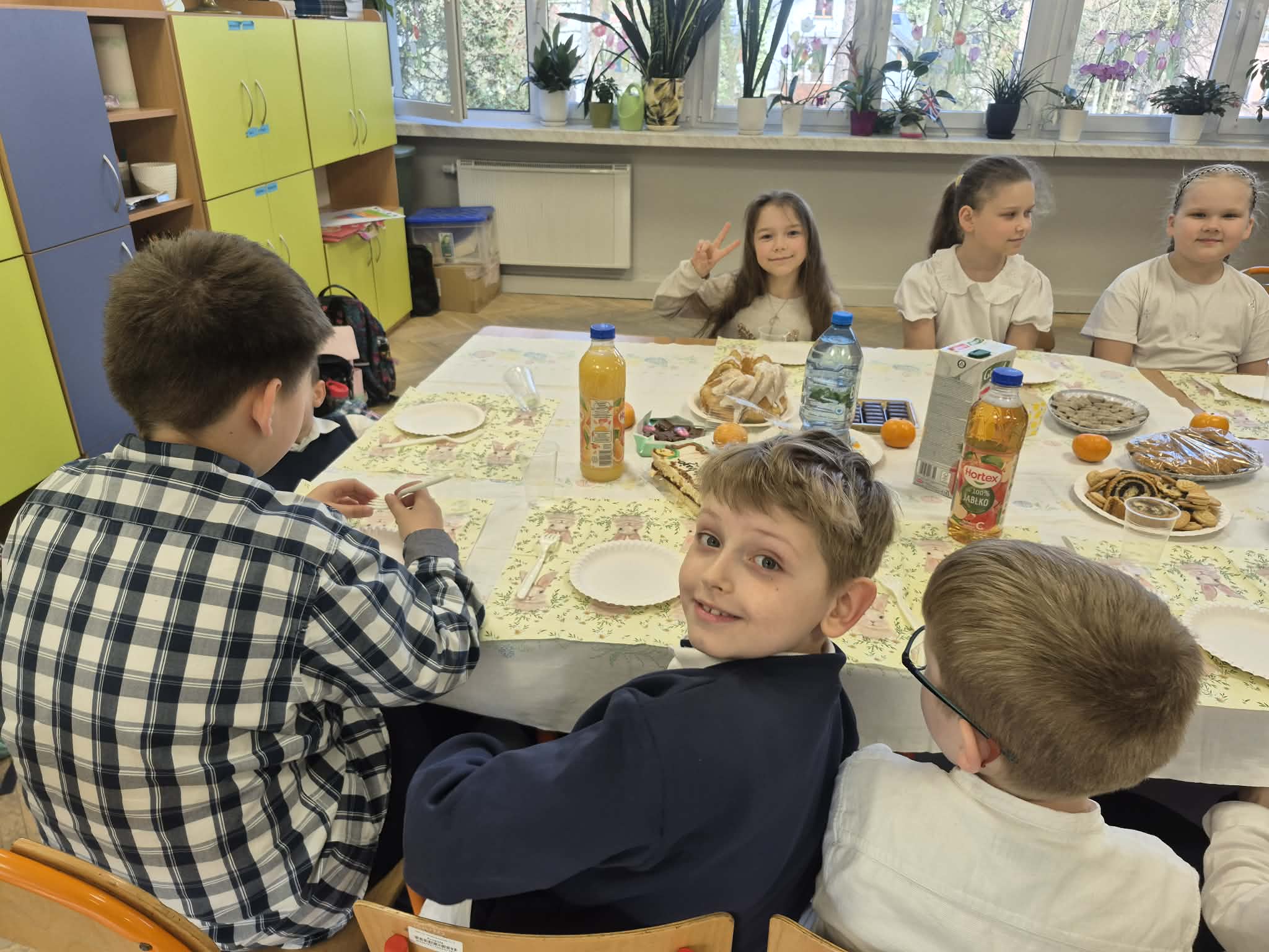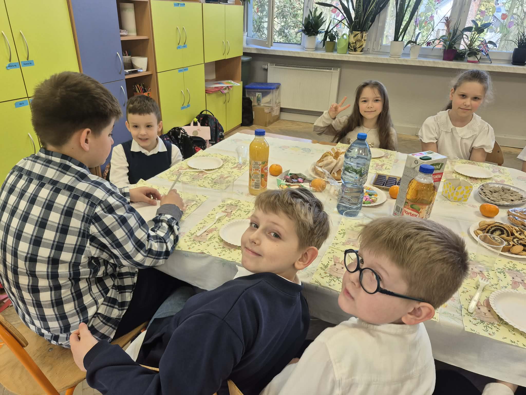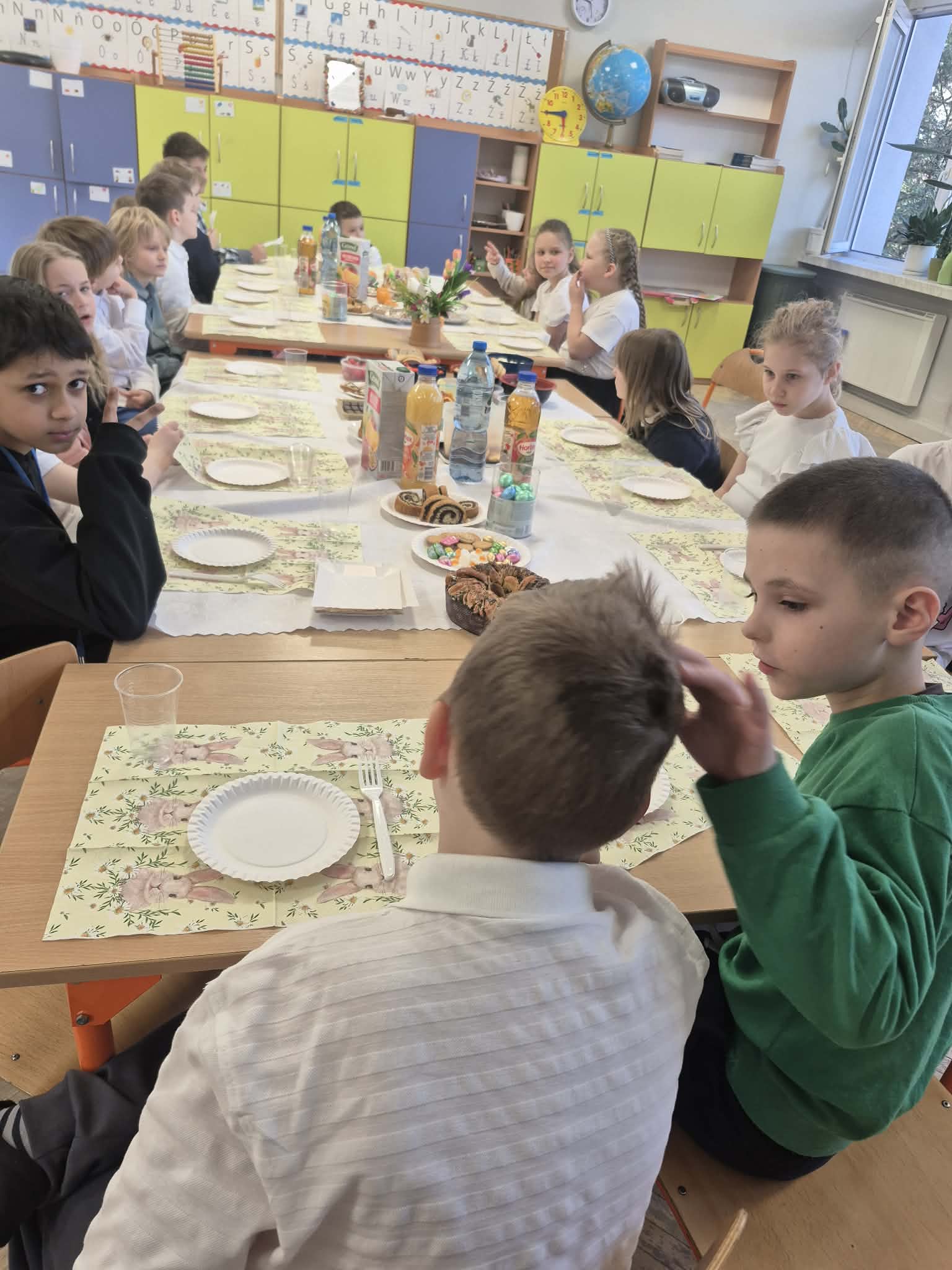 Dziś w klasie 2a odbyło się tradycyjne świąteczne śniadanie. Uczniowie z wielkim zaangażowaniem przygotowywali świąteczny stół. Zaczęli od nakrycia białymi obrusami, ustawienia naczyń i dekoracji oraz rozstawienia przygotowanych przez rodziców przysmaków. Po wysłuchaniu informacji o tradycjach związanych z nadchodzącymi świętami i złożeniu życzeń rozpoczęliśmy wspólnie biesiadowanie. Nie zabrakło tradycyjnego jaka, pysznej kiełbaski, smakowitych bab i mazurków. Dbaliśmy o dobrą , rodzinną atmosferę. Wiele radości sprawiła dzieciom również wielkanocna poczta. Wszyscy obdarowali się wzajemnie przygotowanymi wielkanocnymi kartkami z życzeniami. To był piękny dzień.