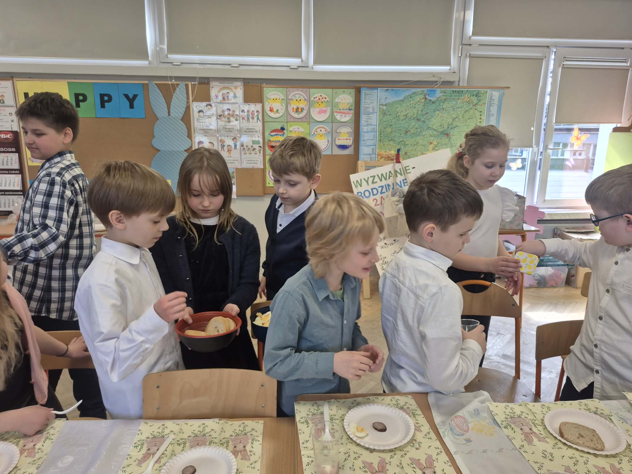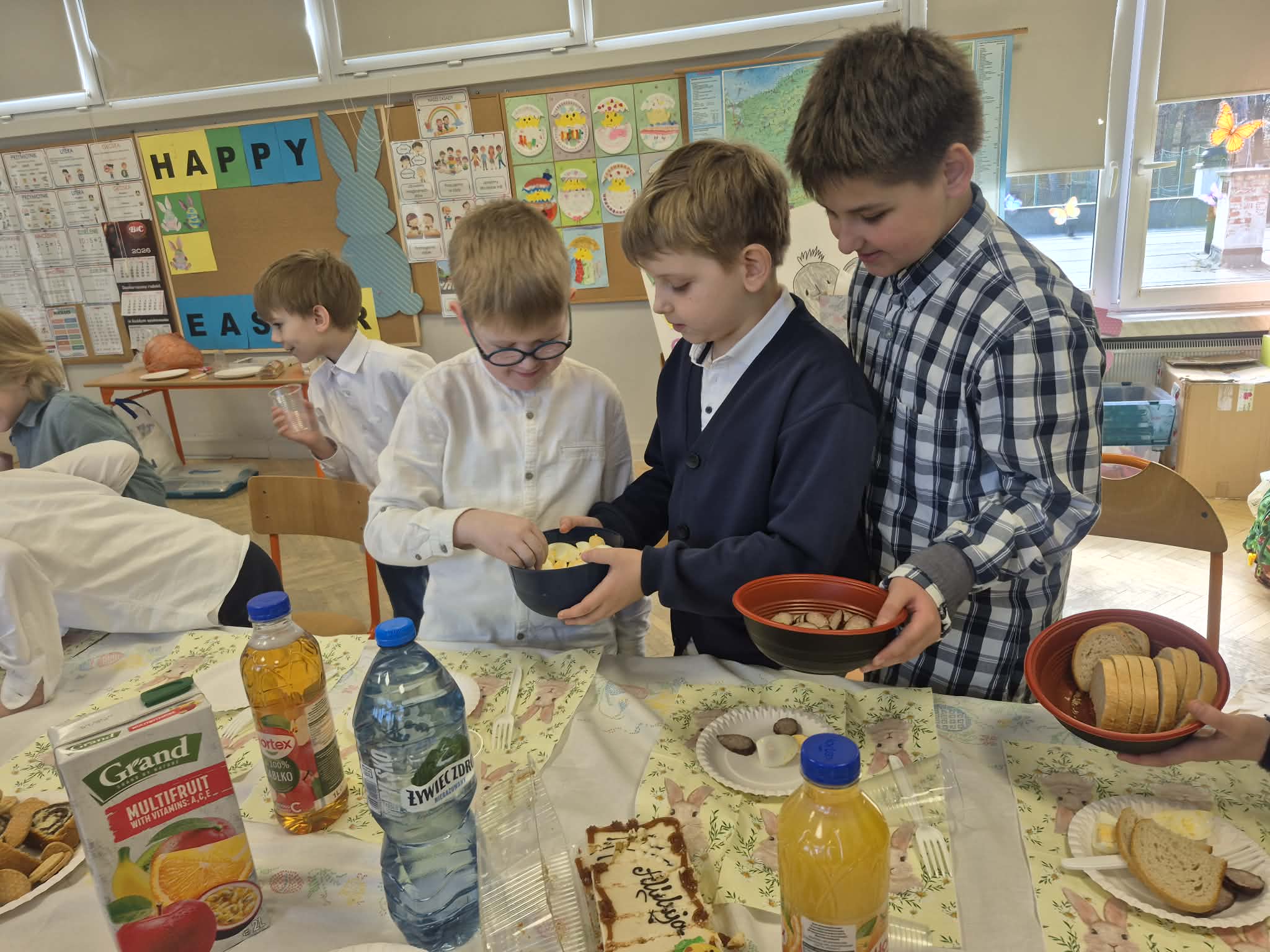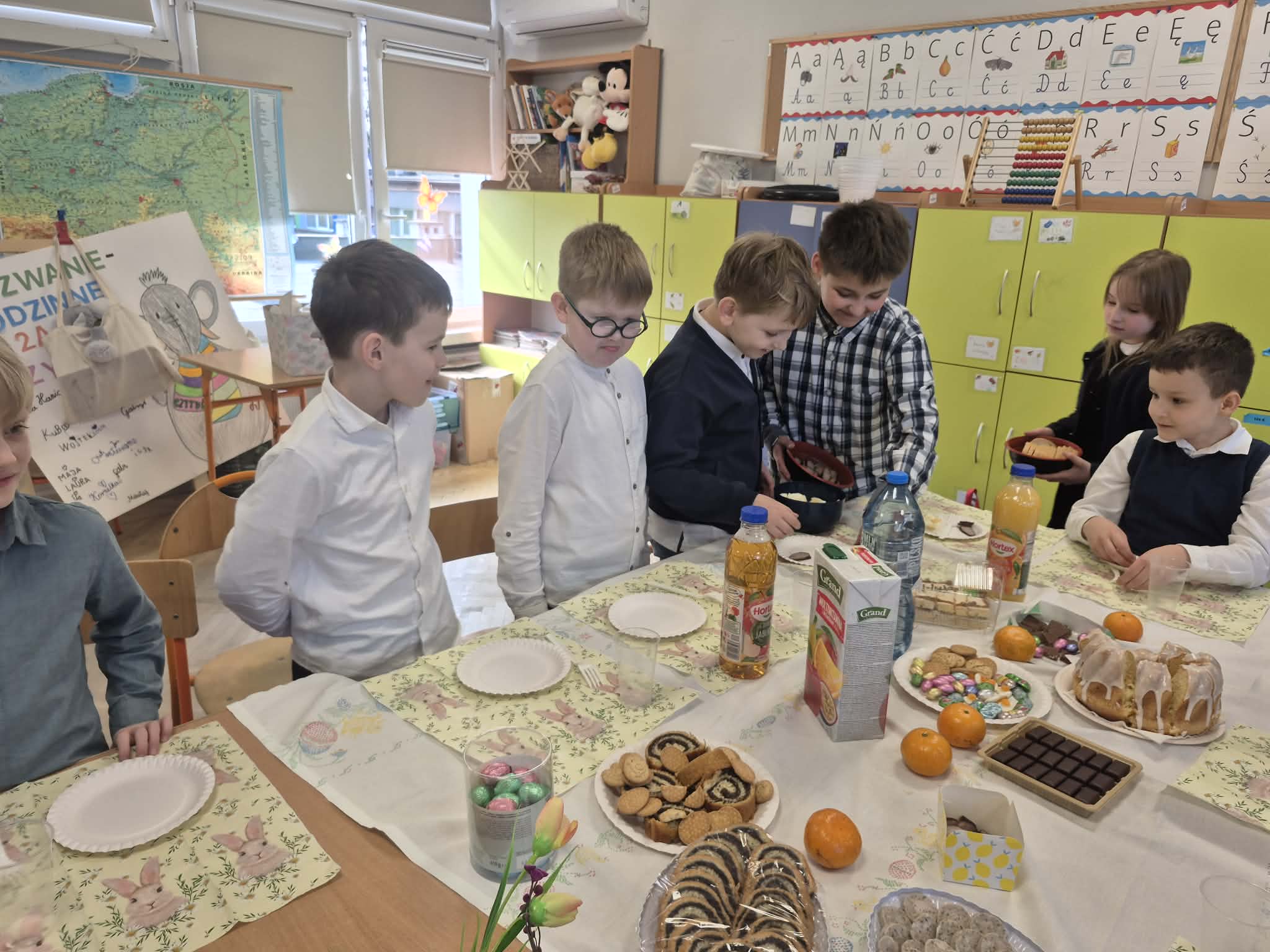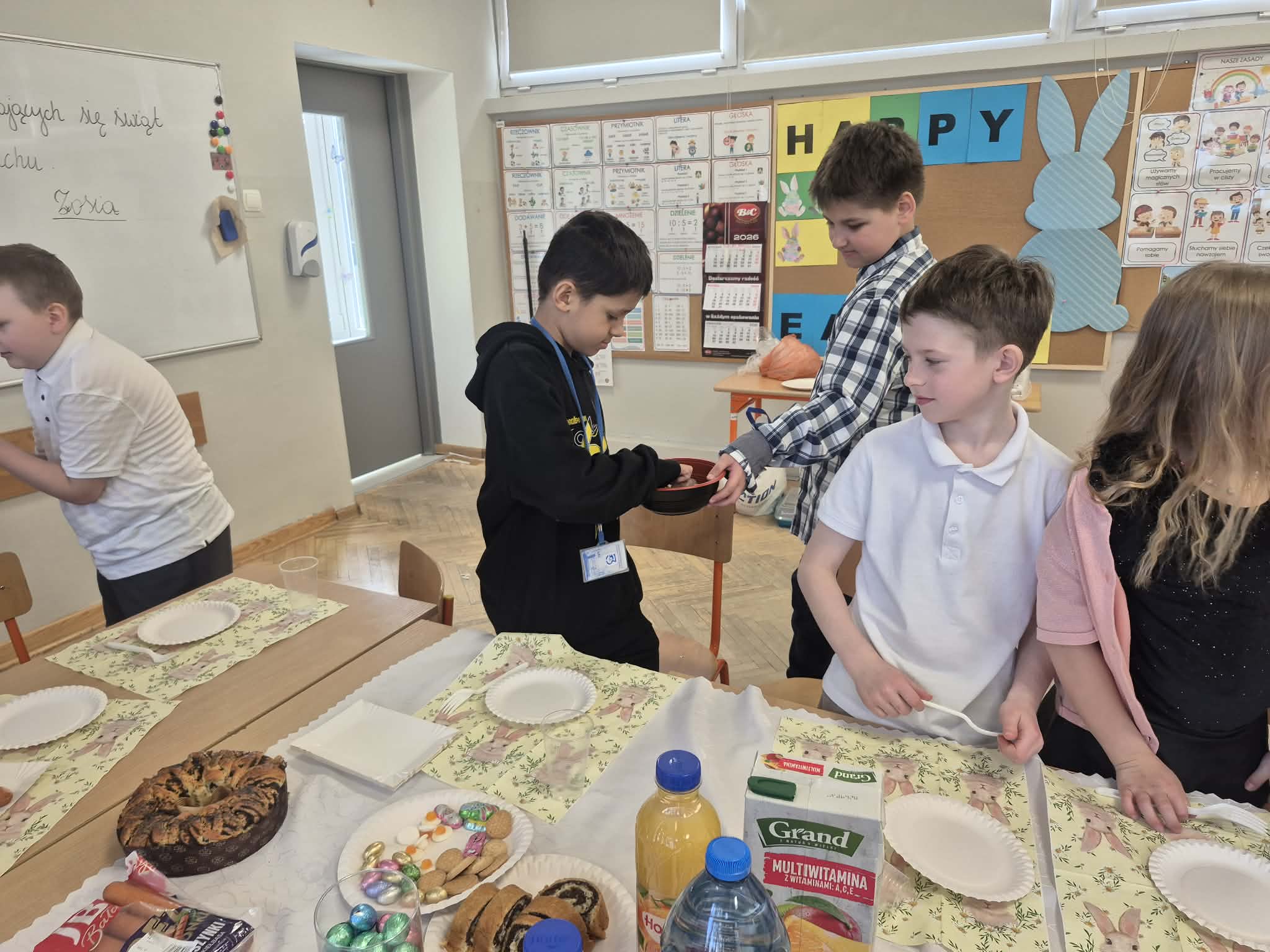 Dziś w klasie 2a odbyło się tradycyjne świąteczne śniadanie. Uczniowie z wielkim zaangażowaniem przygotowywali świąteczny stół. Zaczęli od nakrycia białymi obrusami, ustawienia naczyń i dekoracji oraz rozstawienia przygotowanych przez rodziców przysmaków. Po wysłuchaniu informacji o tradycjach związanych z nadchodzącymi świętami i złożeniu życzeń rozpoczęliśmy wspólnie biesiadowanie. Nie zabrakło tradycyjnego jaka, pysznej kiełbaski, smakowitych bab i mazurków. Dbaliśmy o dobrą , rodzinną atmosferę. Wiele radości sprawiła dzieciom również wielkanocna poczta. Wszyscy obdarowali się wzajemnie przygotowanymi wielkanocnymi kartkami z życzeniami. To był piękny dzień.