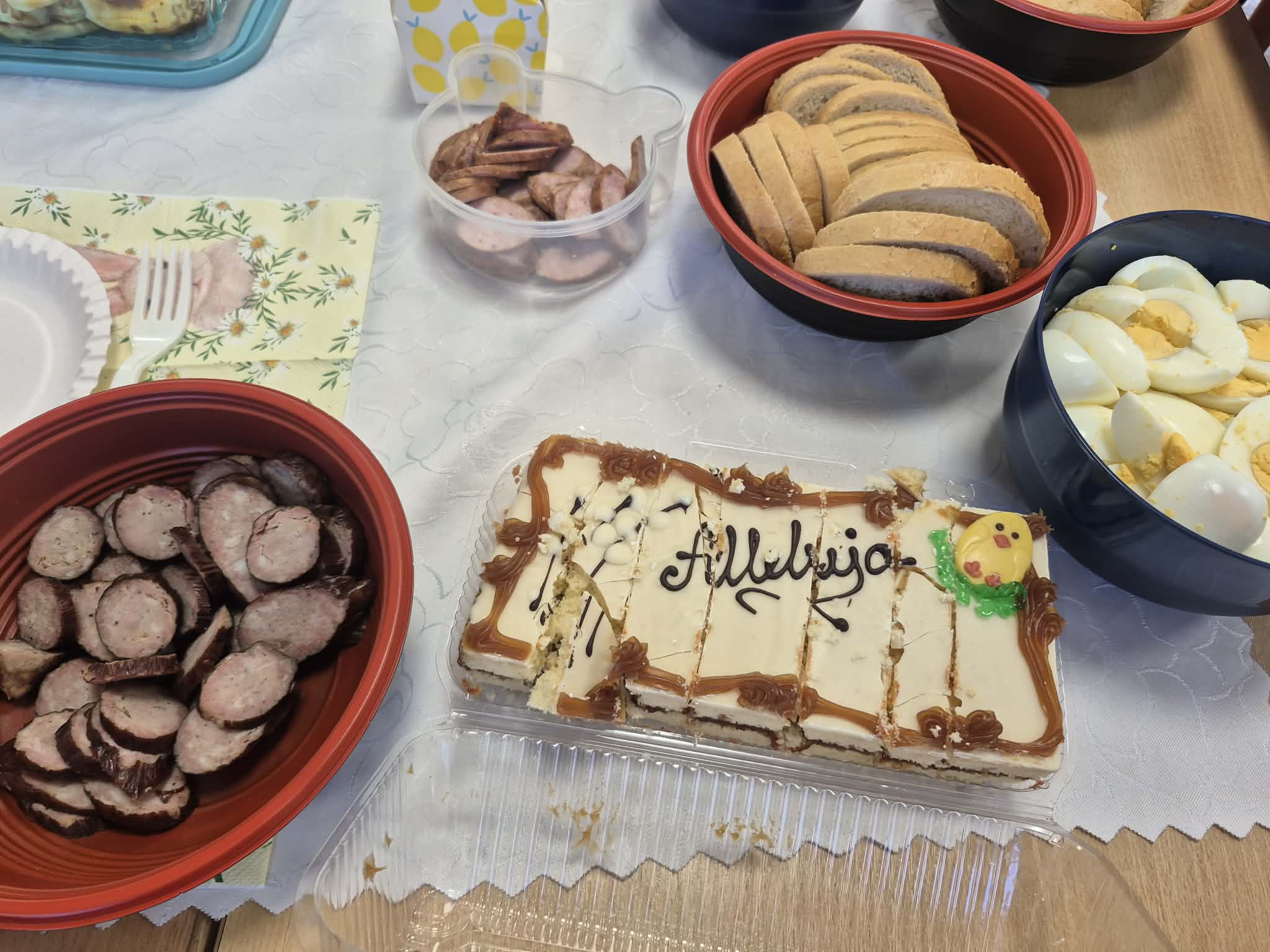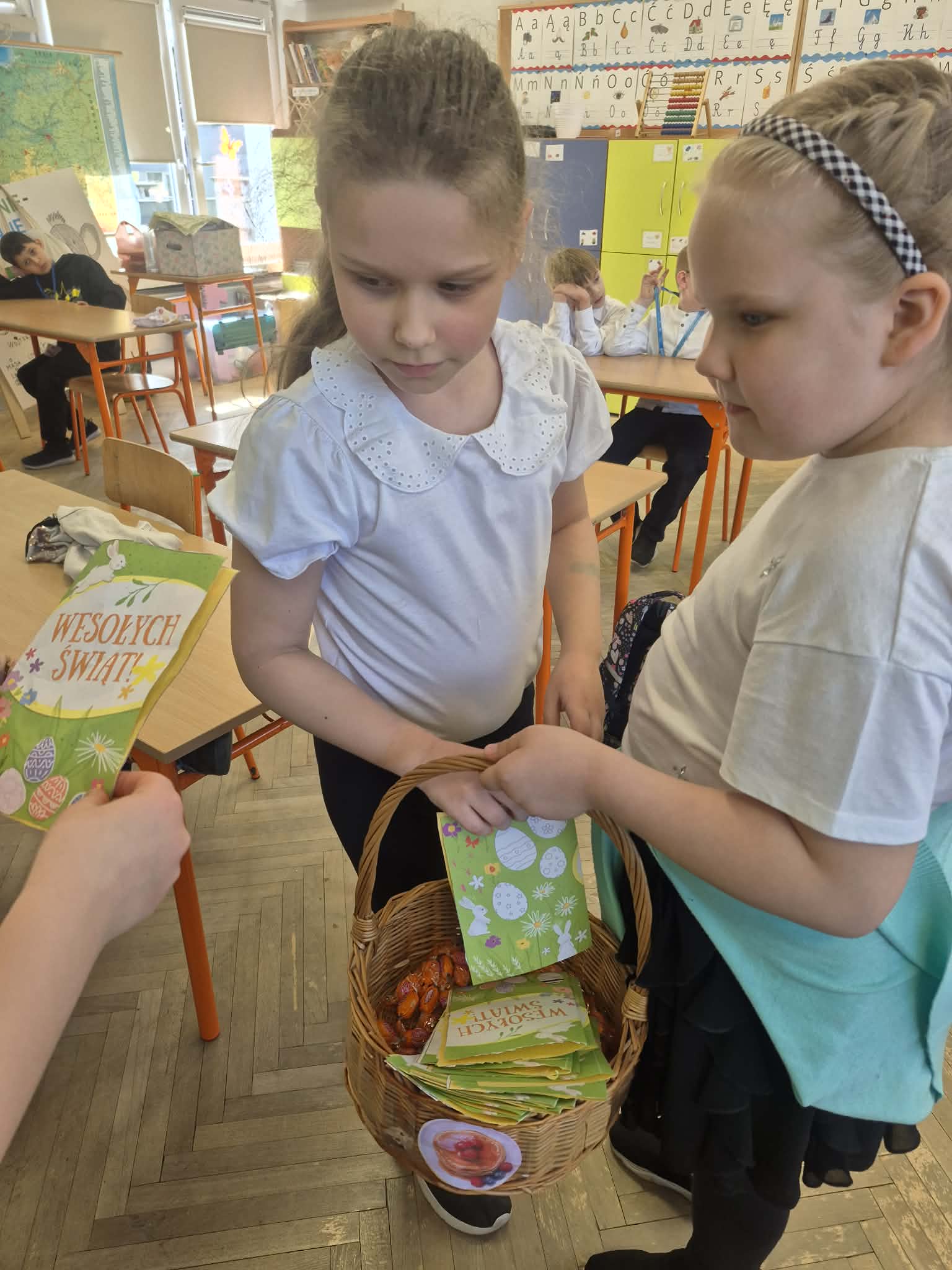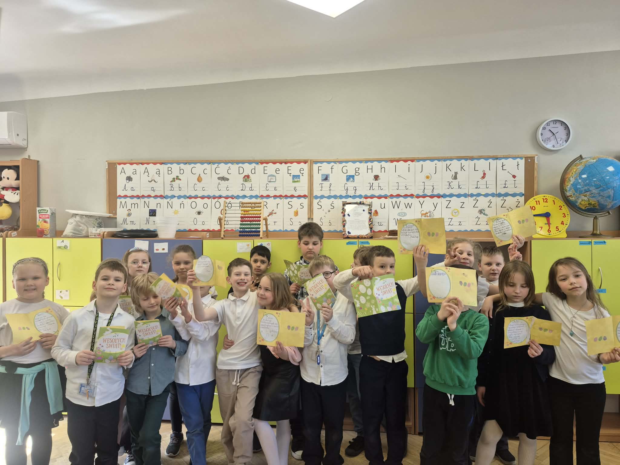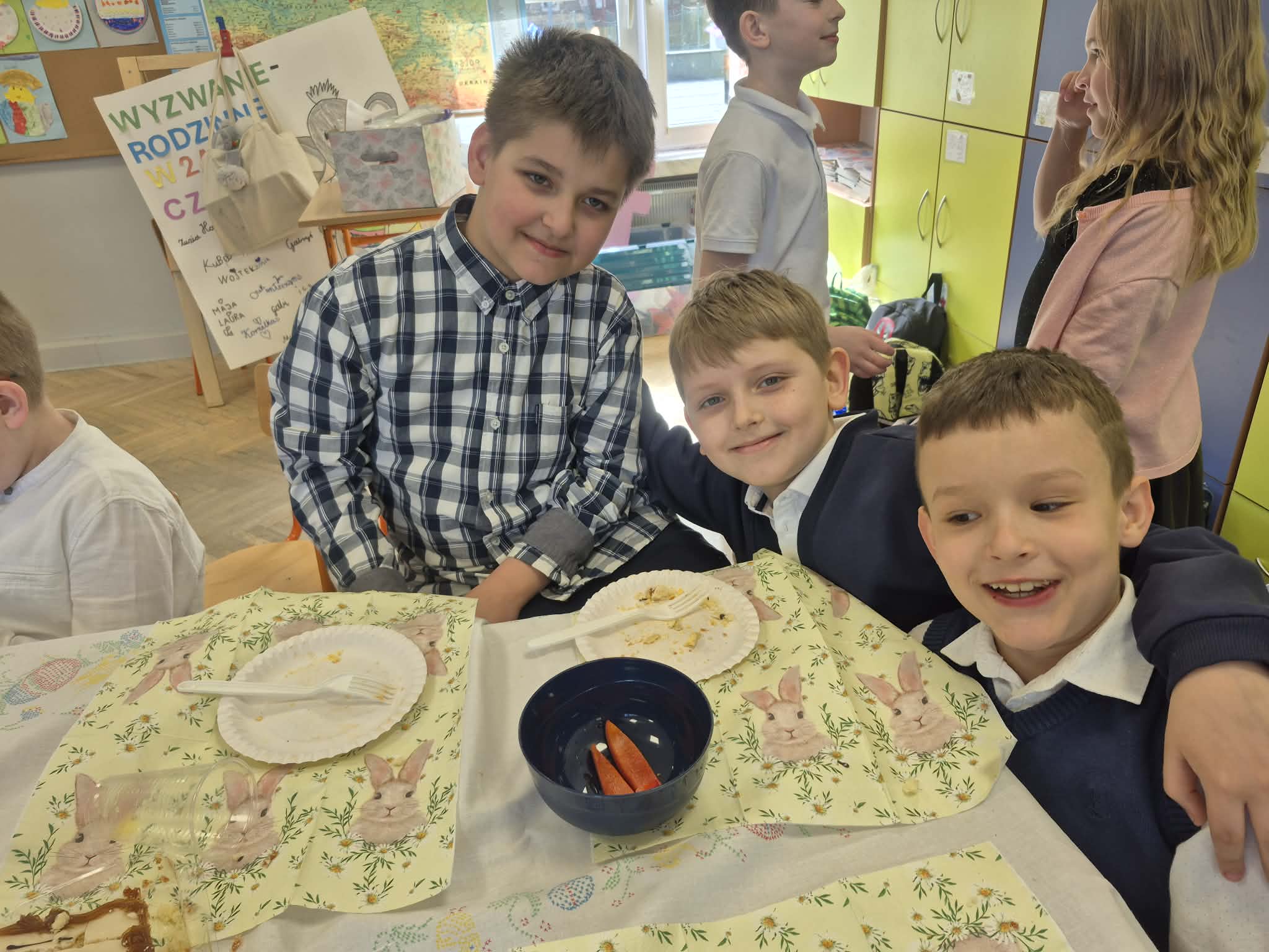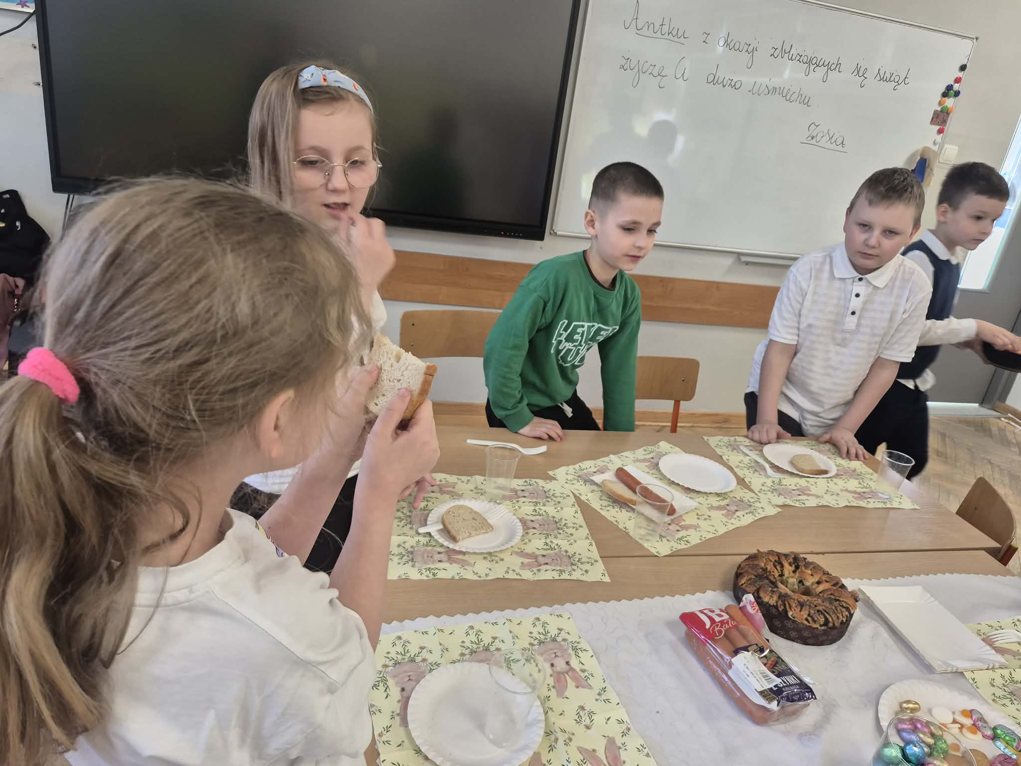 Dziś w klasie 2a odbyło się tradycyjne świąteczne śniadanie. Uczniowie z wielkim zaangażowaniem przygotowywali świąteczny stół. Zaczęli od nakrycia białymi obrusami, ustawienia naczyń i dekoracji oraz rozstawienia przygotowanych przez rodziców przysmaków. Po wysłuchaniu informacji o tradycjach związanych z nadchodzącymi świętami i złożeniu życzeń rozpoczęliśmy wspólnie biesiadowanie. Nie zabrakło tradycyjnego jaka, pysznej kiełbaski, smakowitych bab i mazurków. Dbaliśmy o dobrą , rodzinną atmosferę. Wiele radości sprawiła dzieciom również wielkanocna poczta. Wszyscy obdarowali się wzajemnie przygotowanymi wielkanocnymi kartkami z życzeniami. To był piękny dzień.