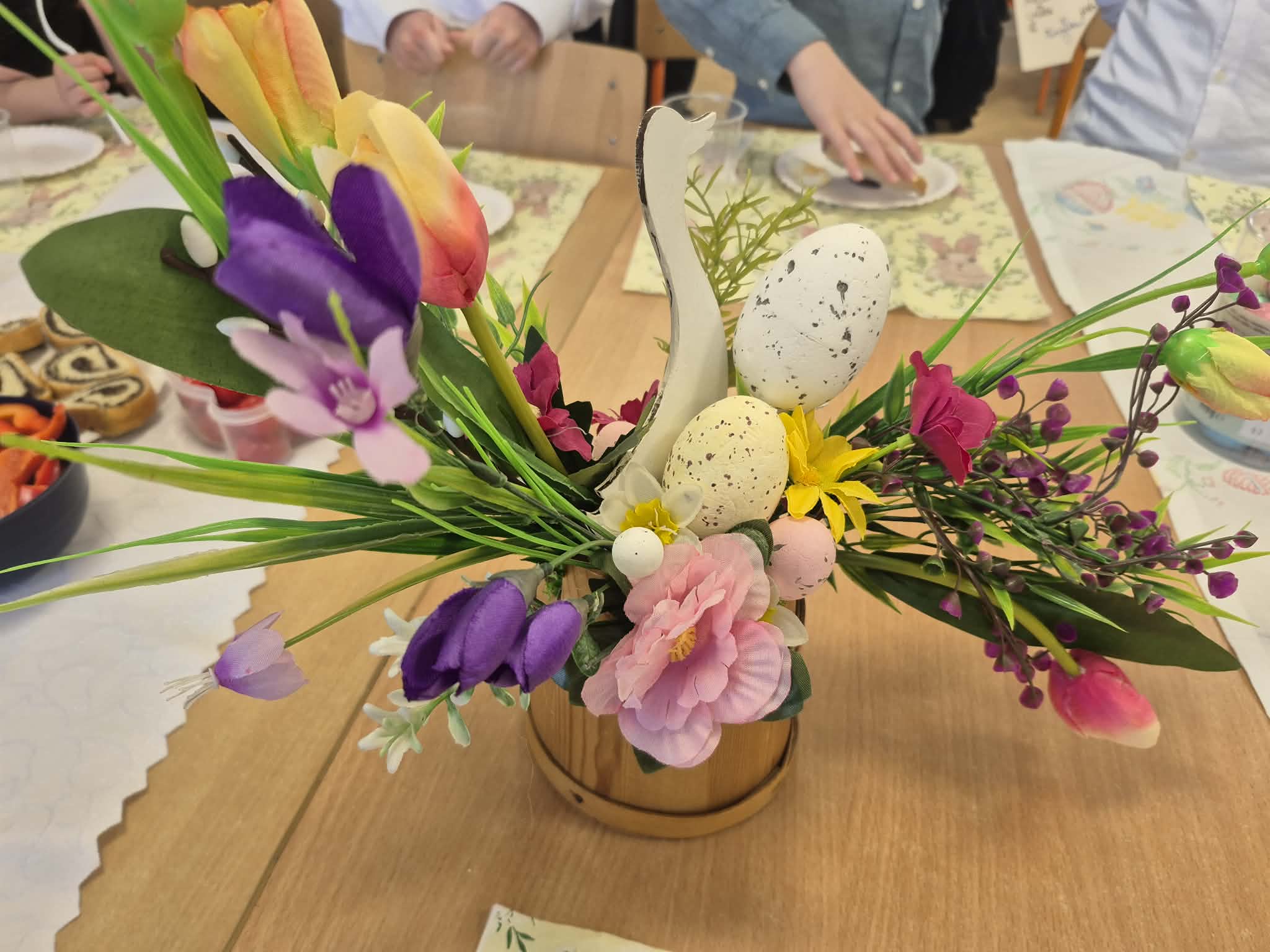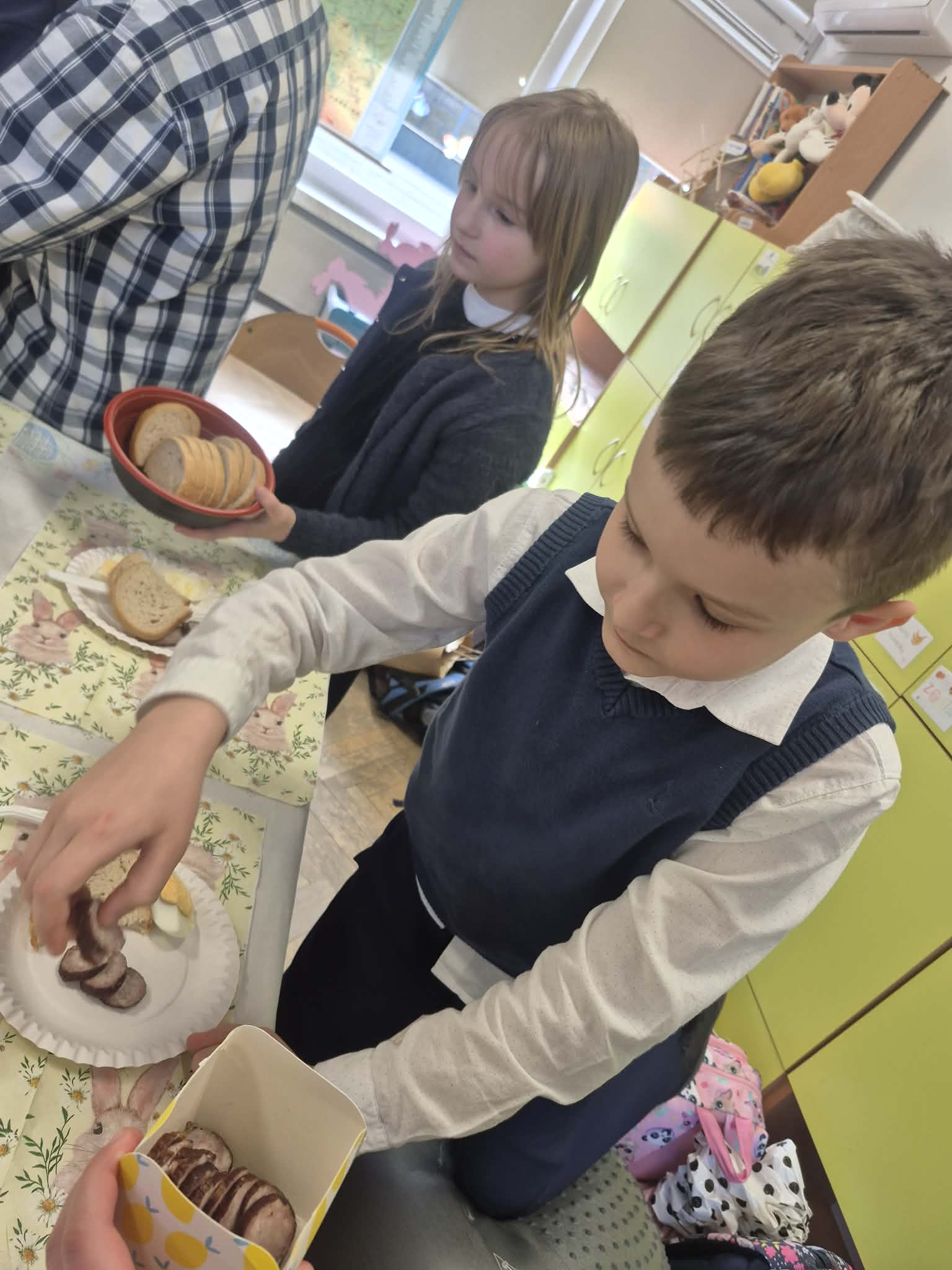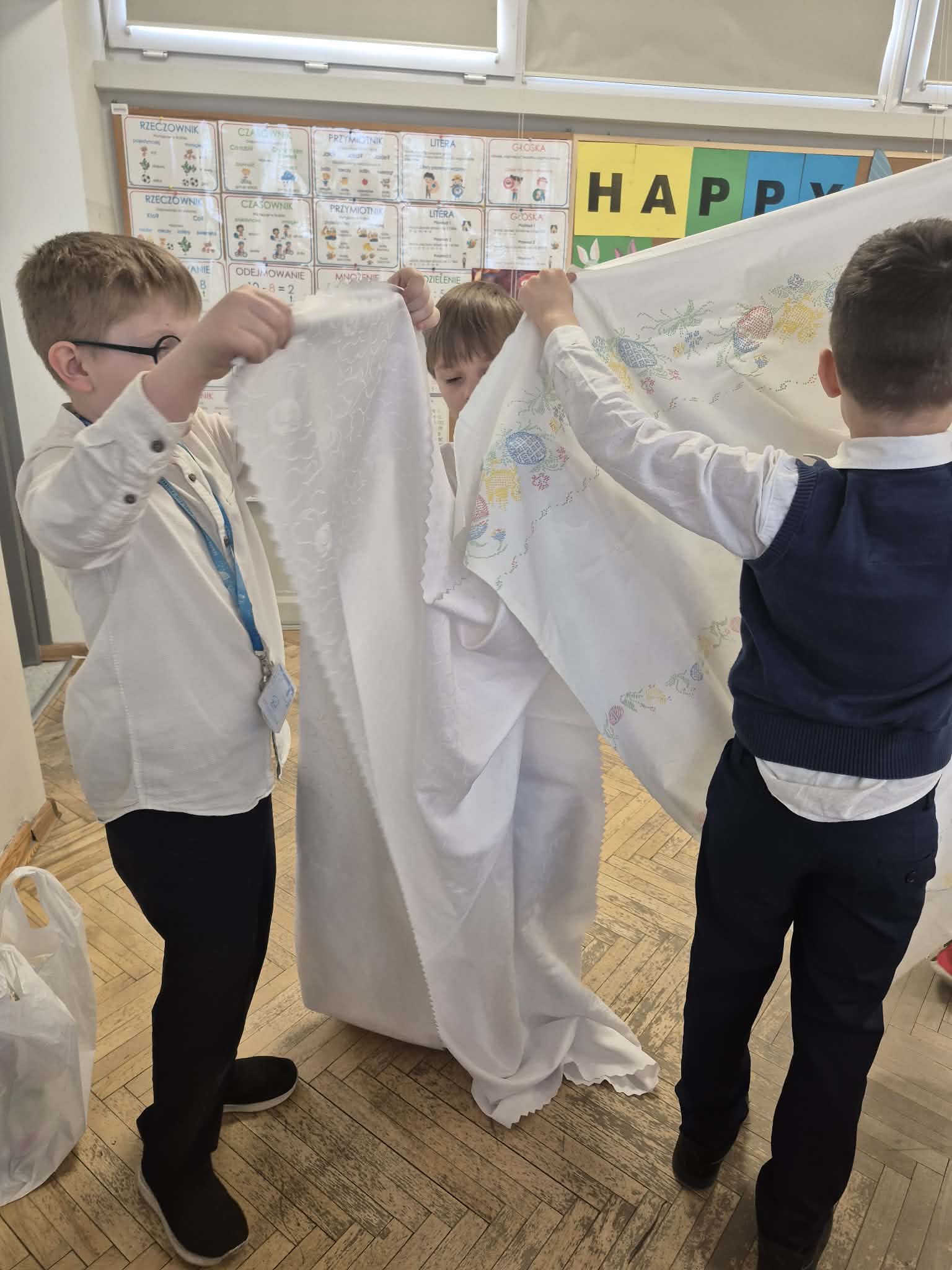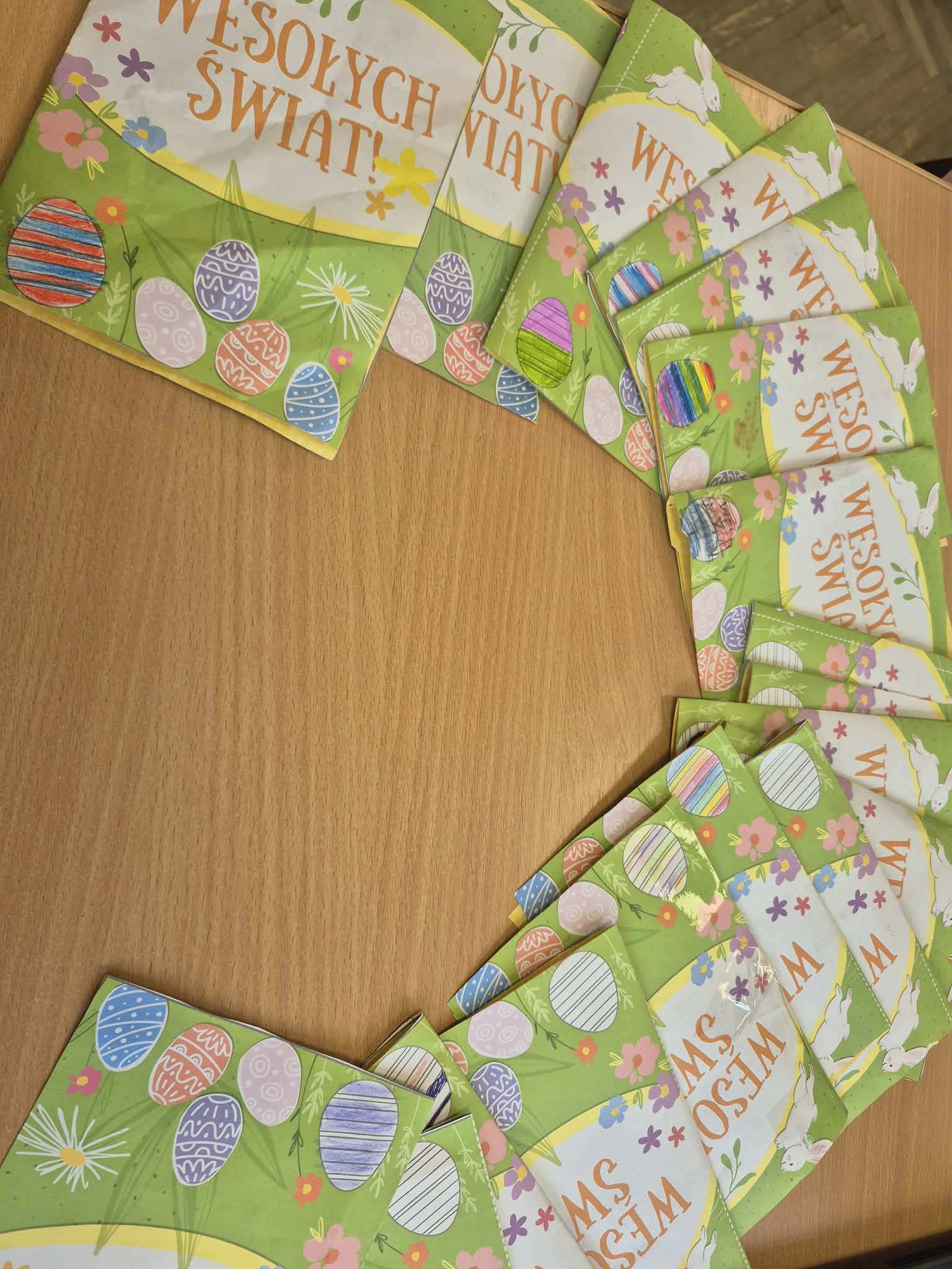 Dziś w klasie 2a odbyło się tradycyjne świąteczne śniadanie. Uczniowie z wielkim zaangażowaniem przygotowywali świąteczny stół. Zaczęli od nakrycia białymi obrusami, ustawienia naczyń i dekoracji oraz rozstawienia przygotowanych przez rodziców przysmaków. Po wysłuchaniu informacji o tradycjach związanych z nadchodzącymi świętami i złożeniu życzeń rozpoczęliśmy wspólnie biesiadowanie. Nie zabrakło tradycyjnego jaka, pysznej kiełbaski, smakowitych bab i mazurków. Dbaliśmy o dobrą , rodzinną atmosferę. Wiele radości sprawiła dzieciom również wielkanocna poczta. Wszyscy obdarowali się wzajemnie przygotowanymi wielkanocnymi kartkami z życzeniami. To był piękny dzień.