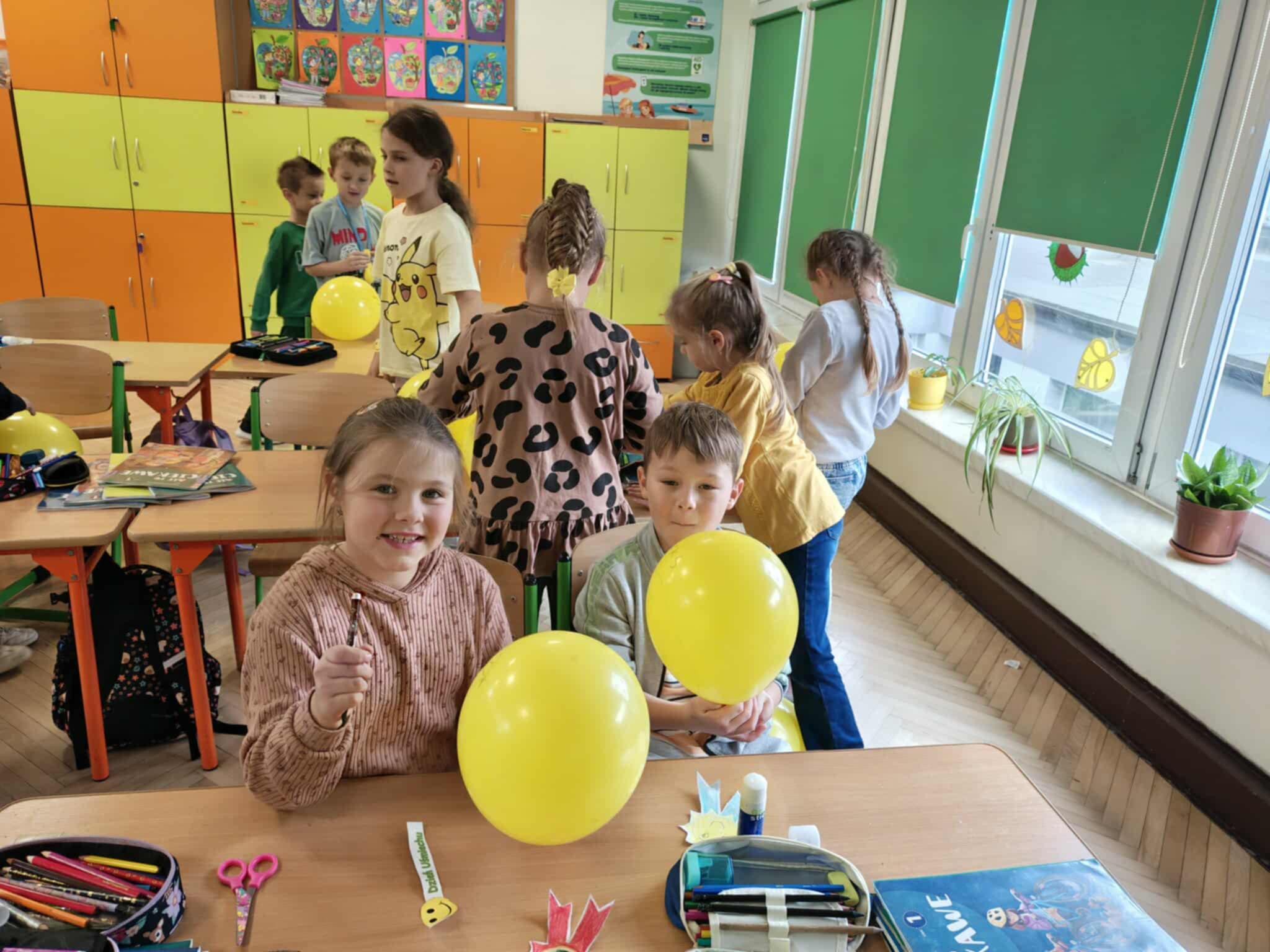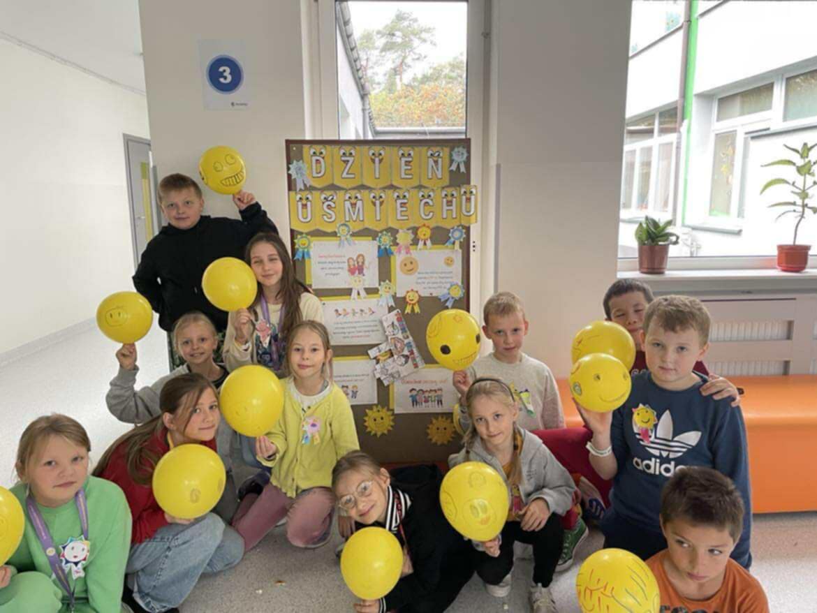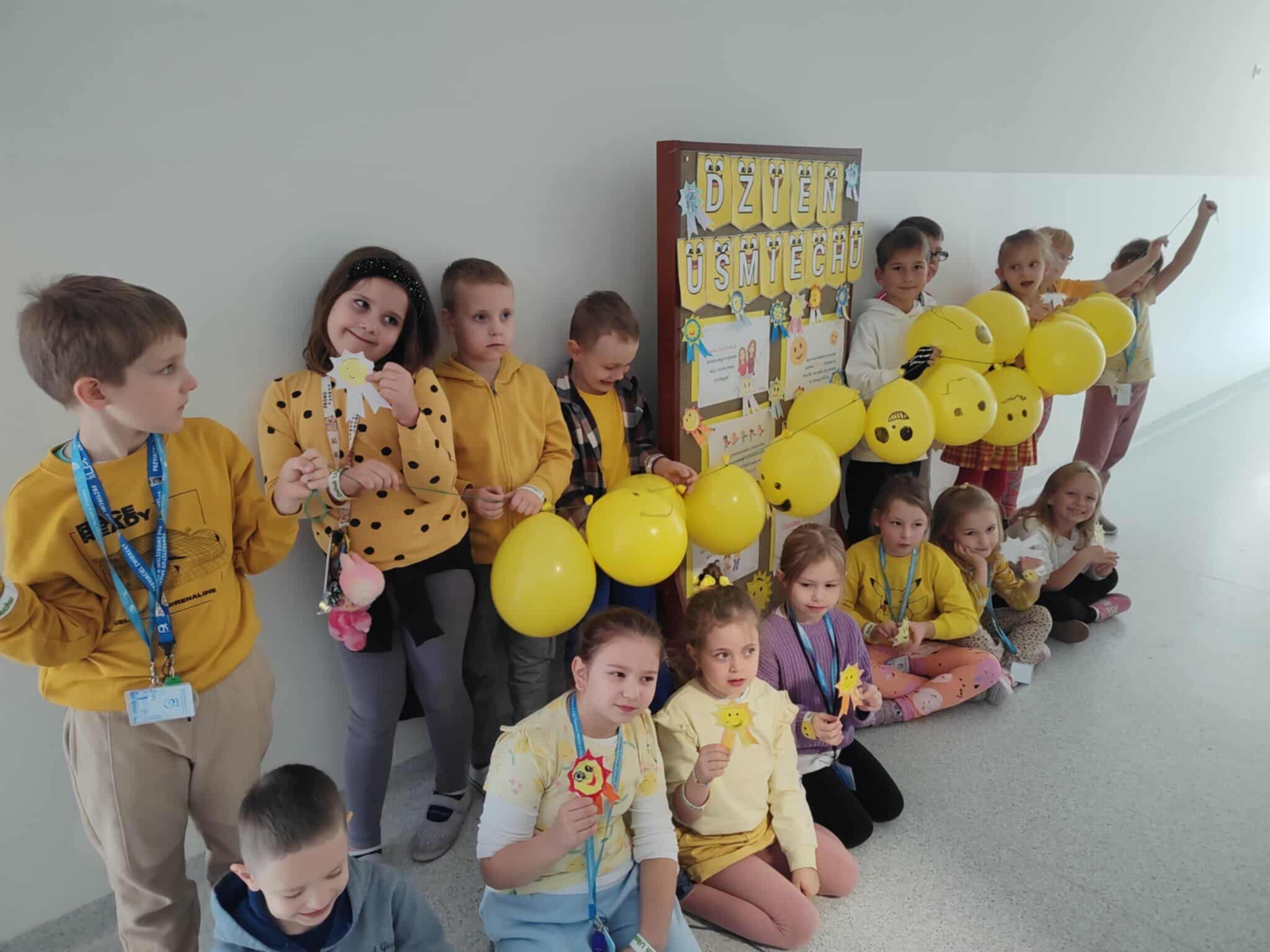 z tak przygotowanych balonów powstała girlanda, która zawisła w szkolnym korytarzu, wprowadzając wszystkich w pogodny nastrój już od wejścia do budynku. W ramach obchodów Światowego Dnia Uśmiechu uczniowie wzięli udział w różnych aktywnościach: