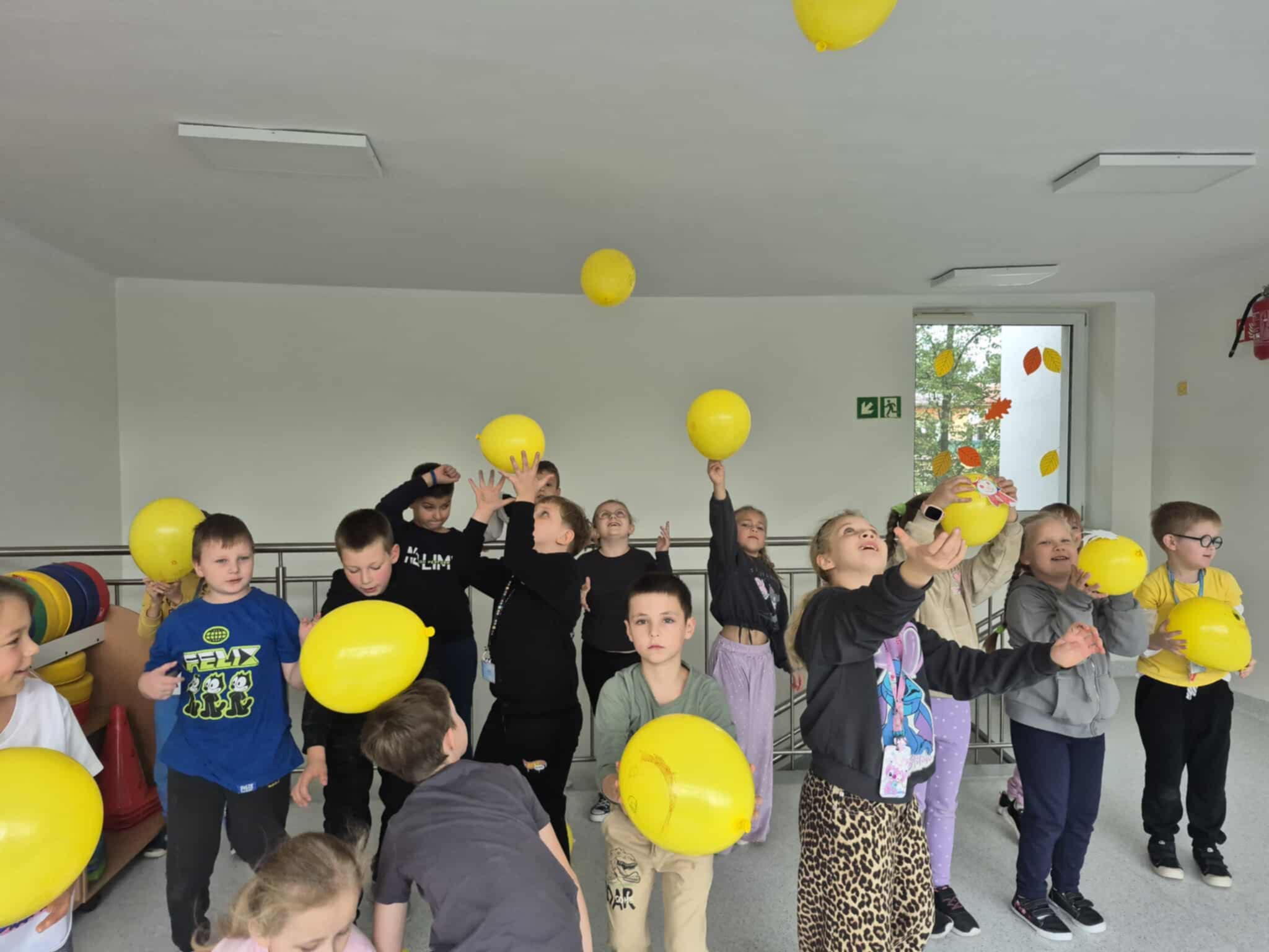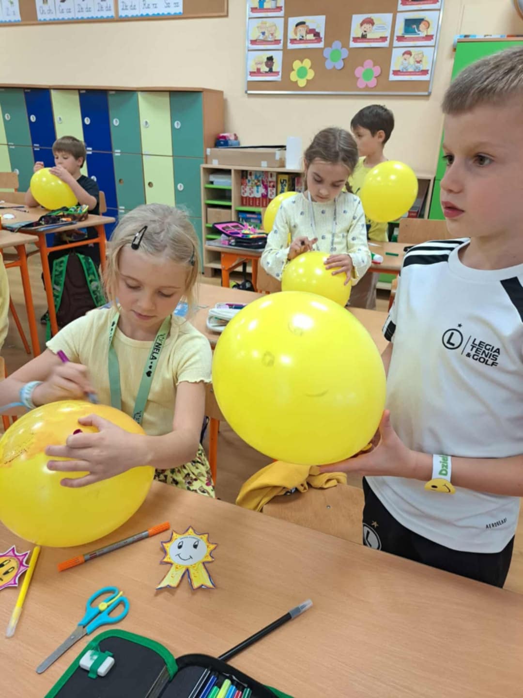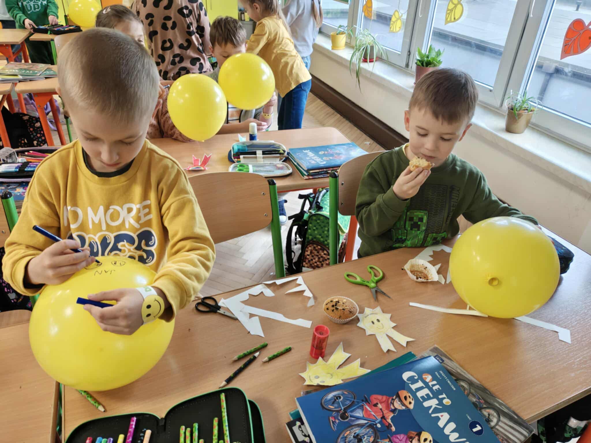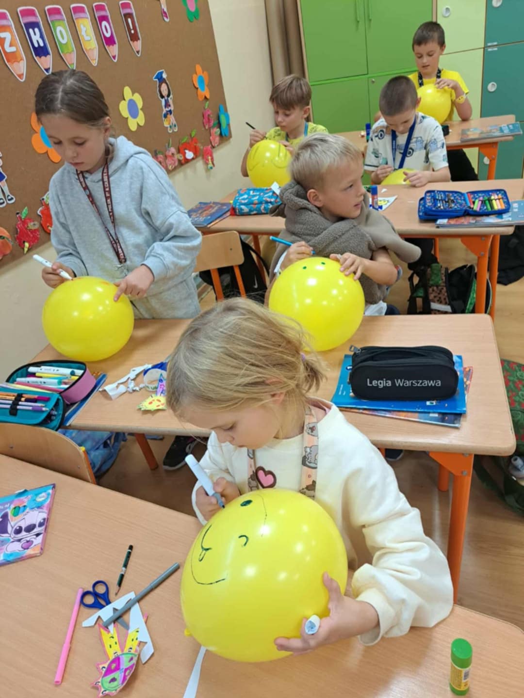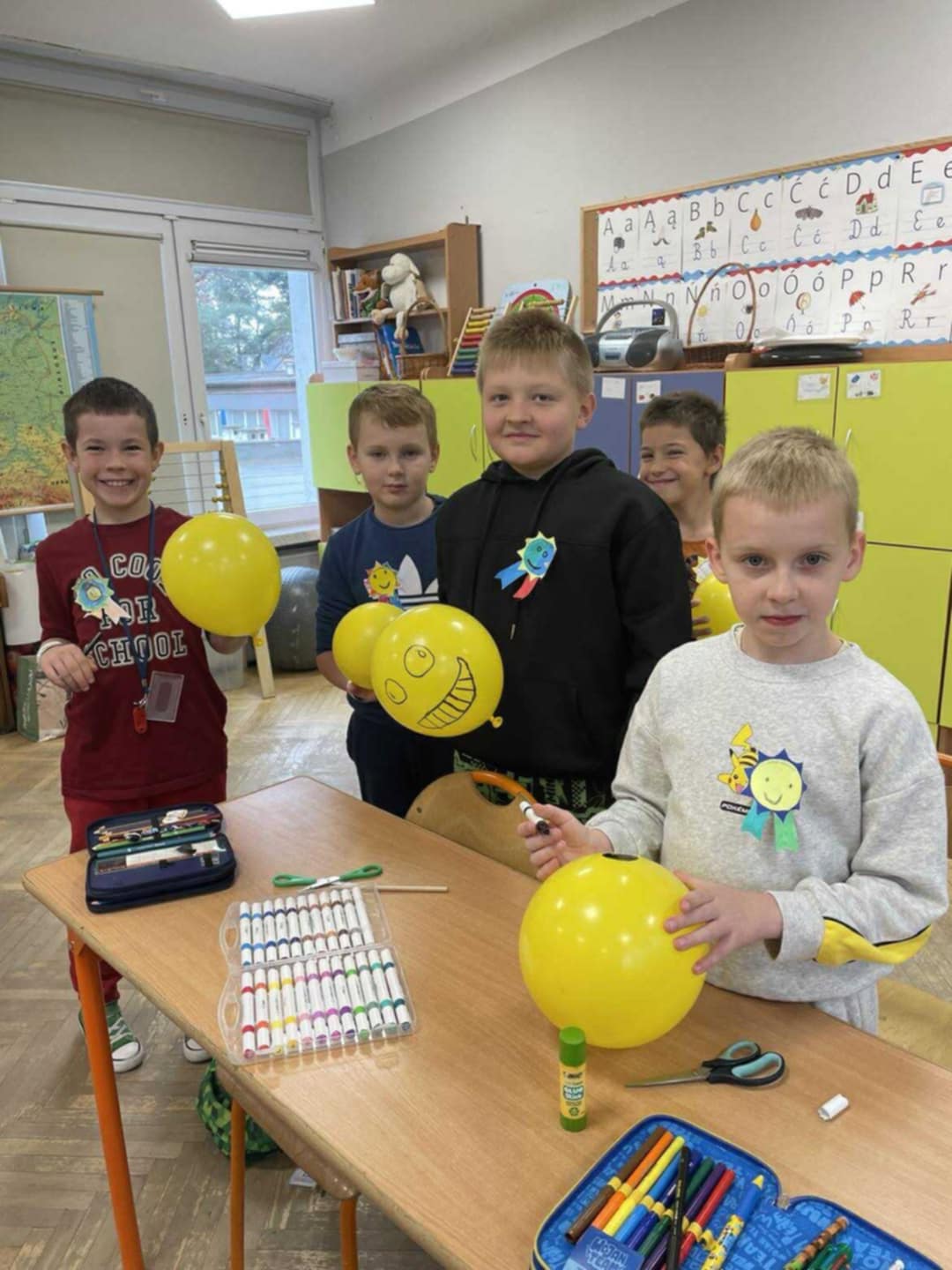 Na korytarzach pojawiły się kolorowe dekoracje przygotowane przez uczniów i nauczycieli. Jedną z atrakcji było ozdabianie żółtych balonów, dzieci rysowały na nich radosne,uśmiechnięte buzie![]()
