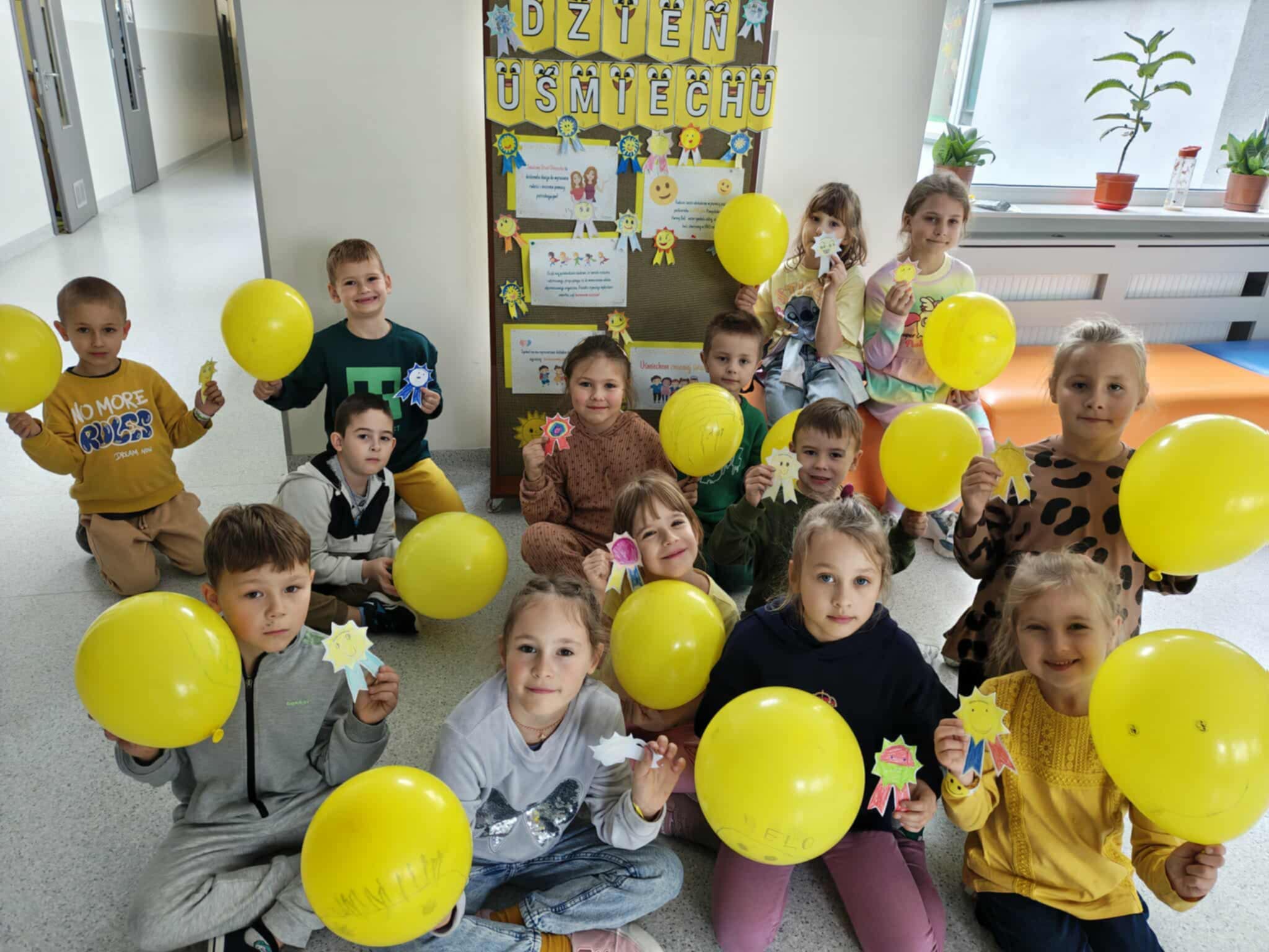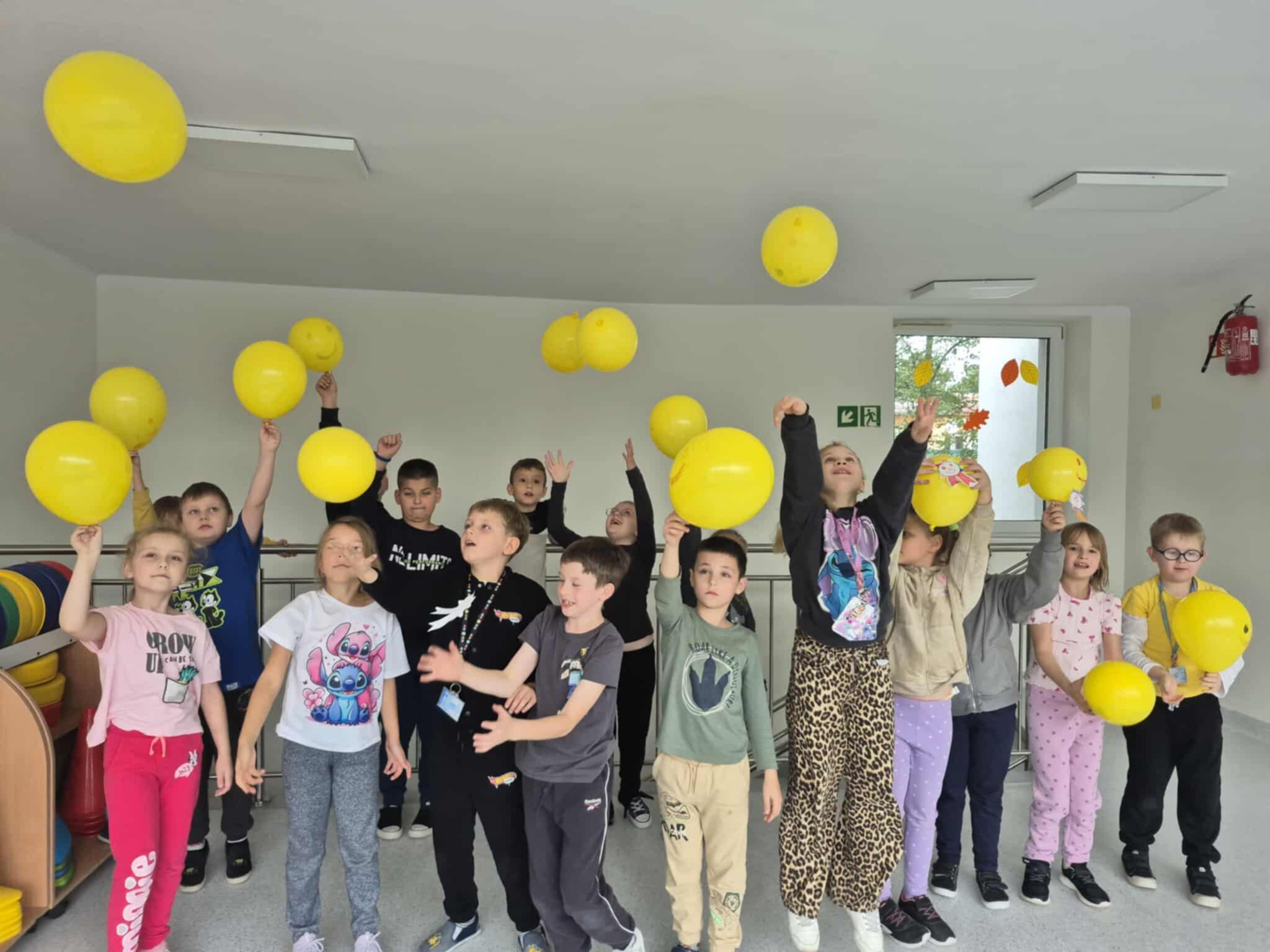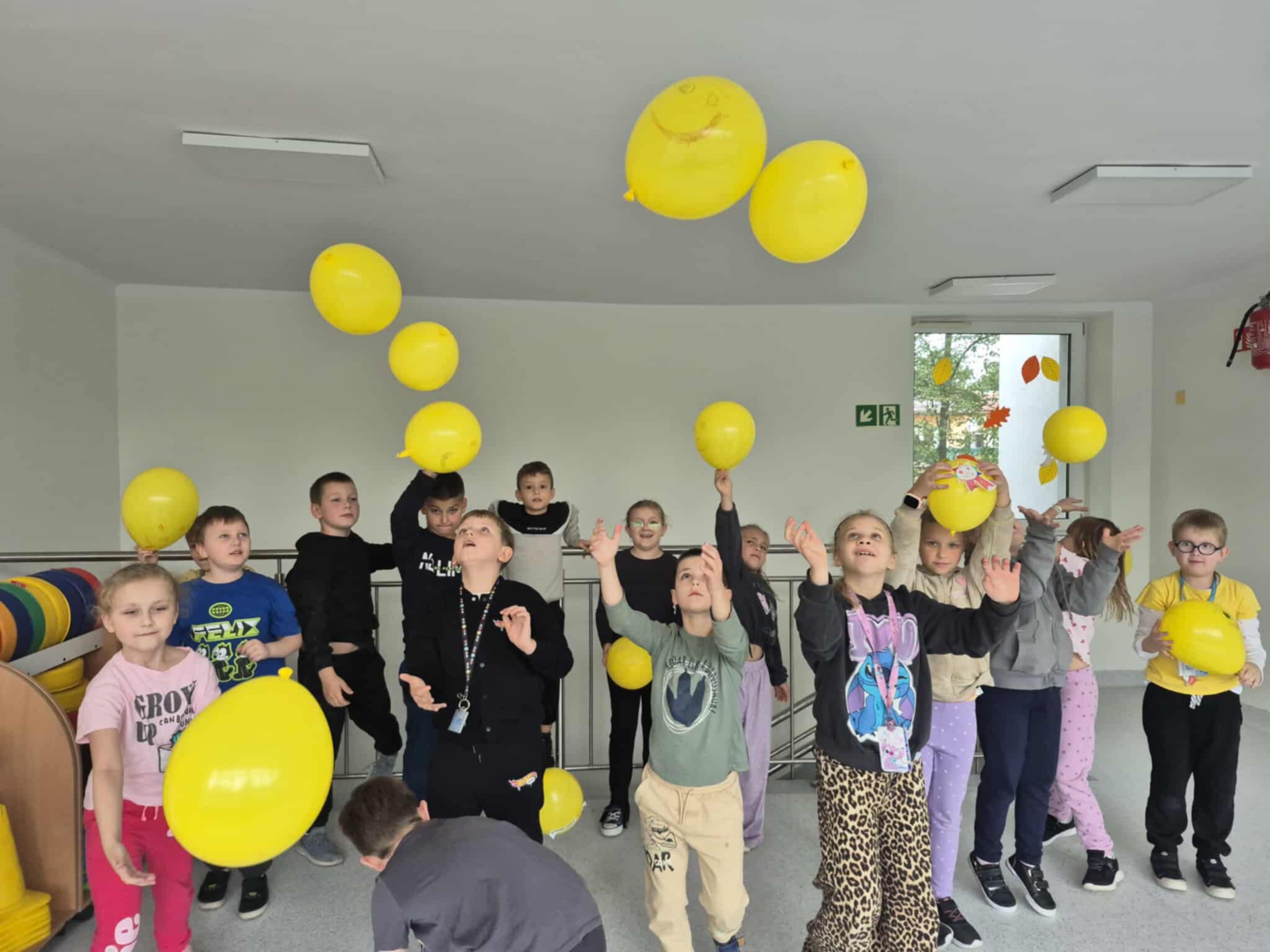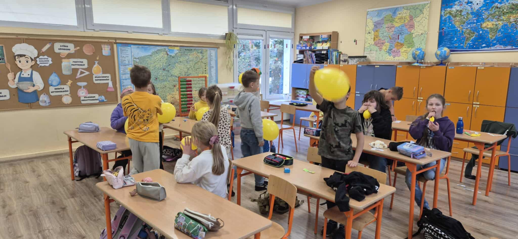 Na korytarzach pojawiły się kolorowe dekoracje przygotowane przez uczniów i nauczycieli. Jedną z atrakcji było ozdabianie żółtych balonów, dzieci rysowały na nich radosne,uśmiechnięte buzie![]()