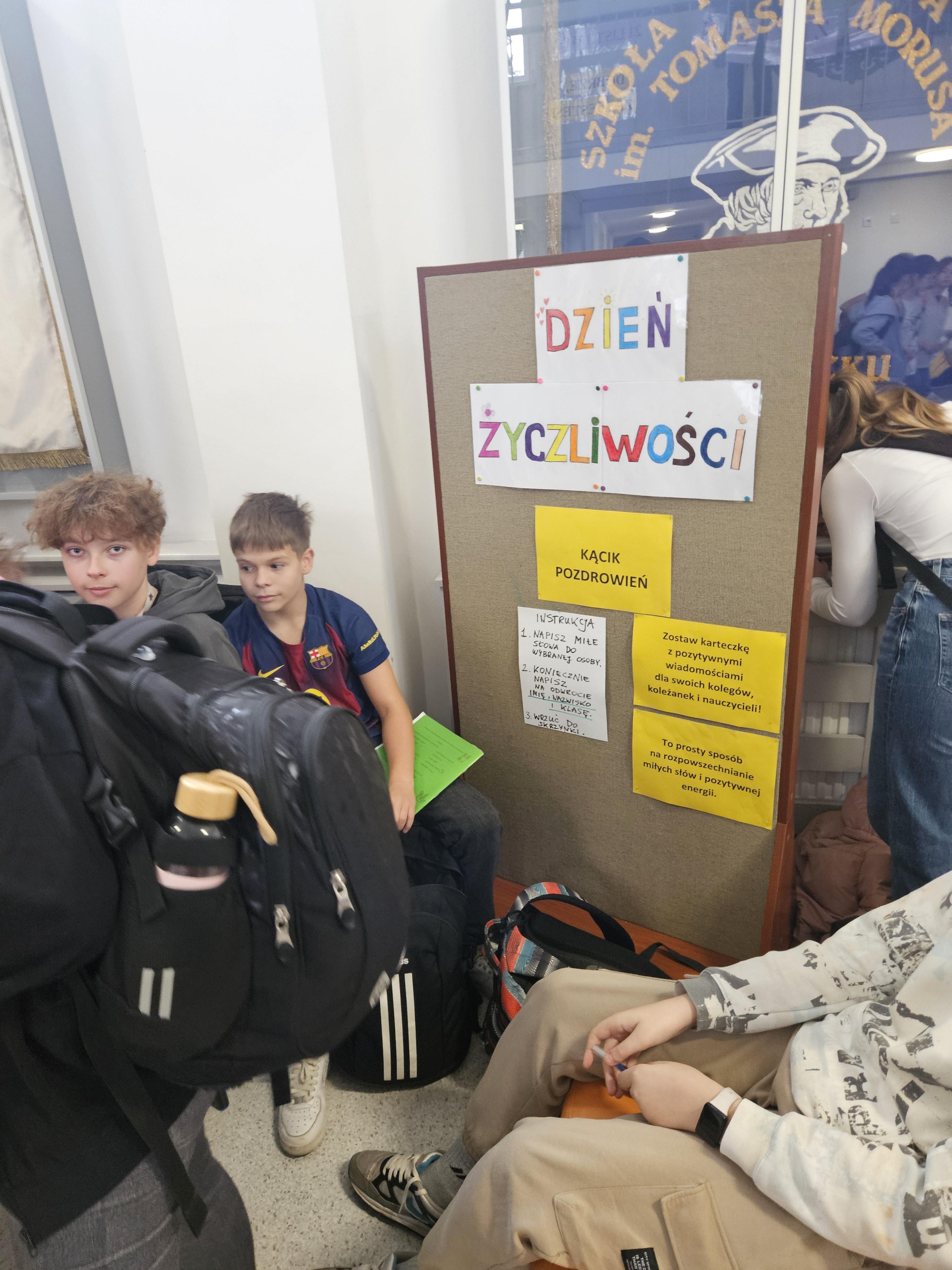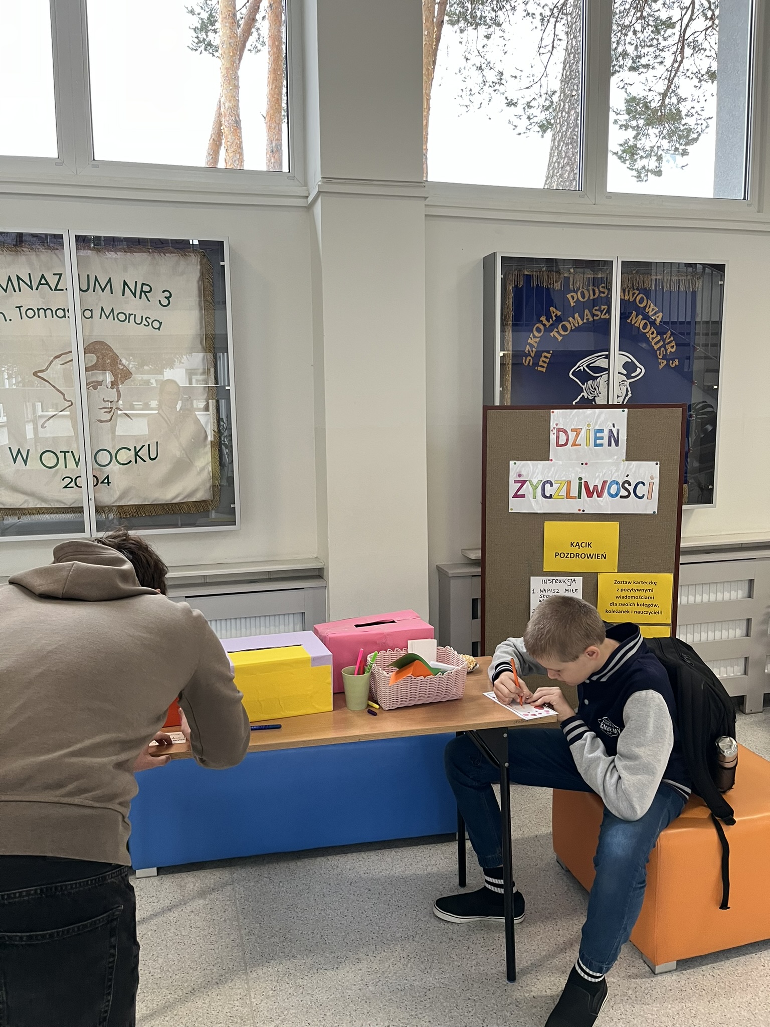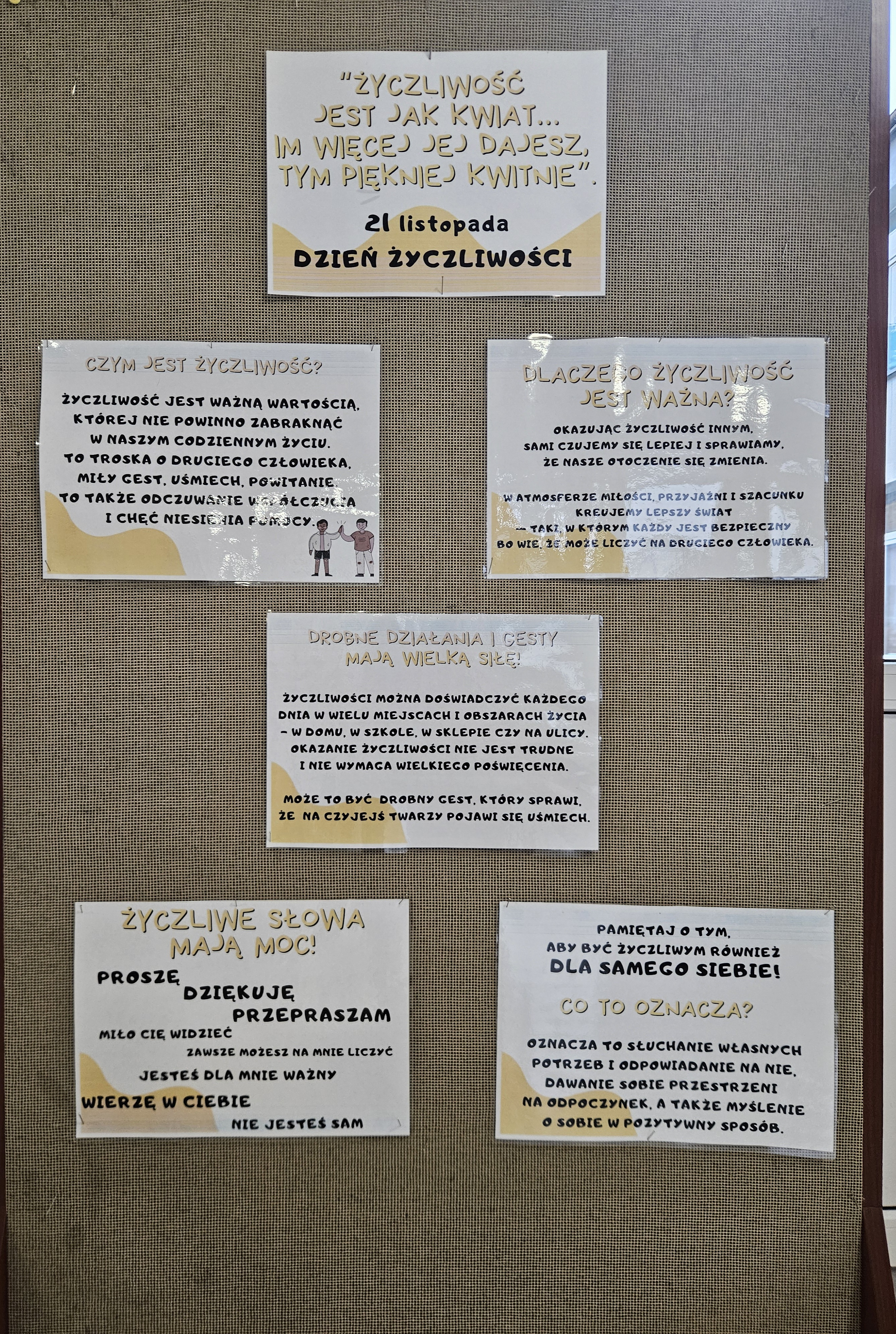 W naszej szkole obchodziliśmy Dzień Życzliwości – święto, które przypomina, jak wielką moc mają dobre słowa i drobne gesty. Uczniowie brali udział w akcji rozdawania karteczek z miłymi wiadomościami, dzięki czemu w szkolnych korytarzach pojawiło się mnóstwo uśmiechów.