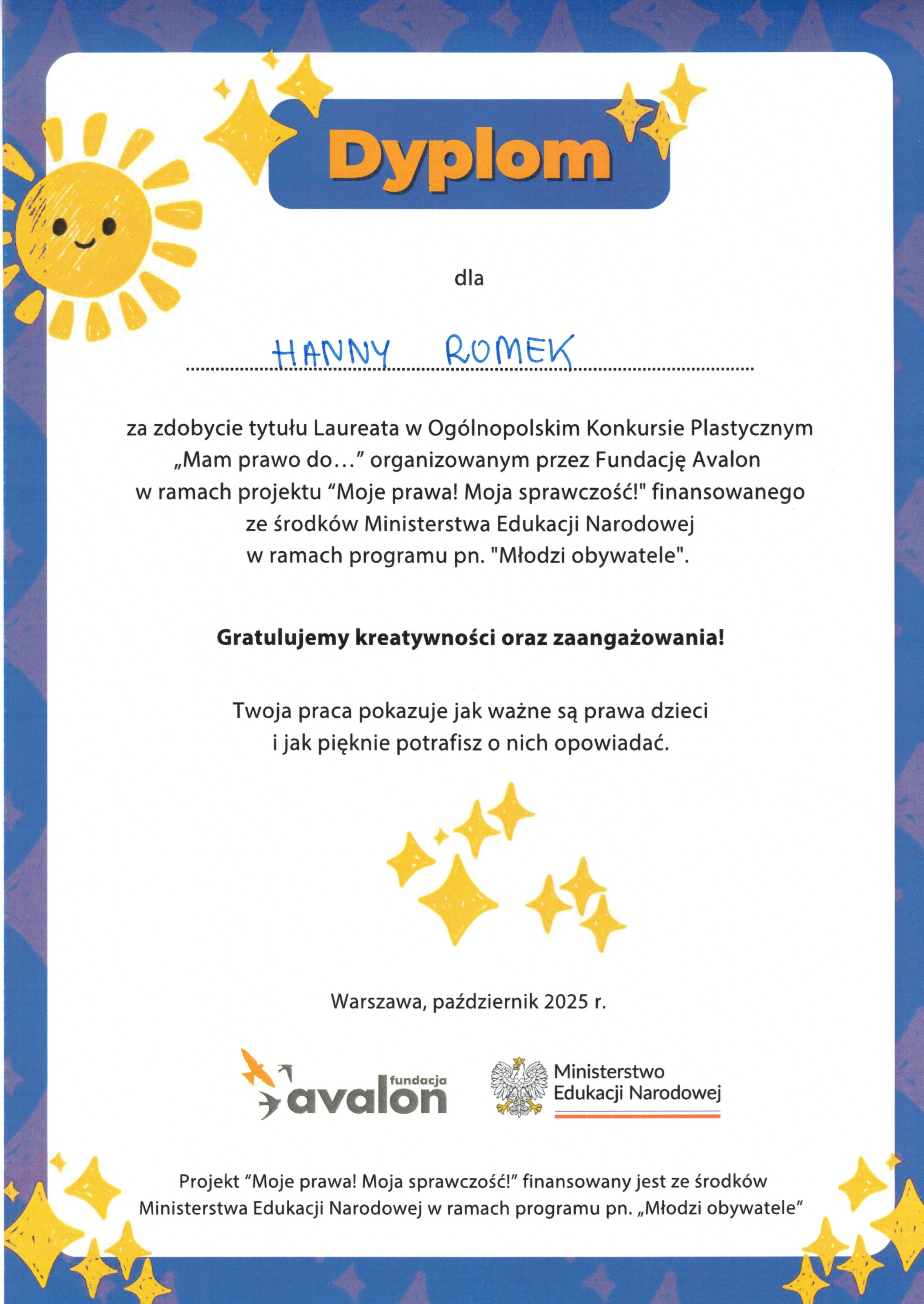 Miło nam poinformować, że Hanna Romek uczennica klasy VII, zdobyła tytuł laureatki w konkursie plastycznym "Mam prawo do...".