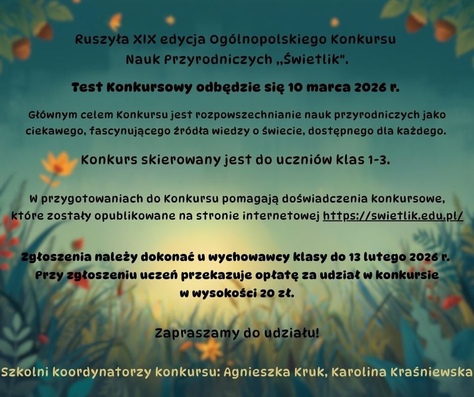 Informacja o Ogólnopolskim Konkursie Nauk Przyrodniczych ''Świetlik''