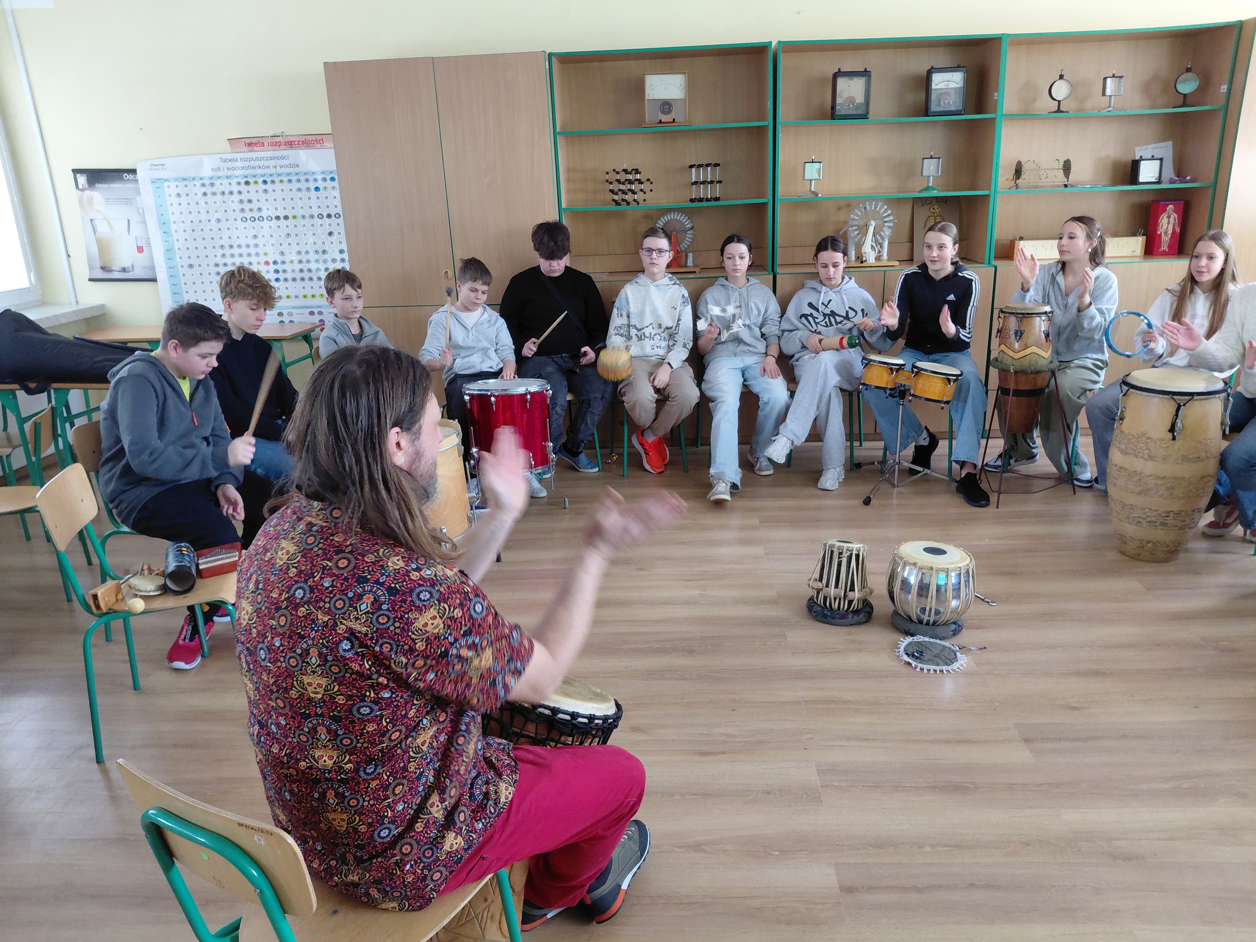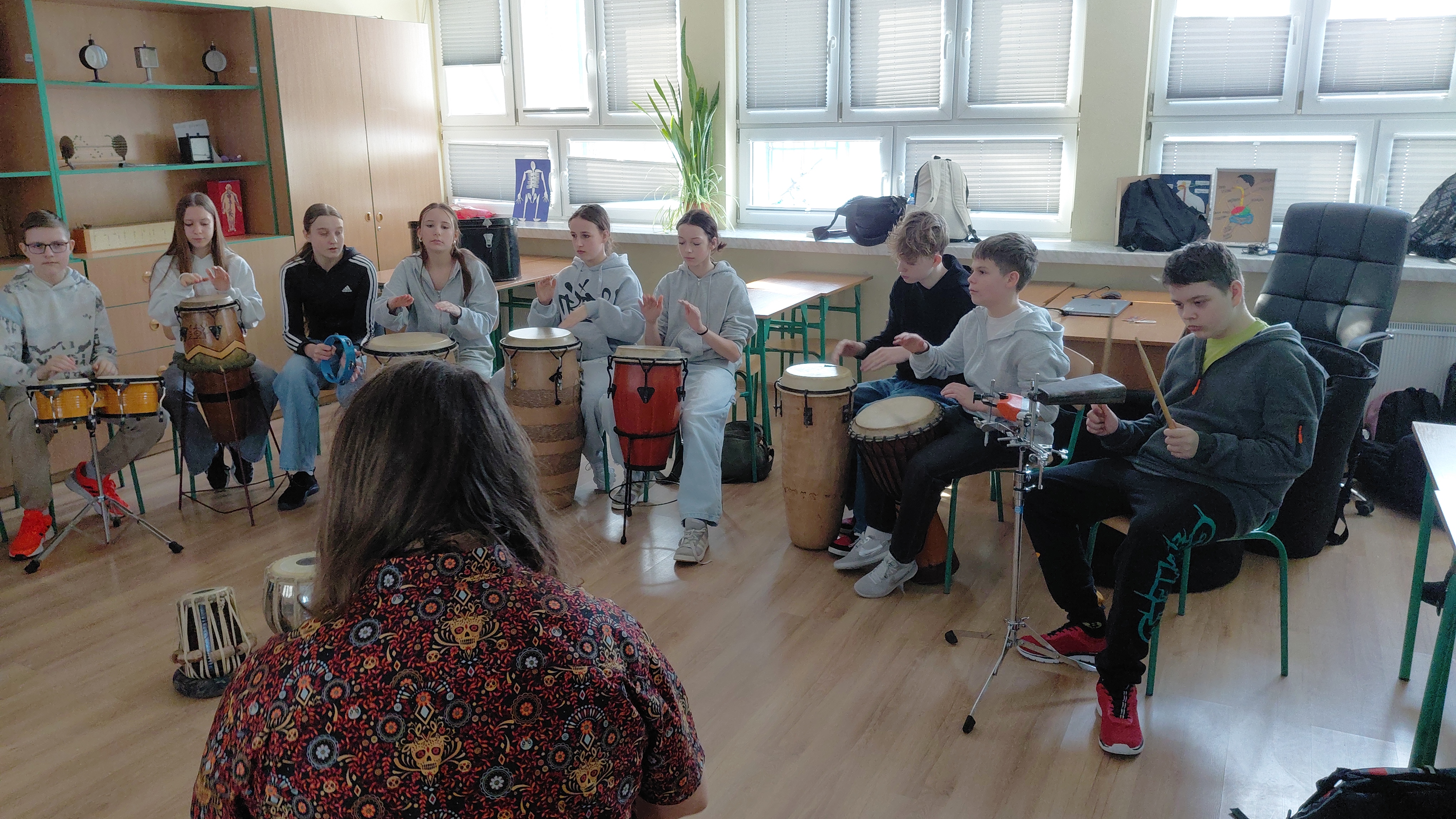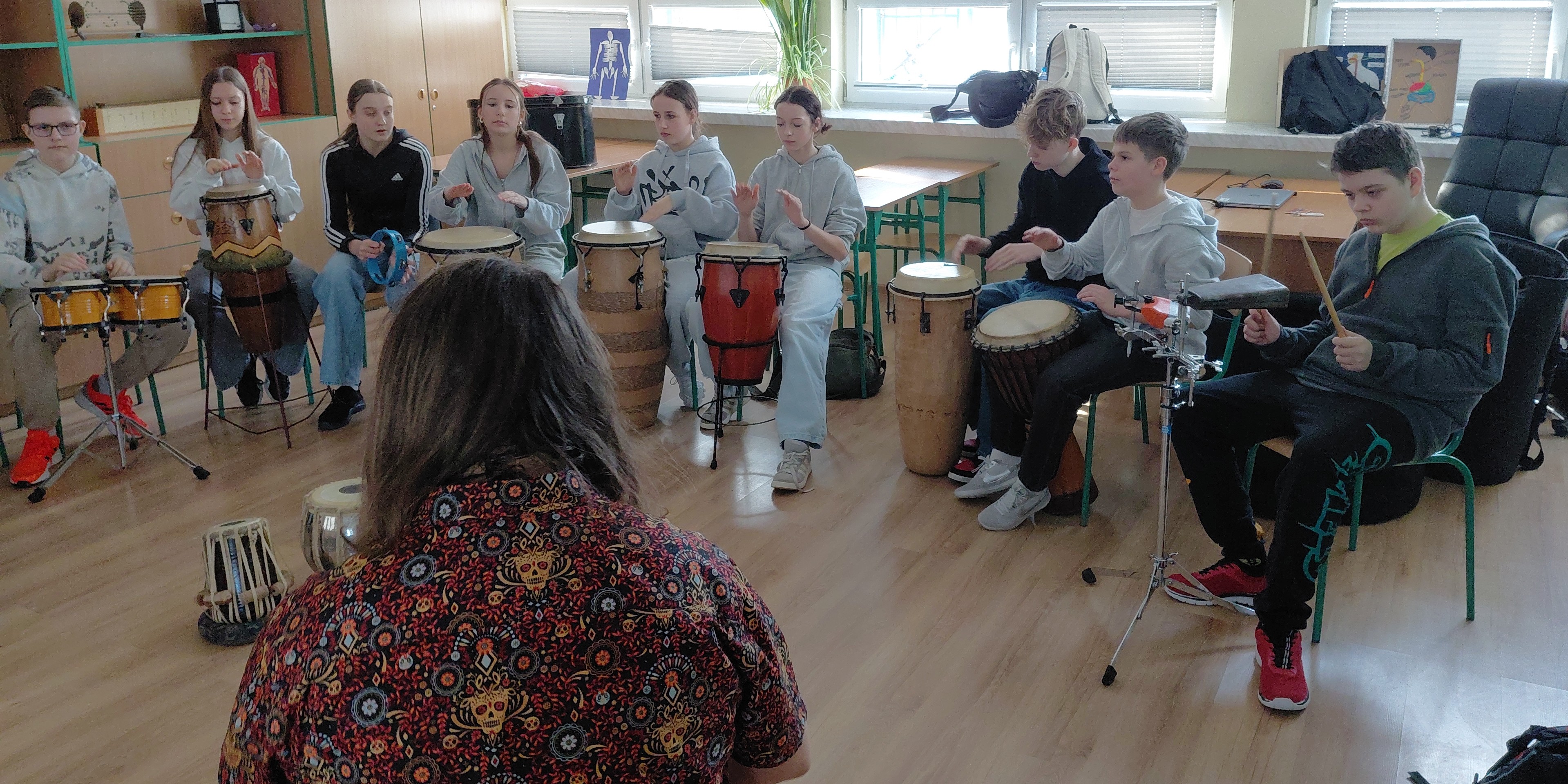 Klasa 7b wzięła dziś udział w warsztatach "Etno Dźwięki" prowadzonych przez Pana Macieja Łabudzkiego. Poznaliśmy instrumenty takie, jak: djembe, conga, bongosy, didgerodoo, kalimba, czurynga, drumla, okaryna, hangdrum, a go go, shekere. Uczniowie poznali historię tych instrumentów i ich pochodzenie. Zagrali na wszystkich, nauczyli się wielu ciekawych rytmów, a na koniec zagrali koncert. Dziękujemy za świetne warsztaty!
