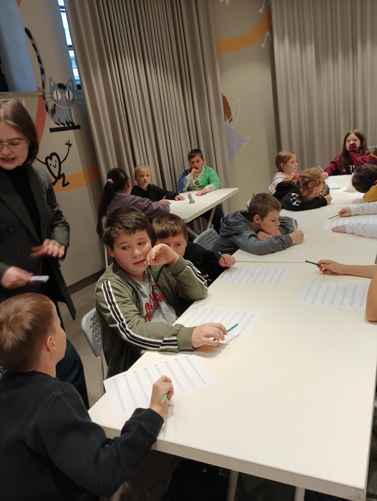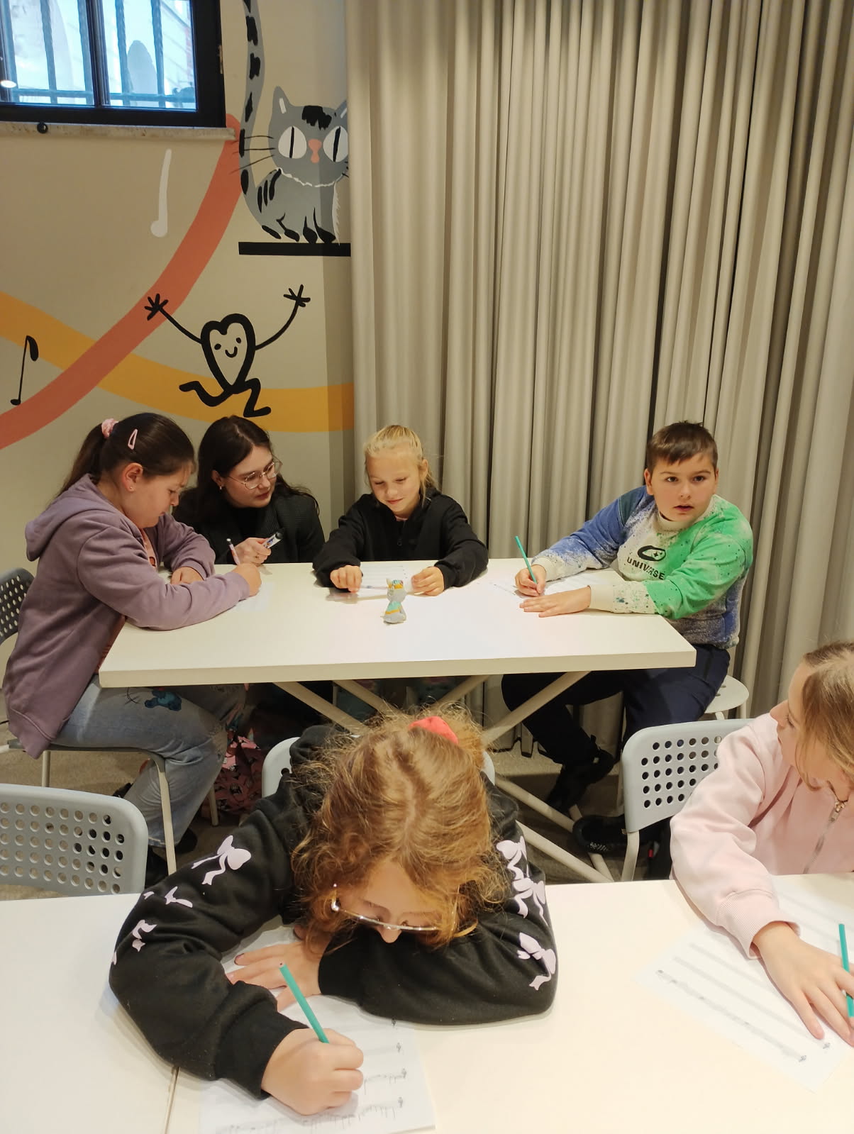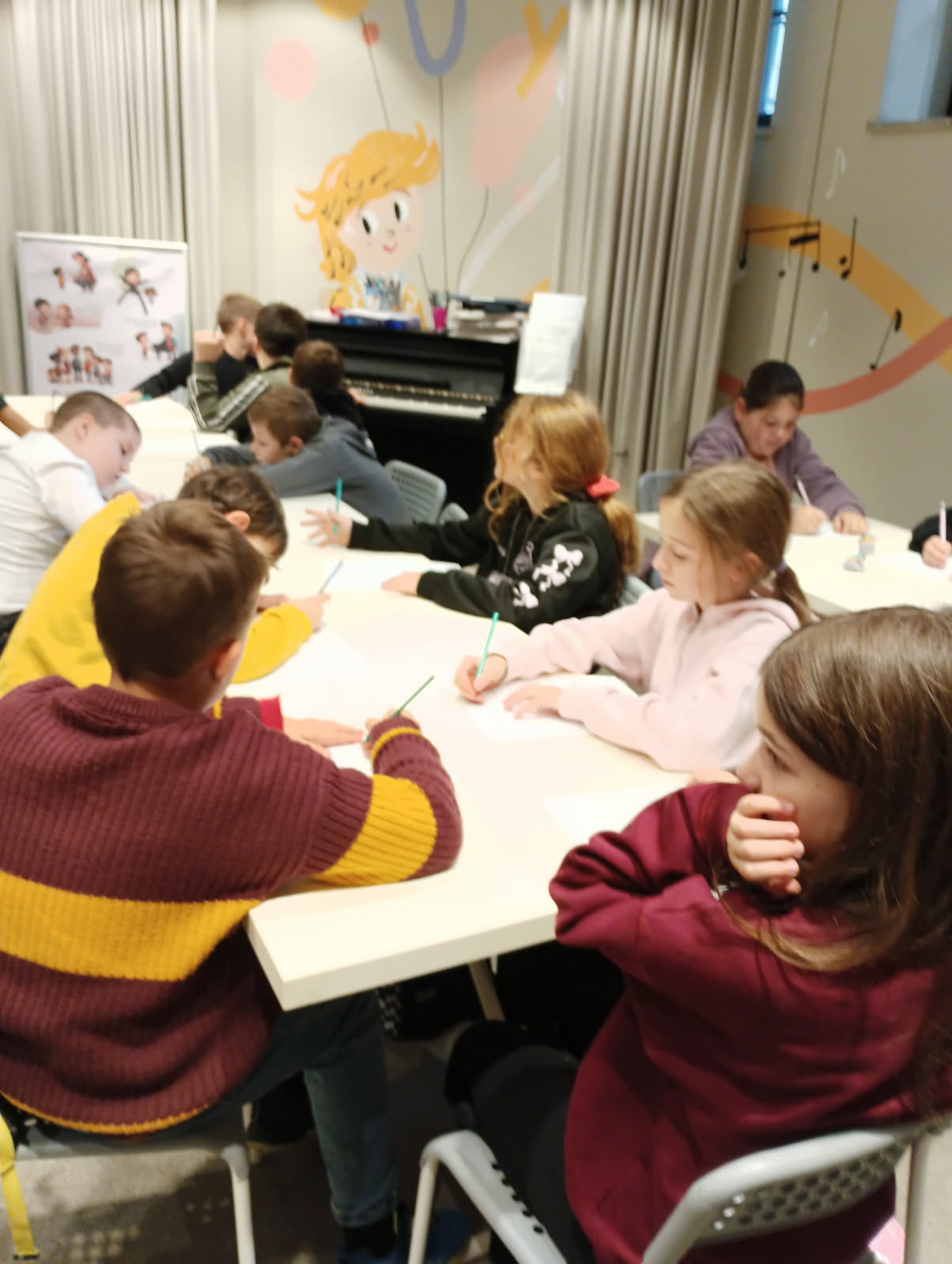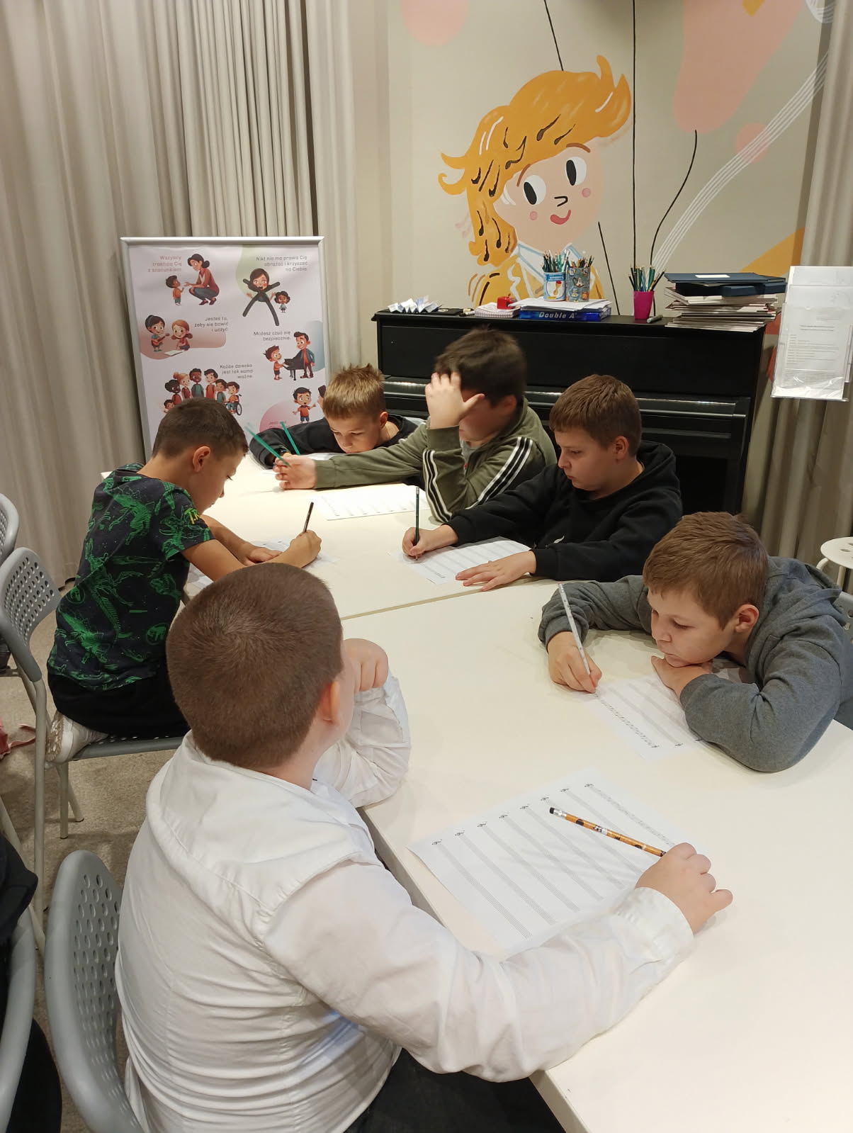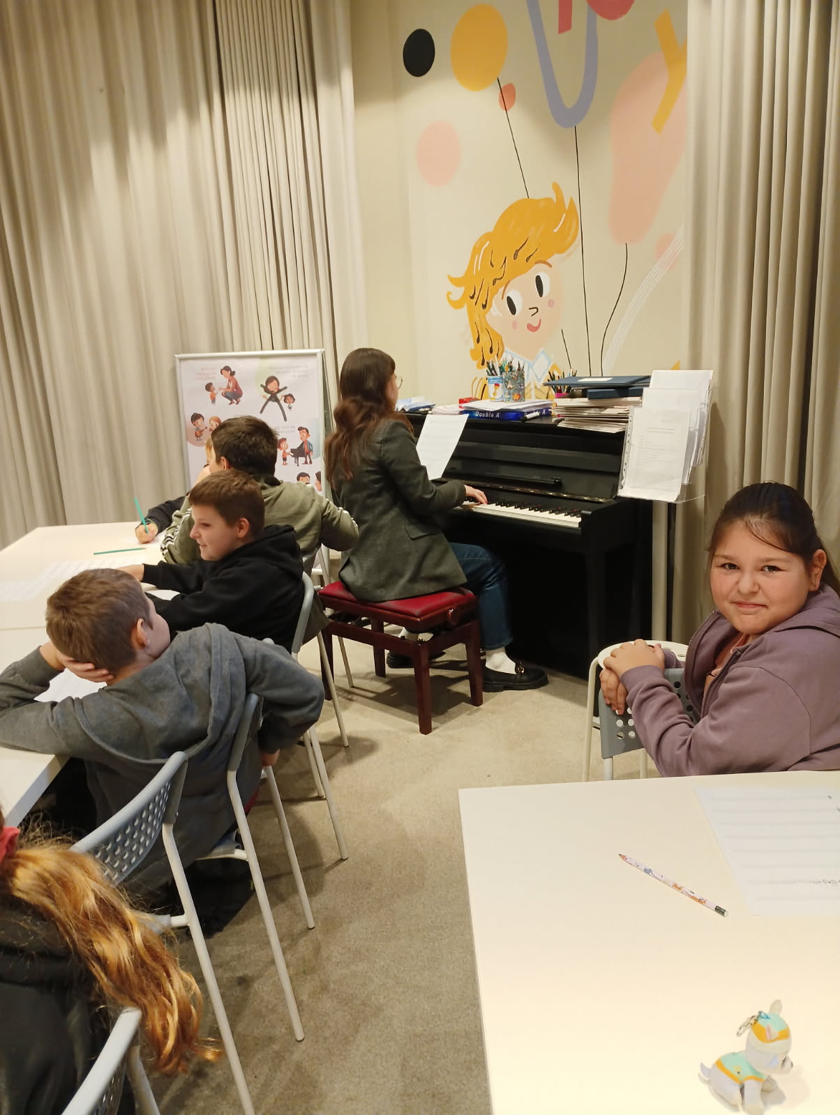 Podczas warsztatów każdy z nas napisał własną kompozycję muzyczną, która została odegrana na żywo przez panią prowadzącą.