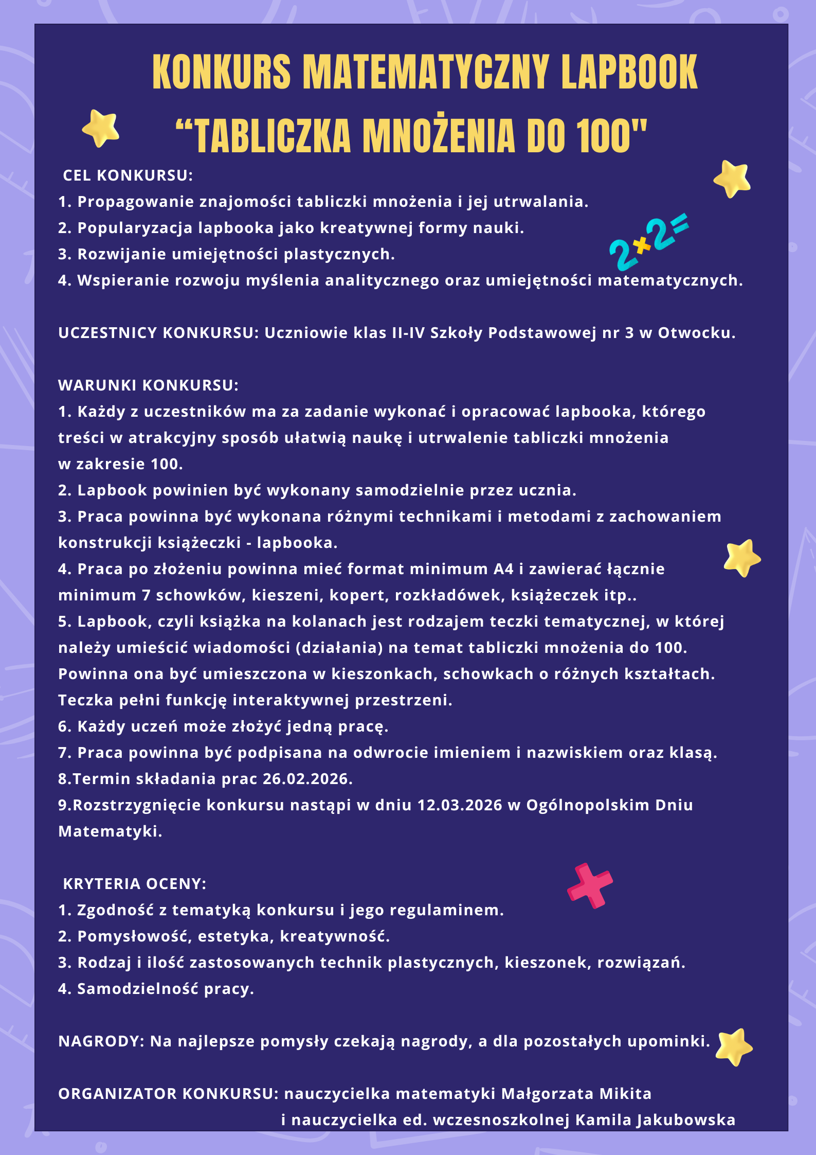 Wykonaj konkursowego lapbooka matematycznego, który w atrakcyjny i kreatywny sposób pomoże Ci w nauce oraz utrwaleniu tabliczki mnożenia. Kolory, rysunki, kieszonki, zagadki – dołącz do zabawy i przekonaj się, że tabliczka mnożenia nie ma przed Tobą tajemnic. Liczy się pomysłowość, estetyka i matematyczna poprawność. Szczegóły konkursu w regulaminie na stronie szkoły.
