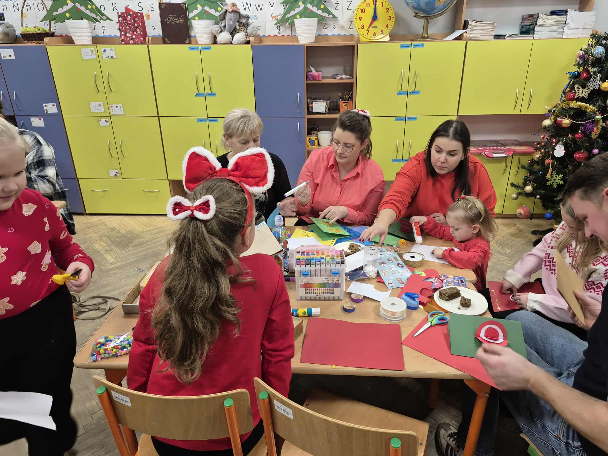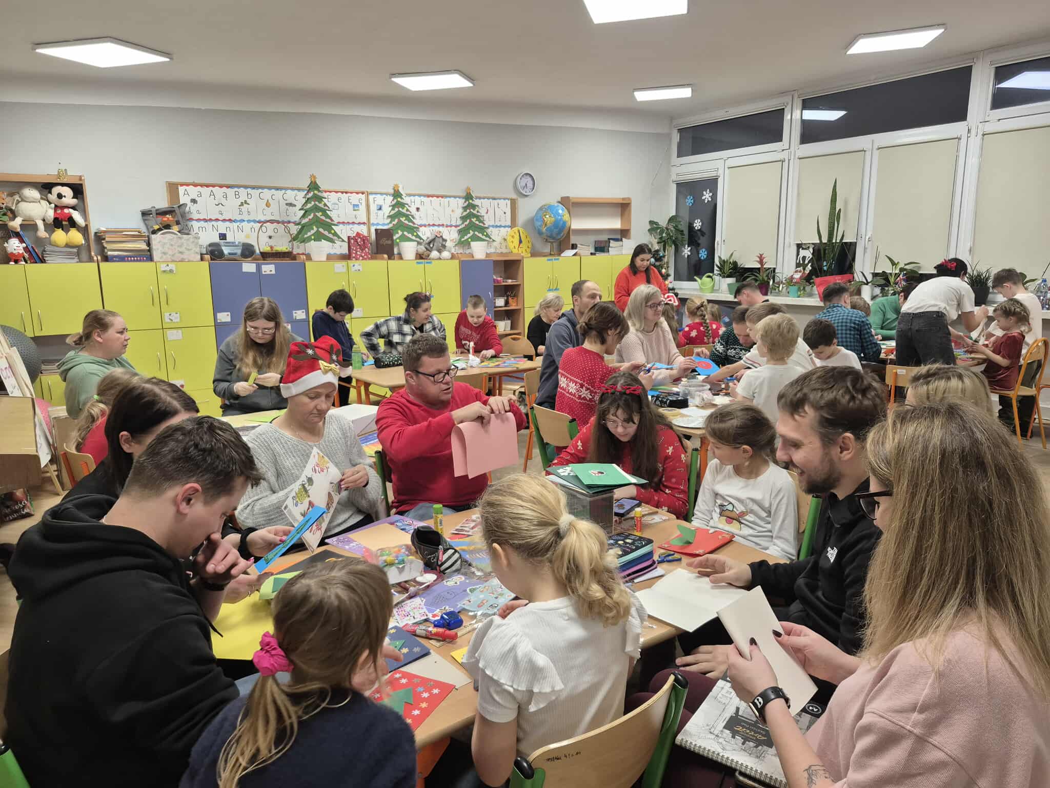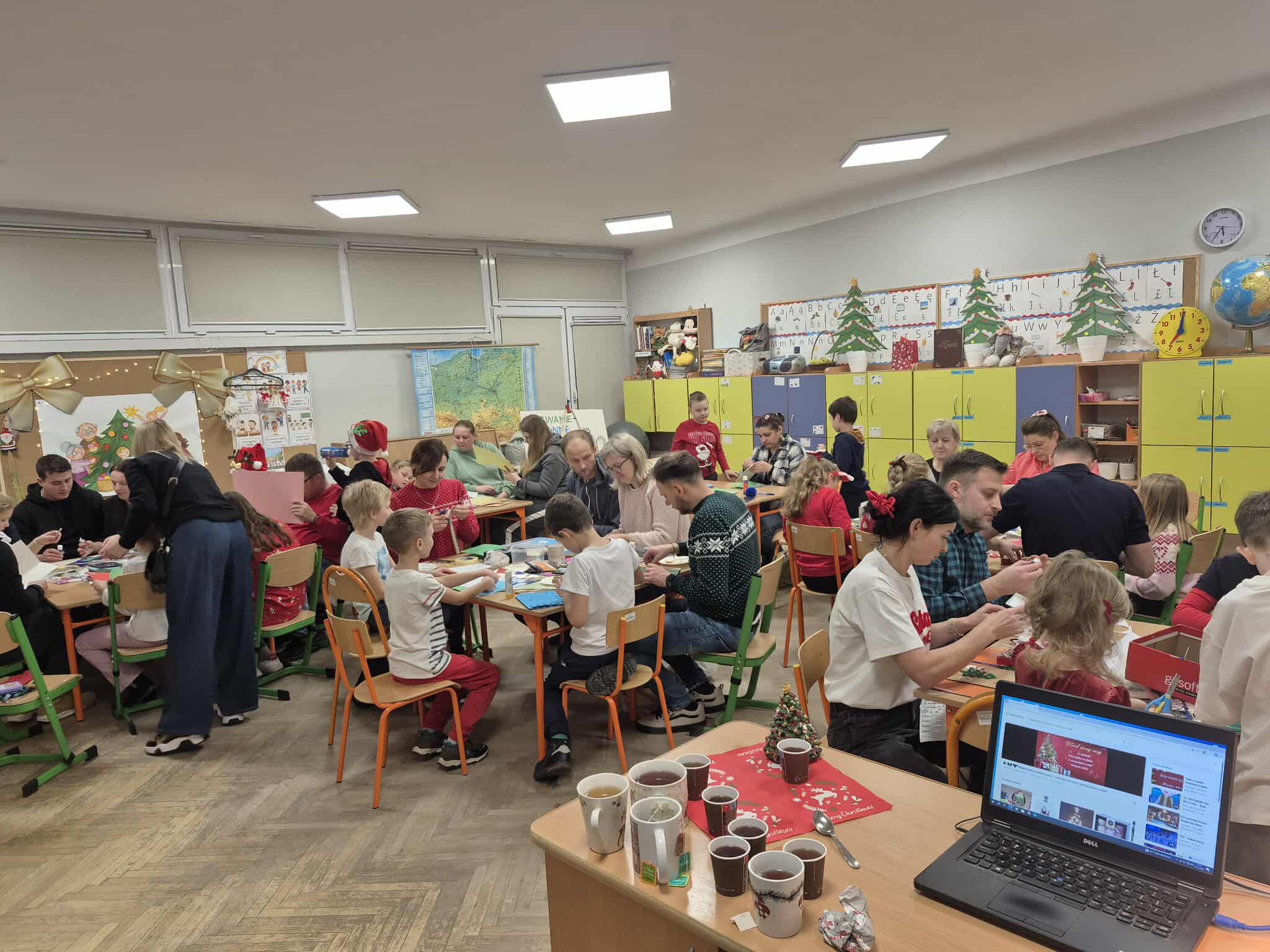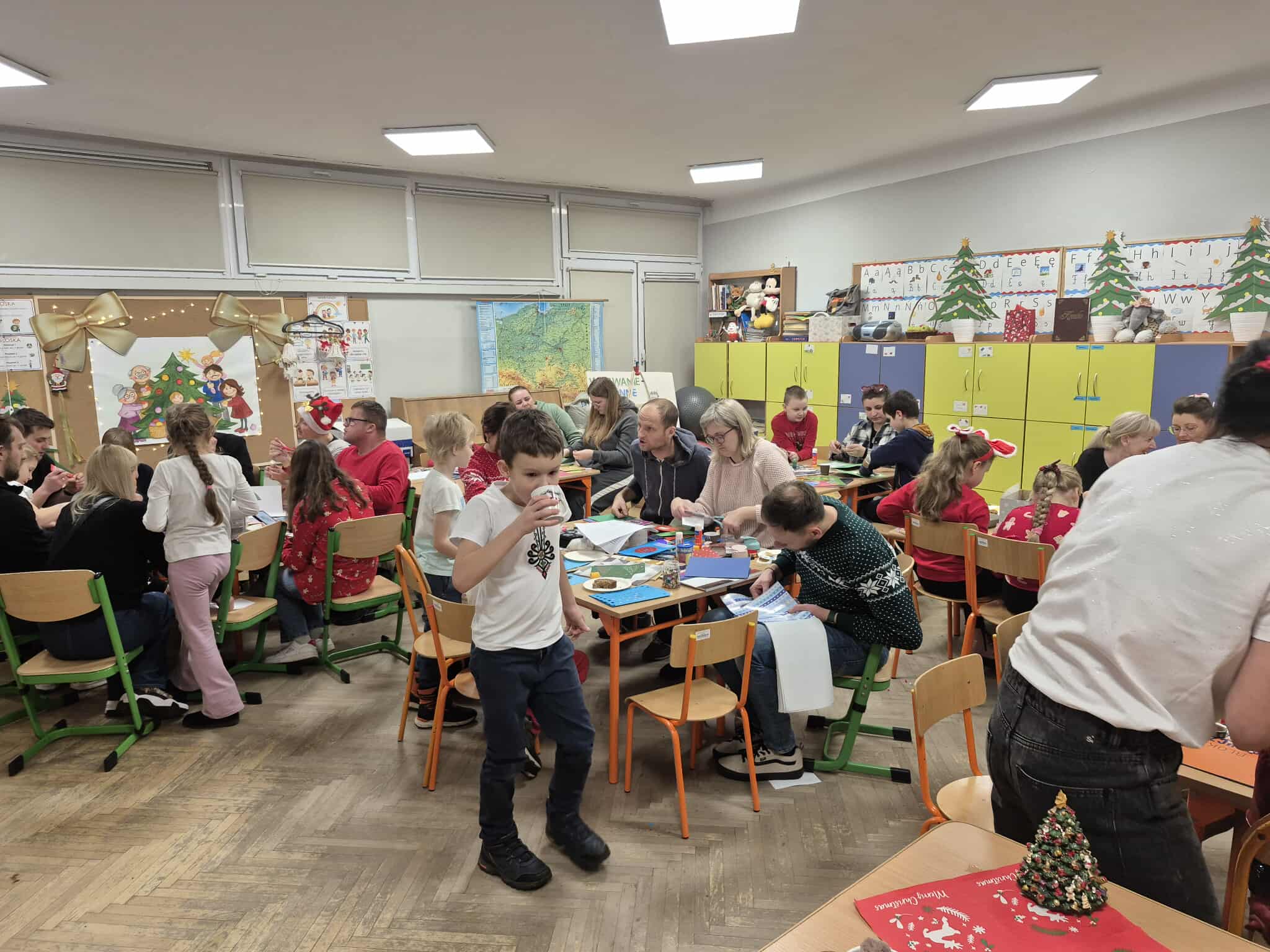 Za sprawą uczniów i ich rodziców w klasie 2a zapanowało świąteczne zamieszanie. W piątkowy wieczór spotkaliśmy się licznie na warsztatach świątecznych. Naszym celem była klasowa integracja, wspólne spędzenie czasu i przygotowanie kartek z życzeniami oraz upominków dla mieszkańców Domu Pomocy Społecznej „Wrzos” w Otwocku. Spotkanie rozpoczęło się od zaśpiewania pastorałki „W drodze do stajenki”, której uczniowie uczyli się już od dłuższego czasu. Nie zabrakło też słodkiego poczęstunku, który tym razem stanowił własnoręcznie przygotowany przez dzieci poprzedniego dnia na zajęciach kulinarnych, chlebek bananowy. Był to niezwykle ważny, wzruszający i pełen magii moment w życiu naszych drugoklasistów. Niech te chwile pozostaną z nami na długo. Z całego serca dziękujemy wszystkim rodzicom uczniów klasy 2a za zaangażowanie w przygotowanie warsztatów i tak liczne przybycie na to wyjątkowe spotkanie . Wasza obecność i pomoc jest nieoceniona.