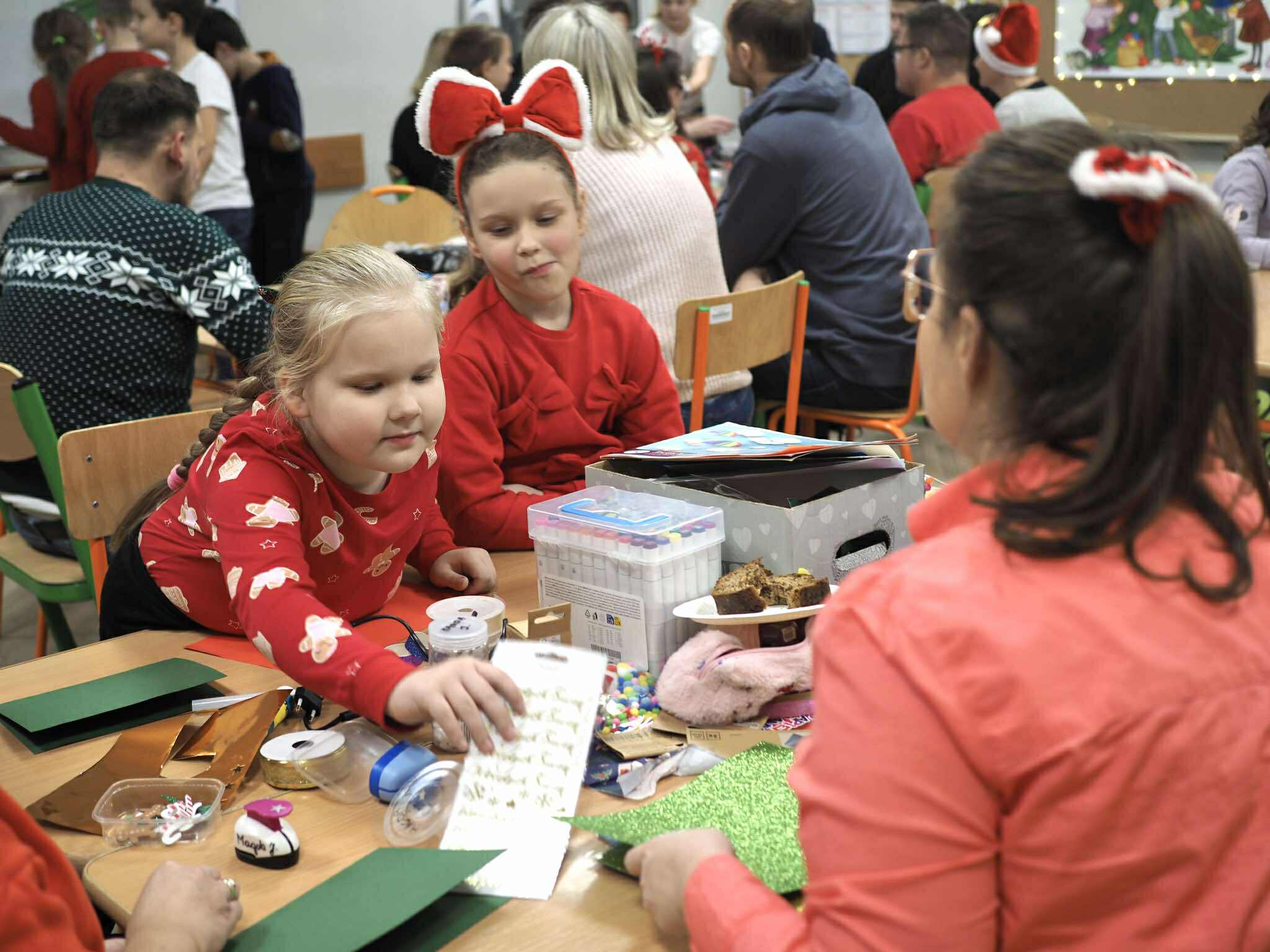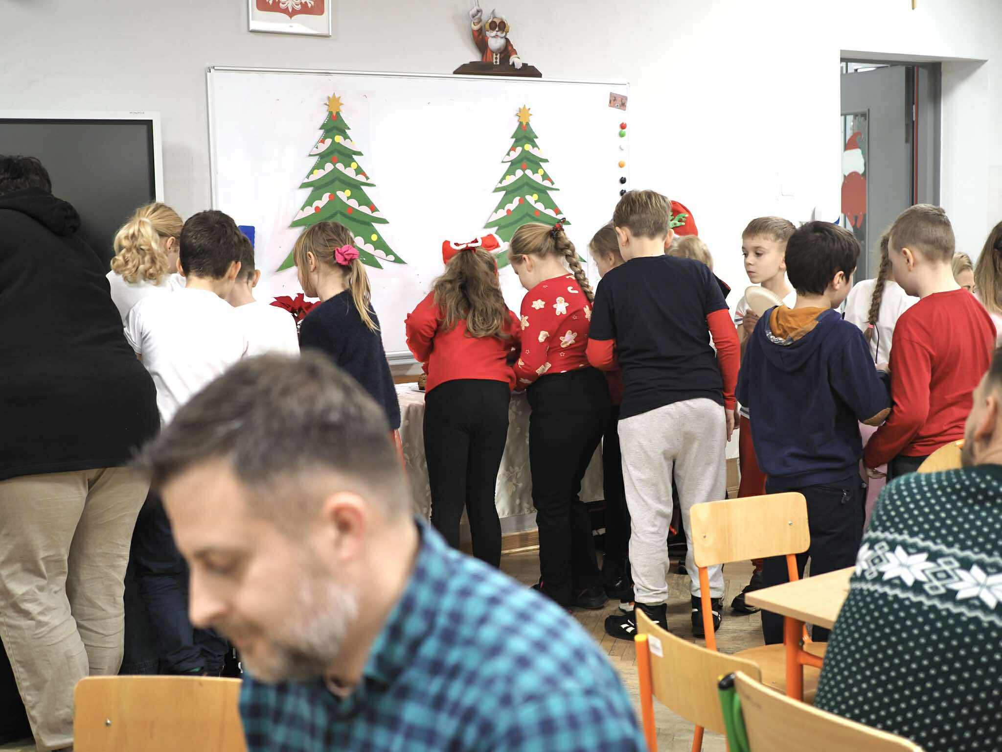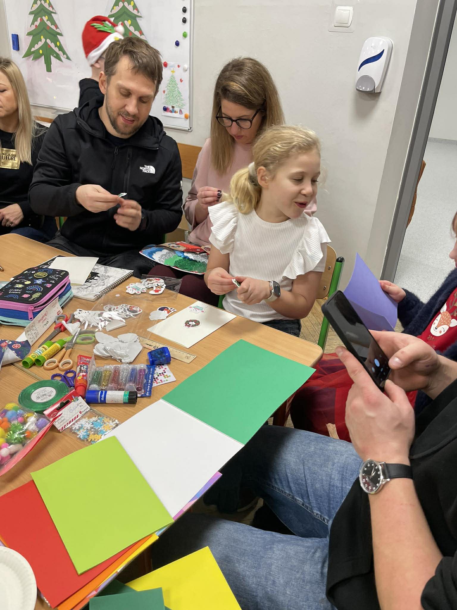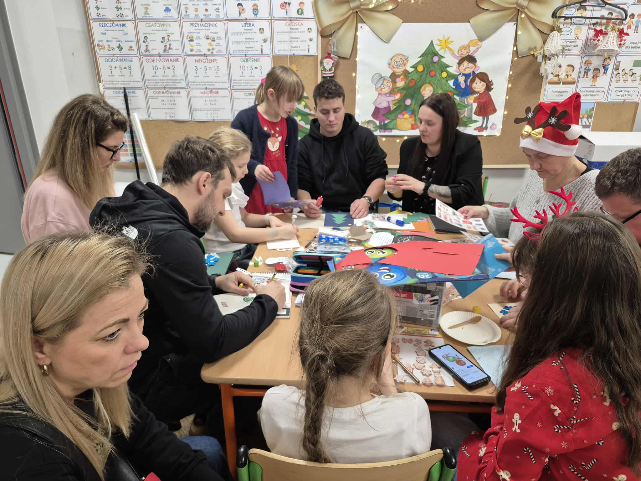 Za sprawą uczniów i ich rodziców w klasie 2a zapanowało świąteczne zamieszanie. W piątkowy wieczór spotkaliśmy się licznie na warsztatach świątecznych. Naszym celem była klasowa integracja, wspólne spędzenie czasu i przygotowanie kartek z życzeniami oraz upominków dla mieszkańców Domu Pomocy Społecznej „Wrzos” w Otwocku. Spotkanie rozpoczęło się od zaśpiewania pastorałki „W drodze do stajenki”, której uczniowie uczyli się już od dłuższego czasu. Nie zabrakło też słodkiego poczęstunku, który tym razem stanowił własnoręcznie przygotowany przez dzieci poprzedniego dnia na zajęciach kulinarnych, chlebek bananowy. Był to niezwykle ważny, wzruszający i pełen magii moment w życiu naszych drugoklasistów. Niech te chwile pozostaną z nami na długo. Z całego serca dziękujemy wszystkim rodzicom uczniów klasy 2a za zaangażowanie w przygotowanie warsztatów i tak liczne przybycie na to wyjątkowe spotkanie . Wasza obecność i pomoc jest nieoceniona.