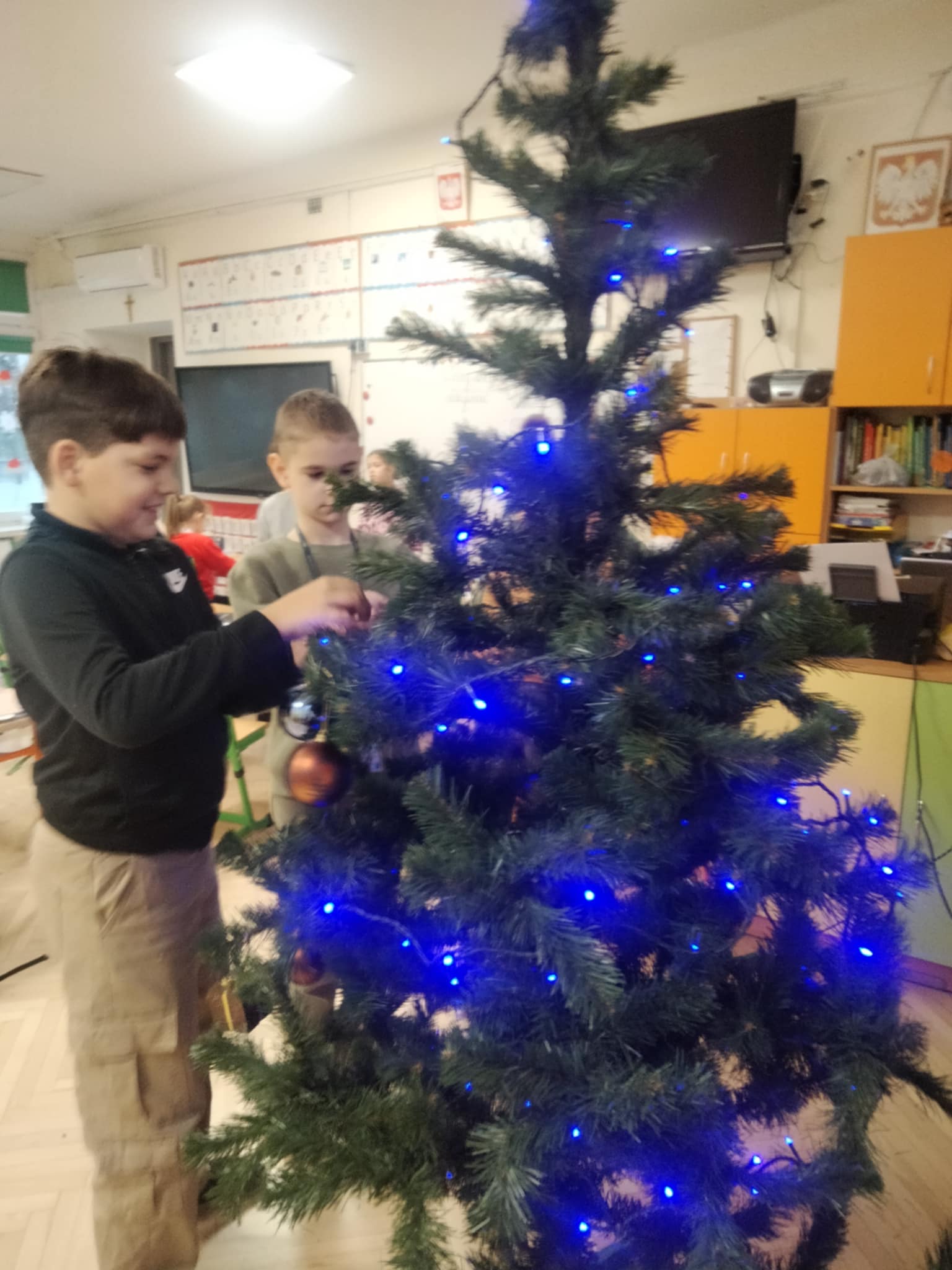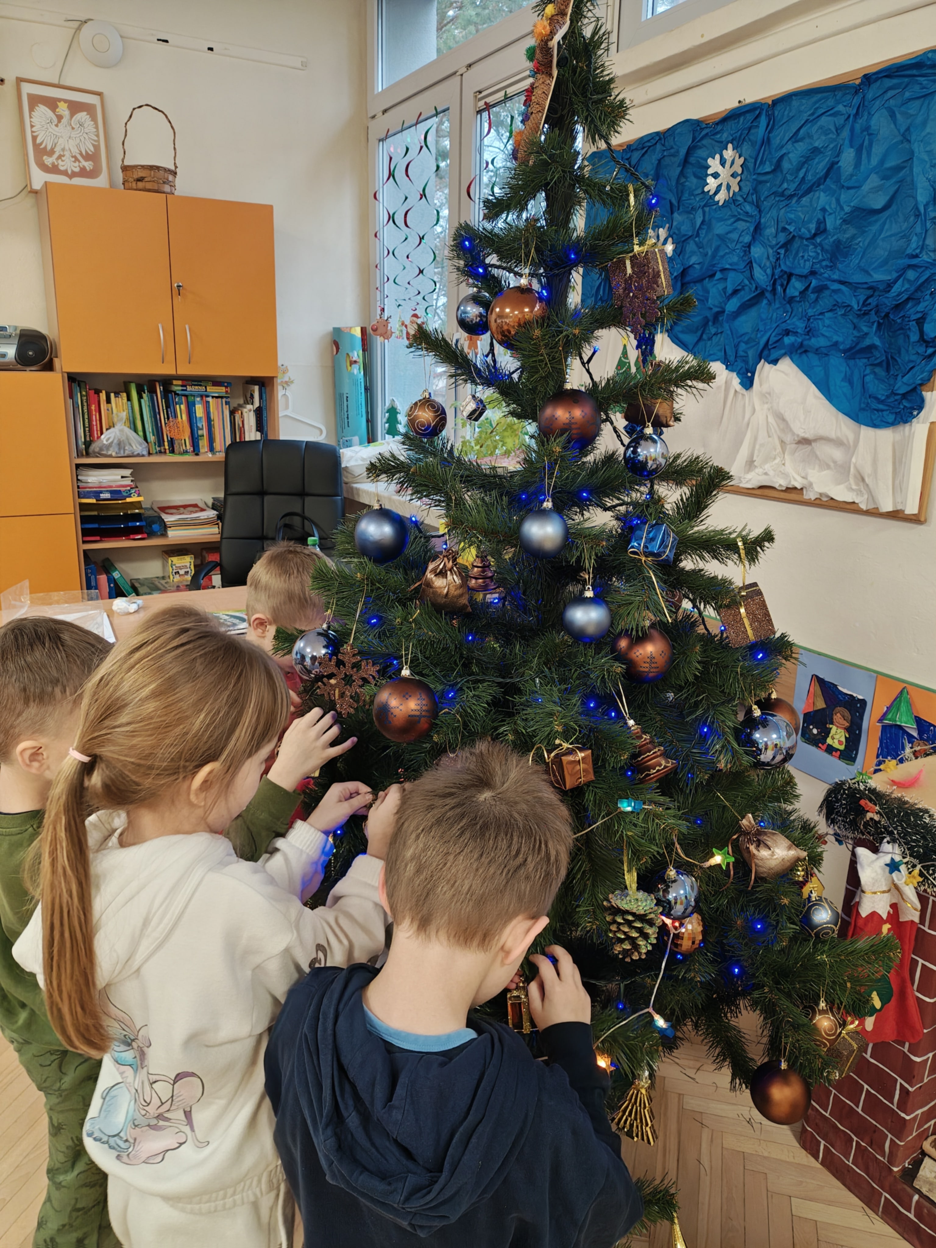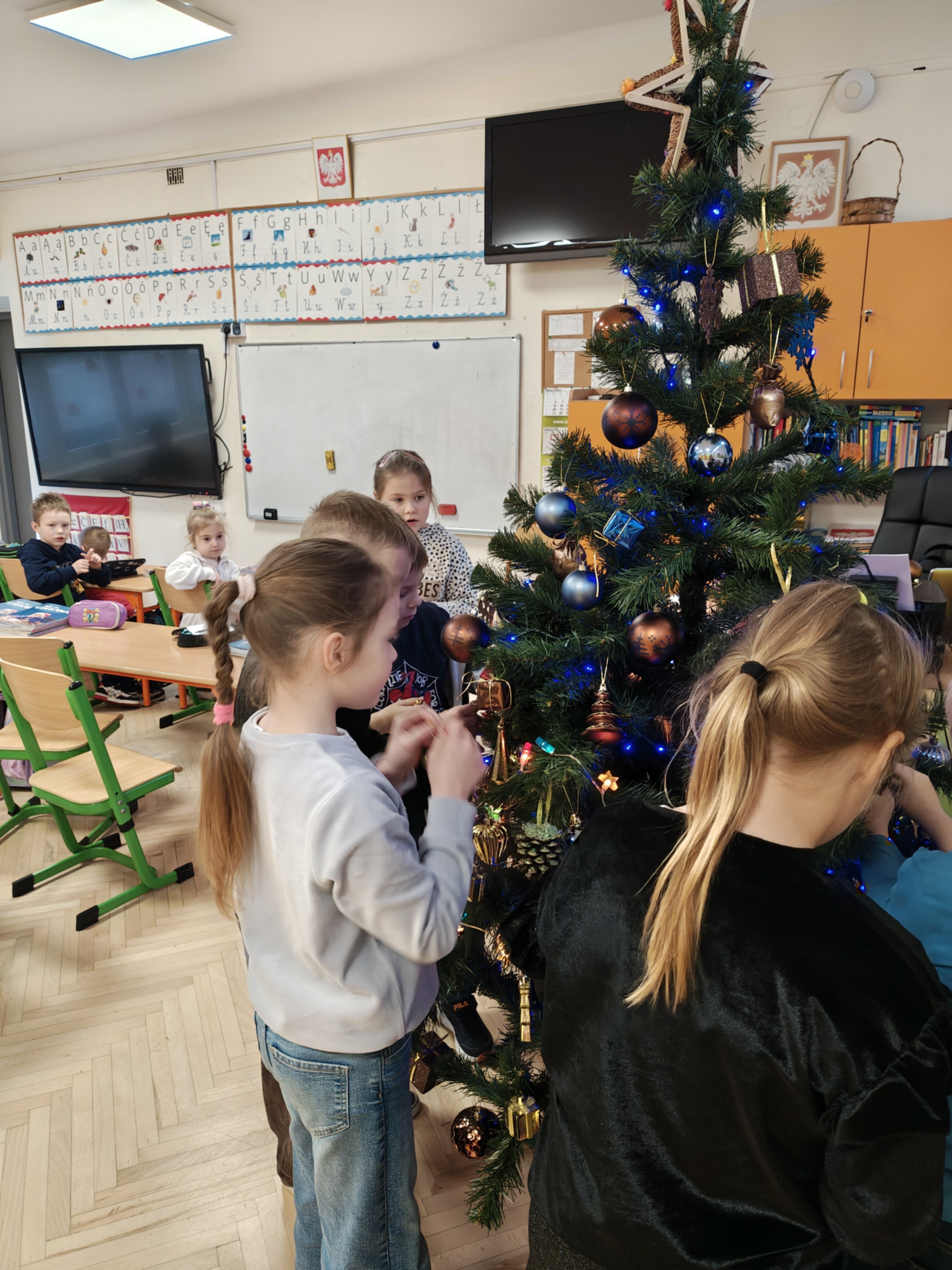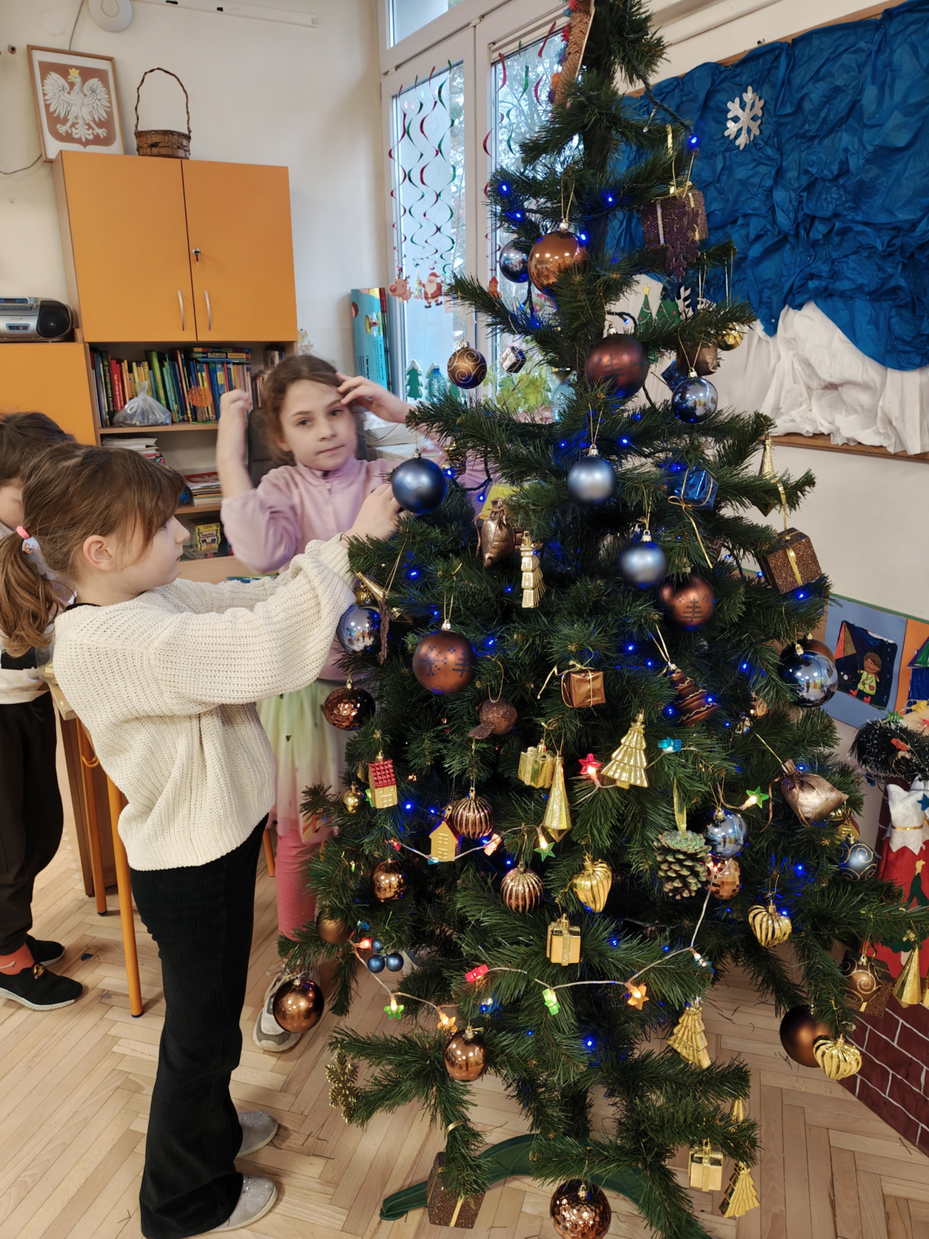 Na początku ustawiliśmy piękne, zielone drzewko, a potem każdy uczeń wybrał dla siebie ozdobę, którą zawiesił na choince.Jedni wieszali kolorowe bombki,inni złote dzwoneczki albo błyszczące gwiazdki