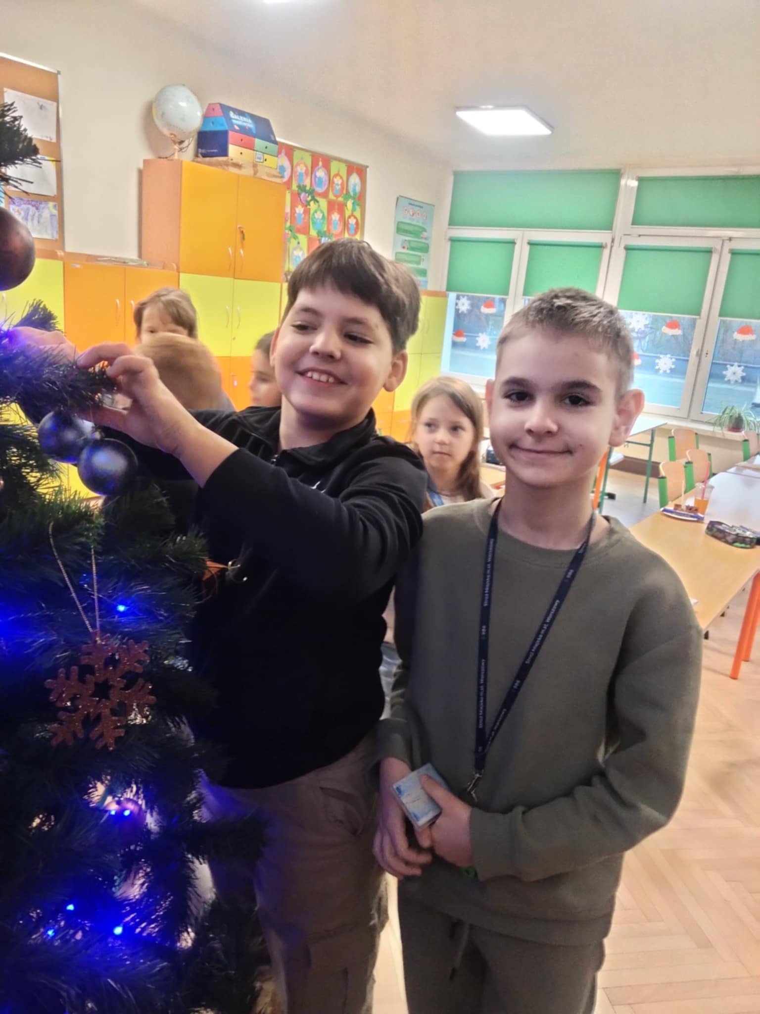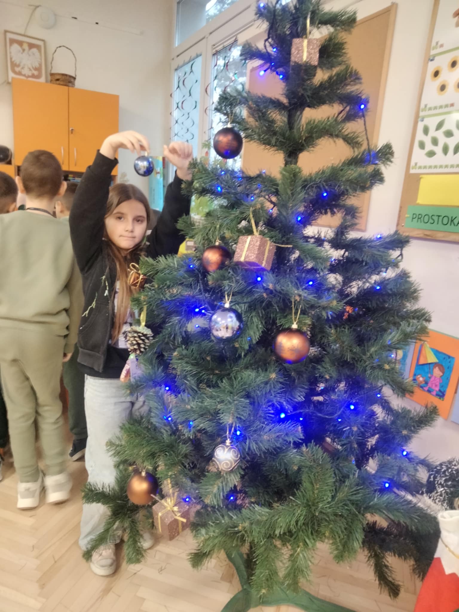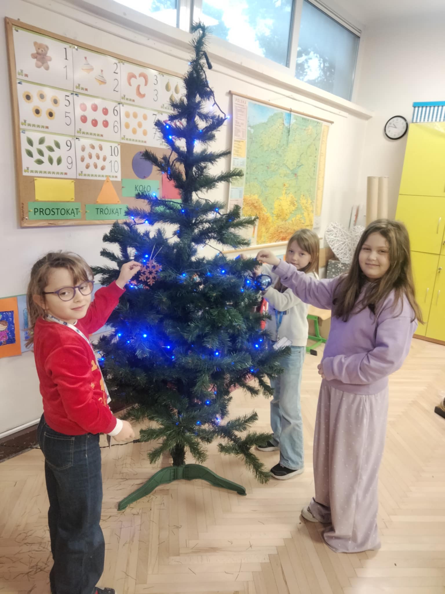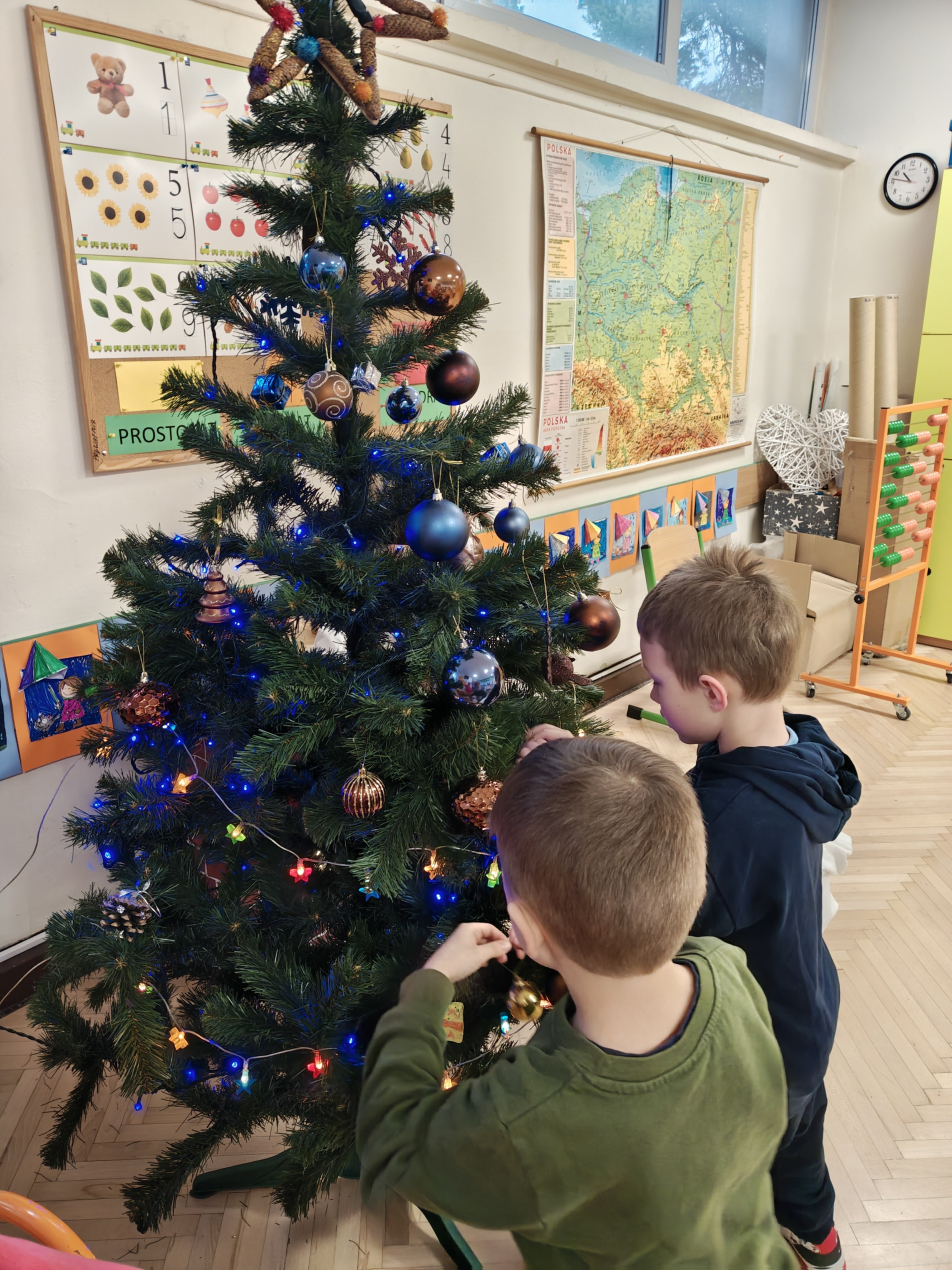 Na początku ustawiliśmy piękne, zielone drzewko, a potem każdy uczeń wybrał dla siebie ozdobę, którą zawiesił na choince.Jedni wieszali kolorowe bombki,inni złote dzwoneczki albo błyszczące gwiazdki