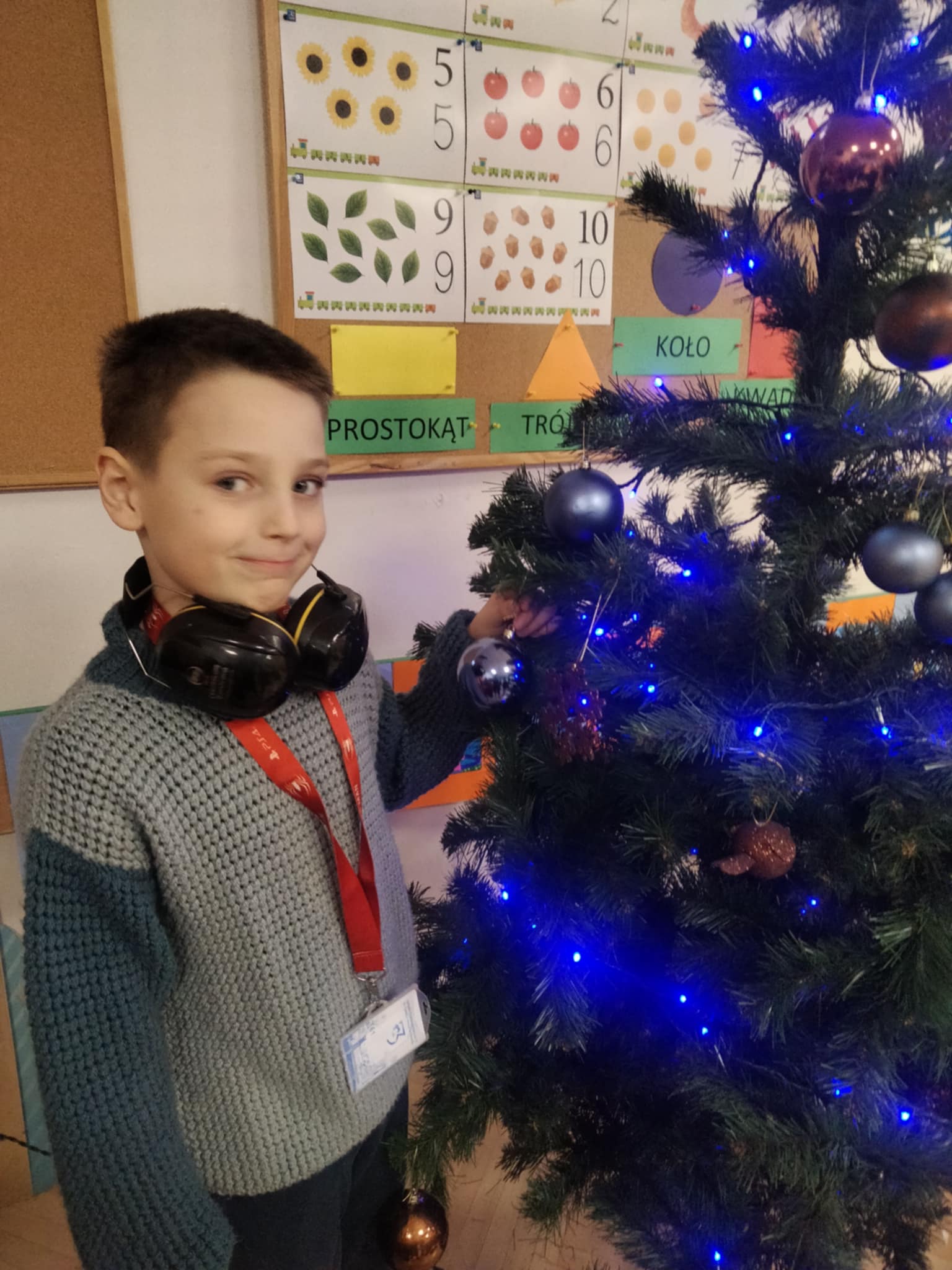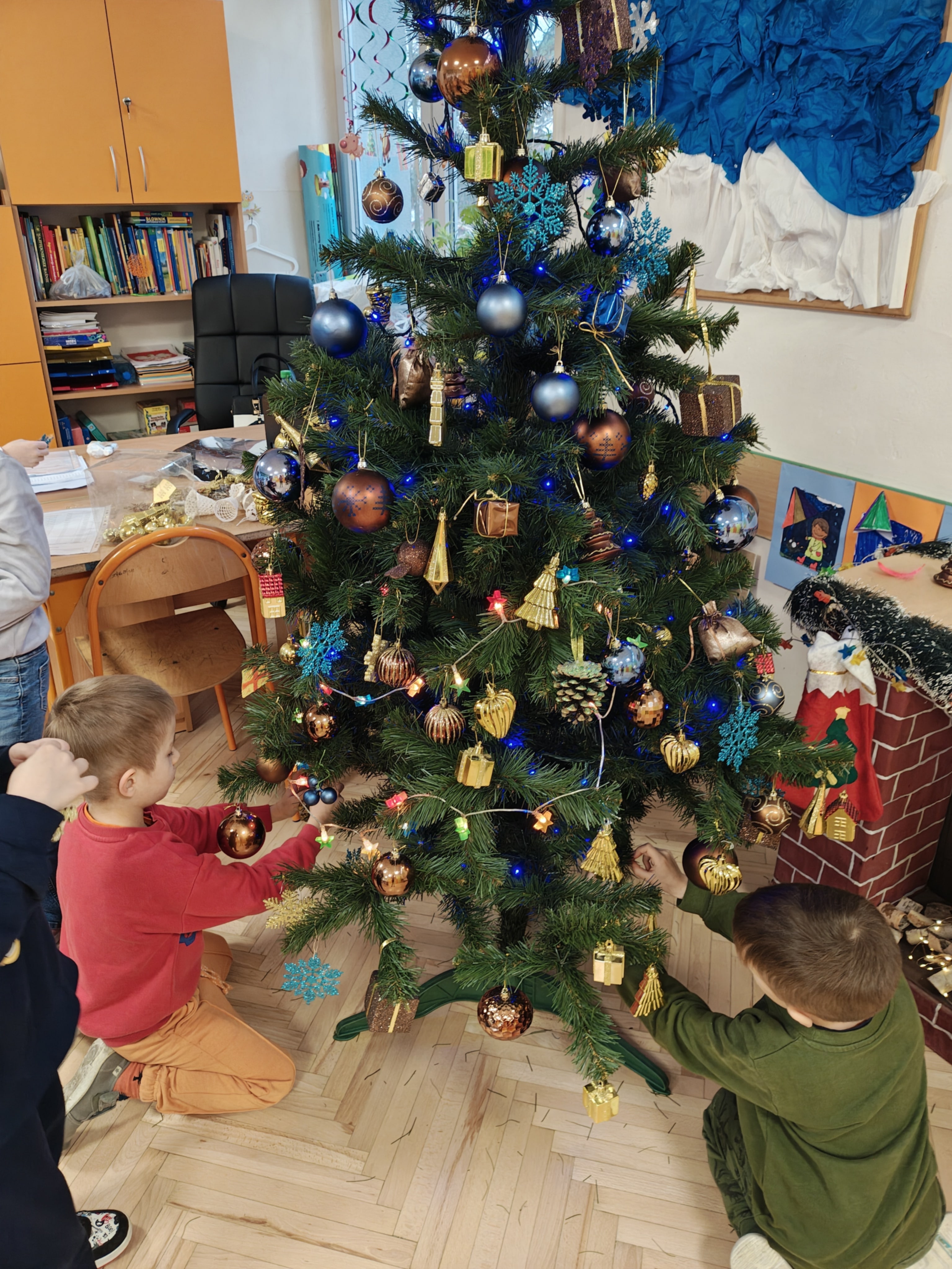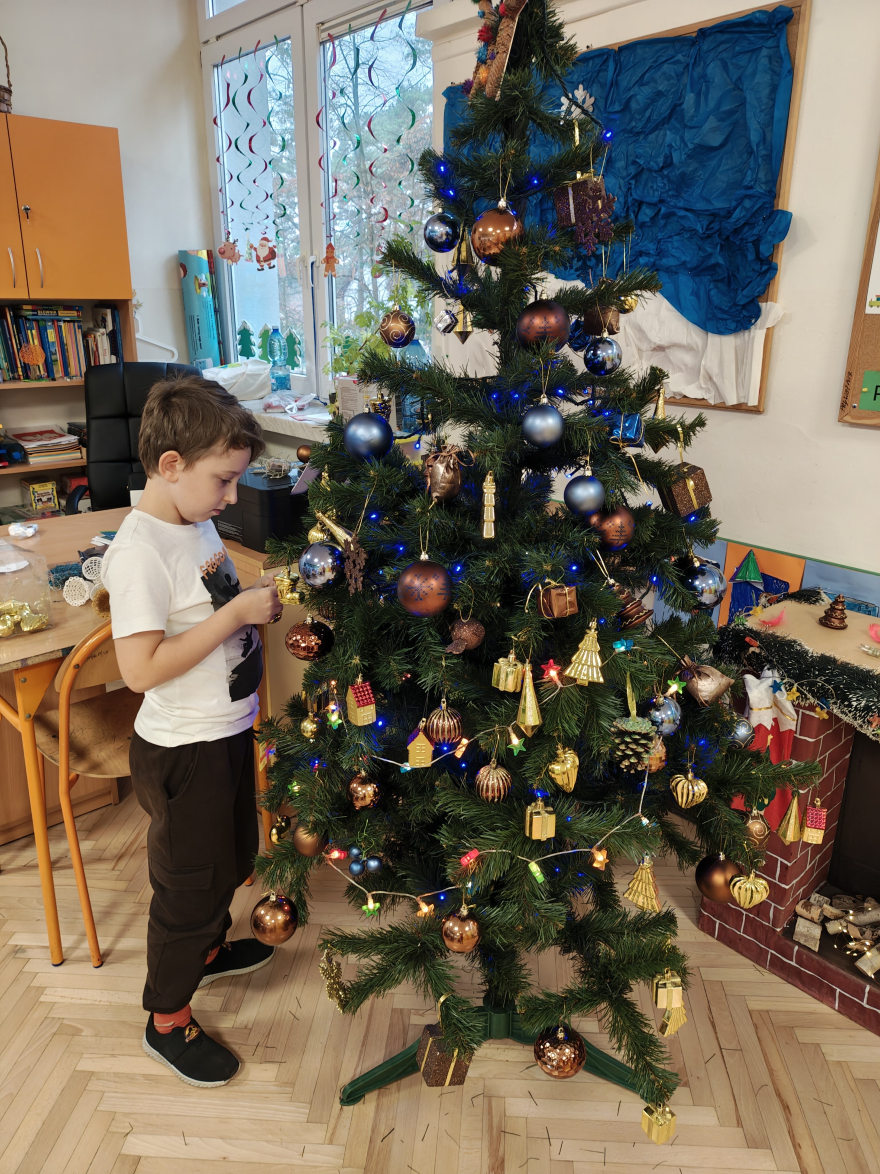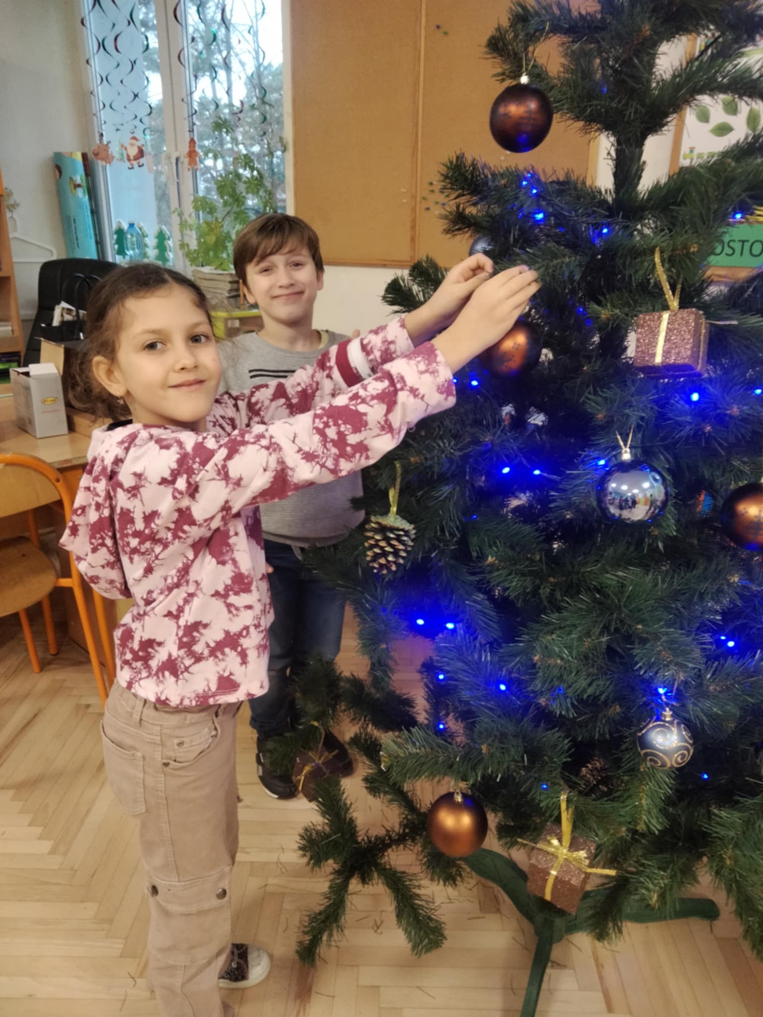 Na początku ustawiliśmy piękne, zielone drzewko, a potem każdy uczeń wybrał dla siebie ozdobę, którą zawiesił na choince.Jedni wieszali kolorowe bombki,inni złote dzwoneczki albo błyszczące gwiazdki
