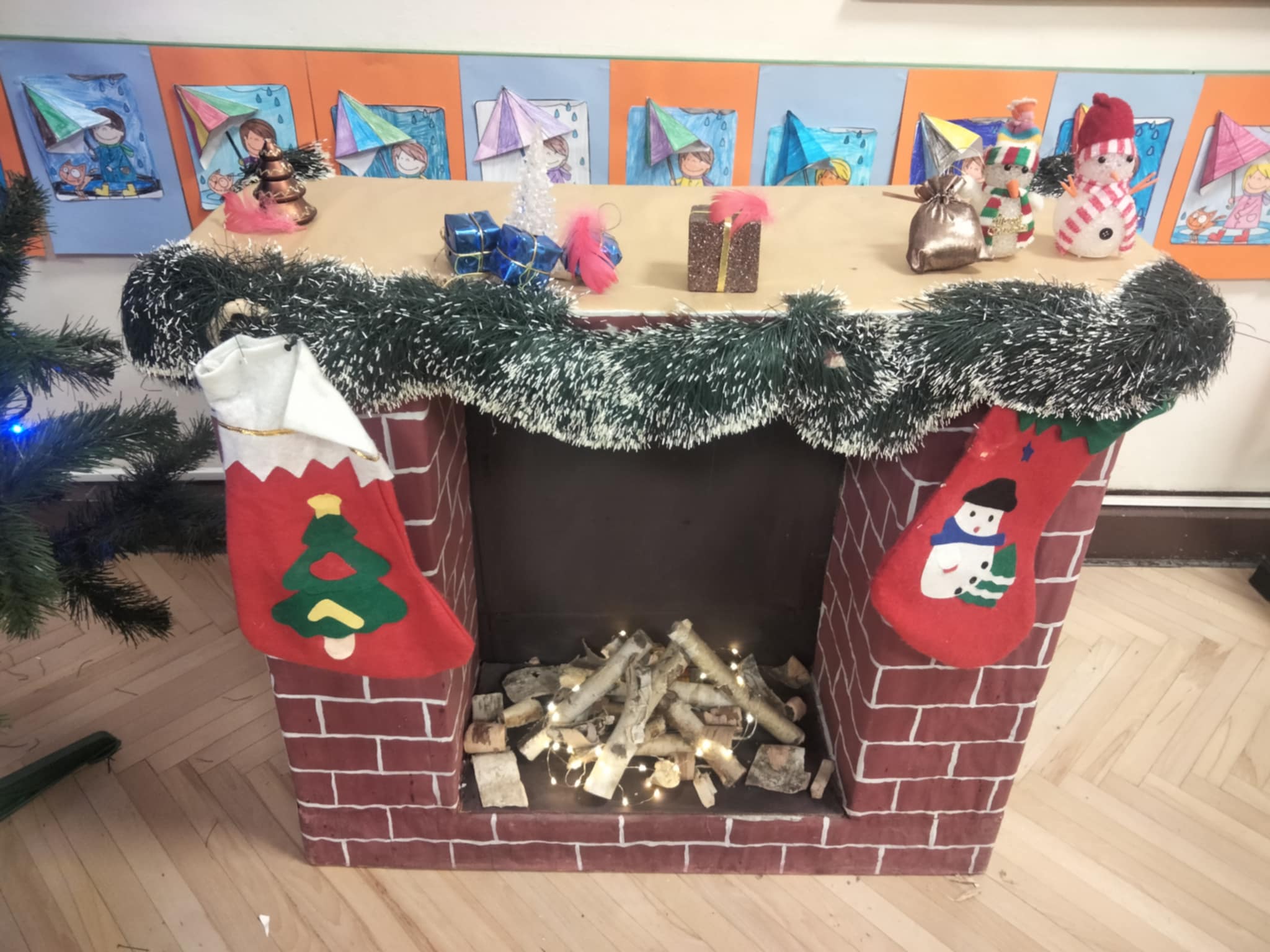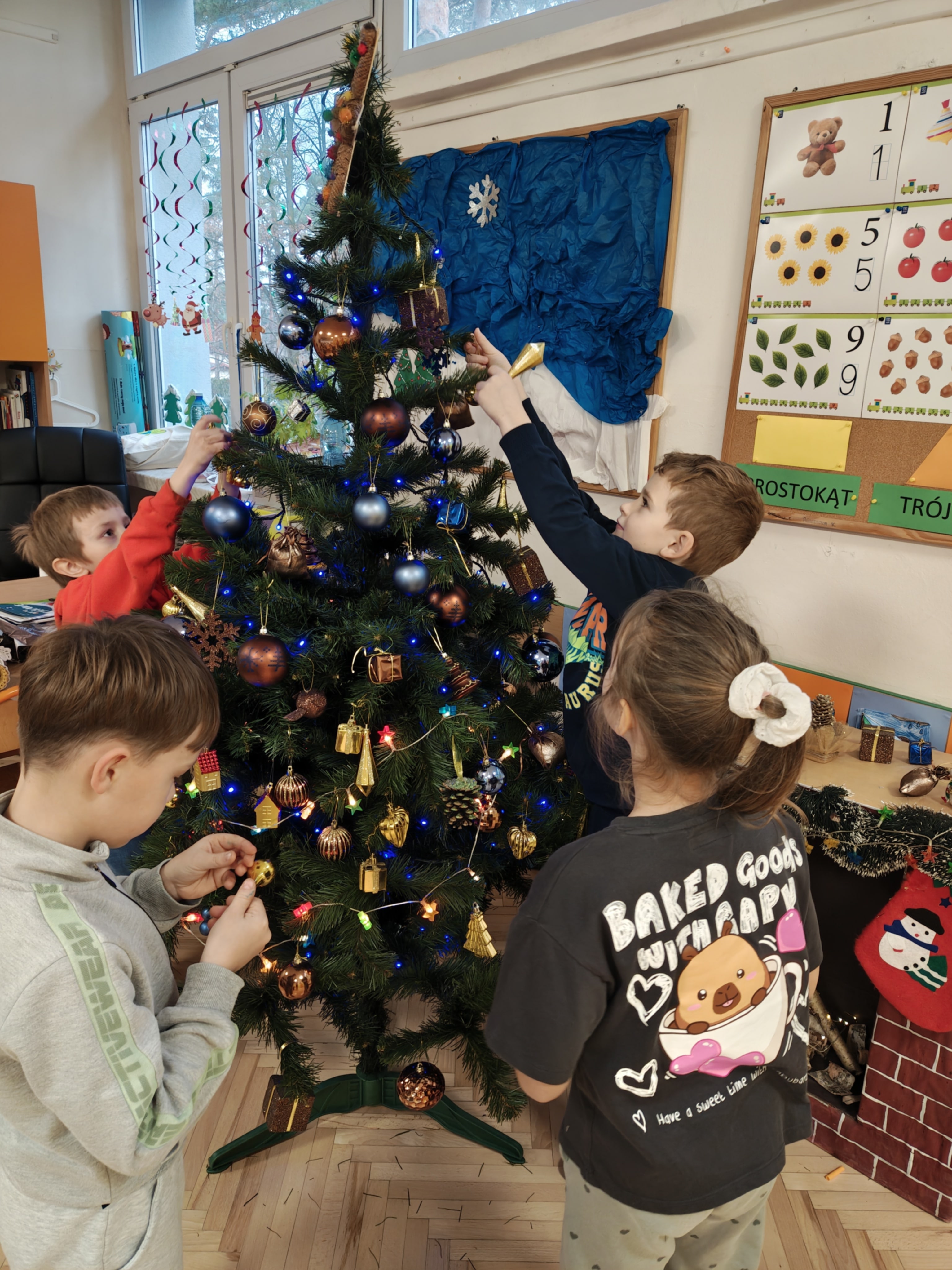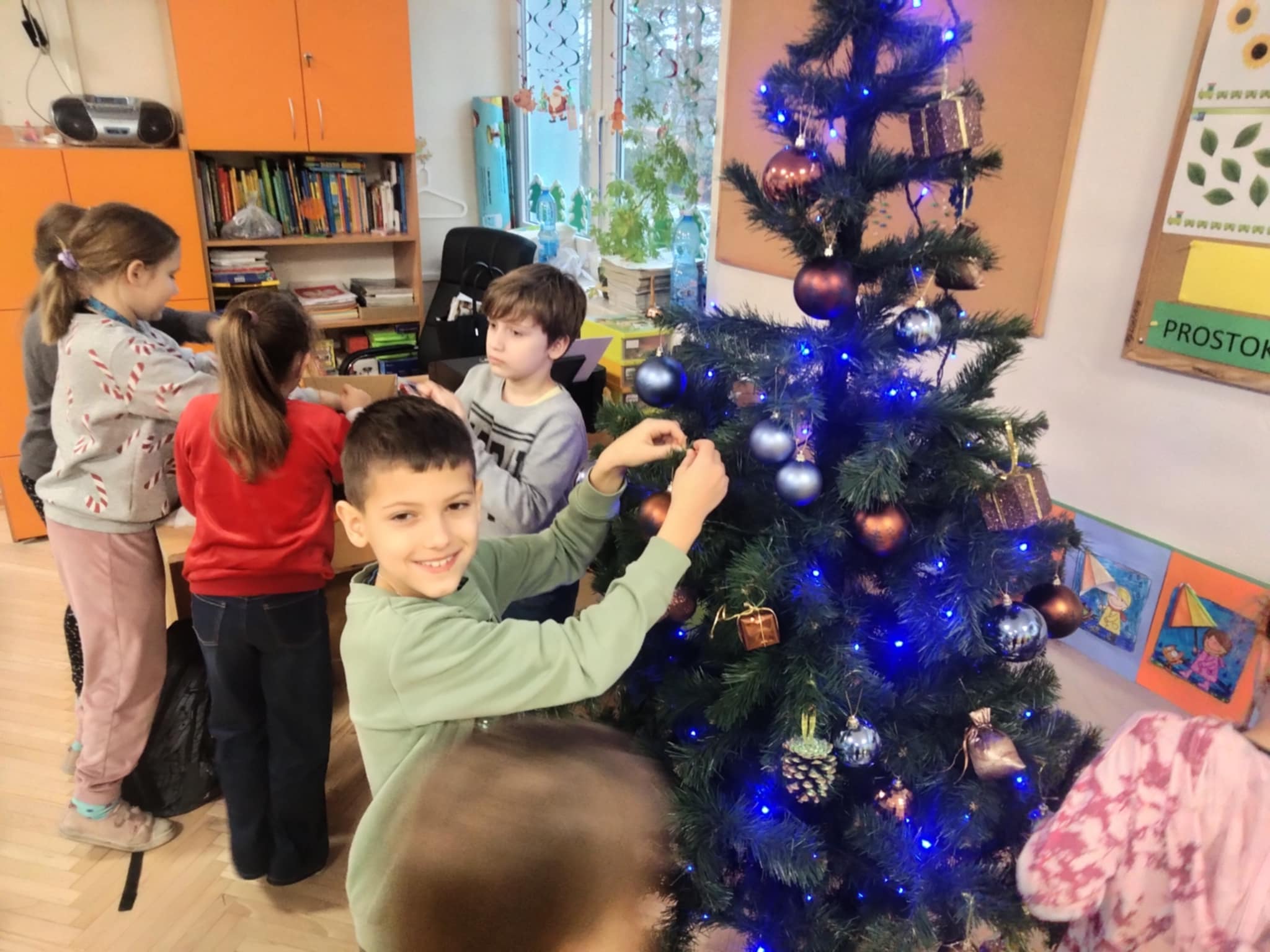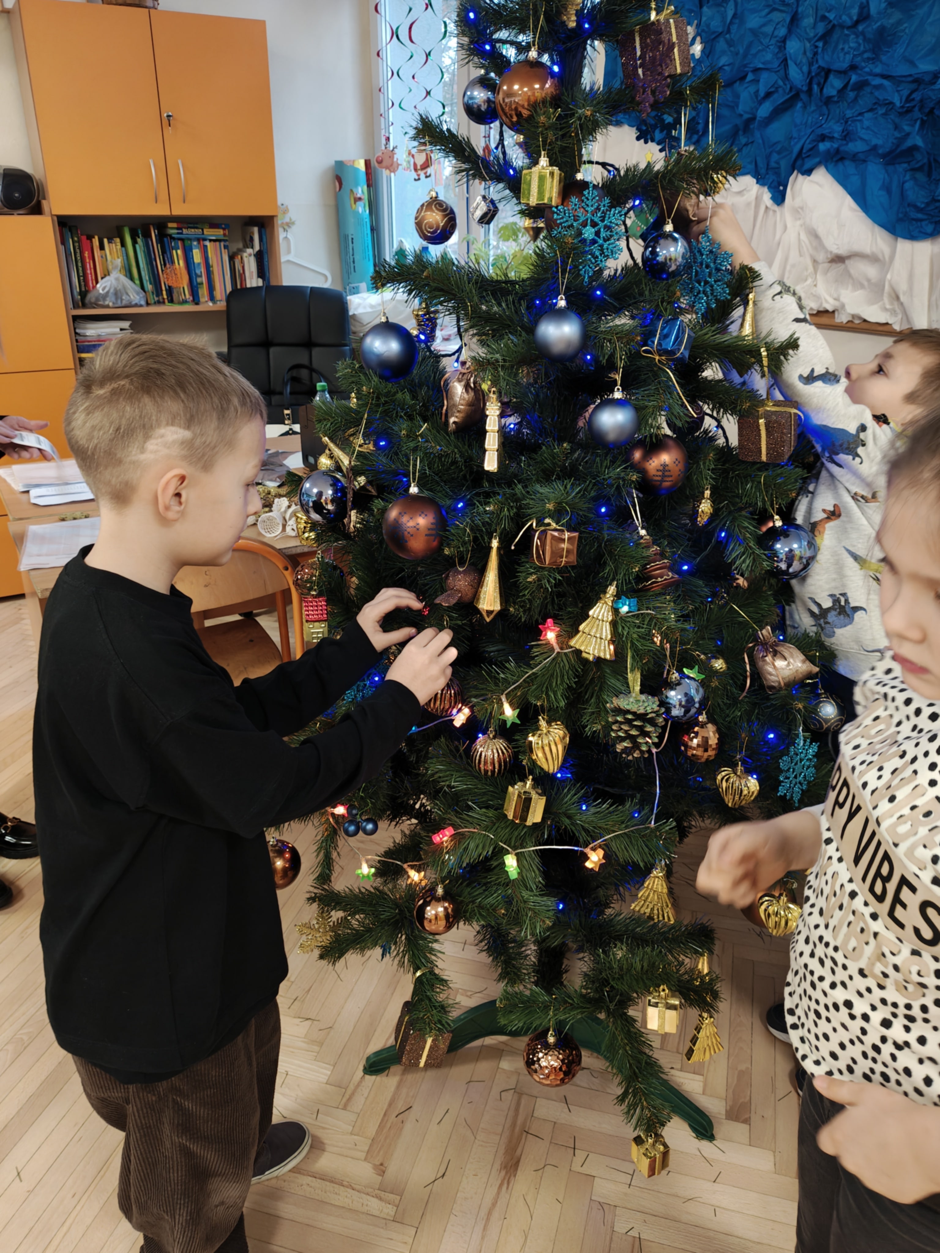 Na początku ustawiliśmy piękne, zielone drzewko, a potem każdy uczeń wybrał dla siebie ozdobę, którą zawiesił na choince.Jedni wieszali kolorowe bombki,inni złote dzwoneczki albo błyszczące gwiazdki