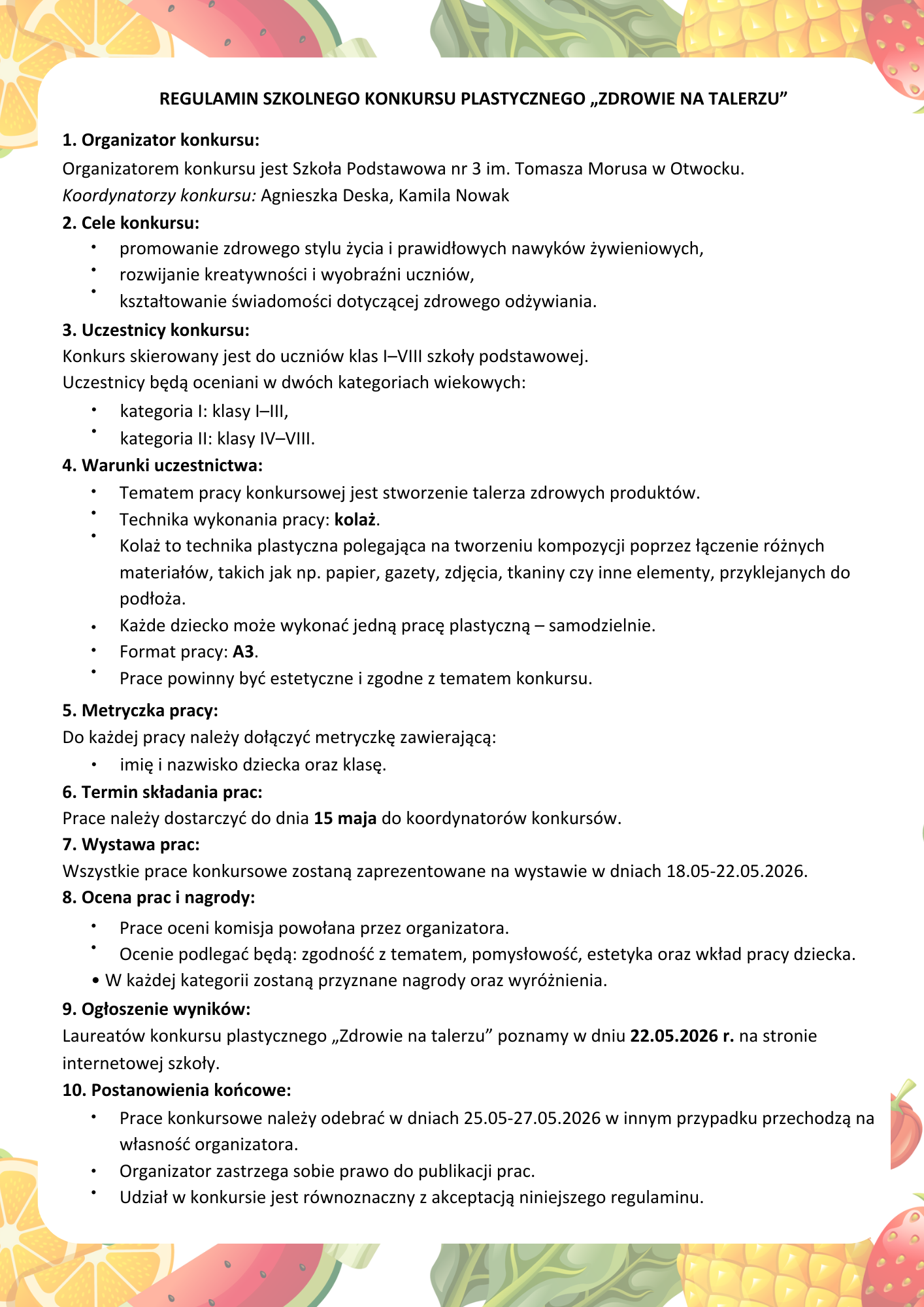 REGULAMIN SZKOLNEGO KONKURSU PLASTYCZNEGO „ZDROWIE NA TALERZU”