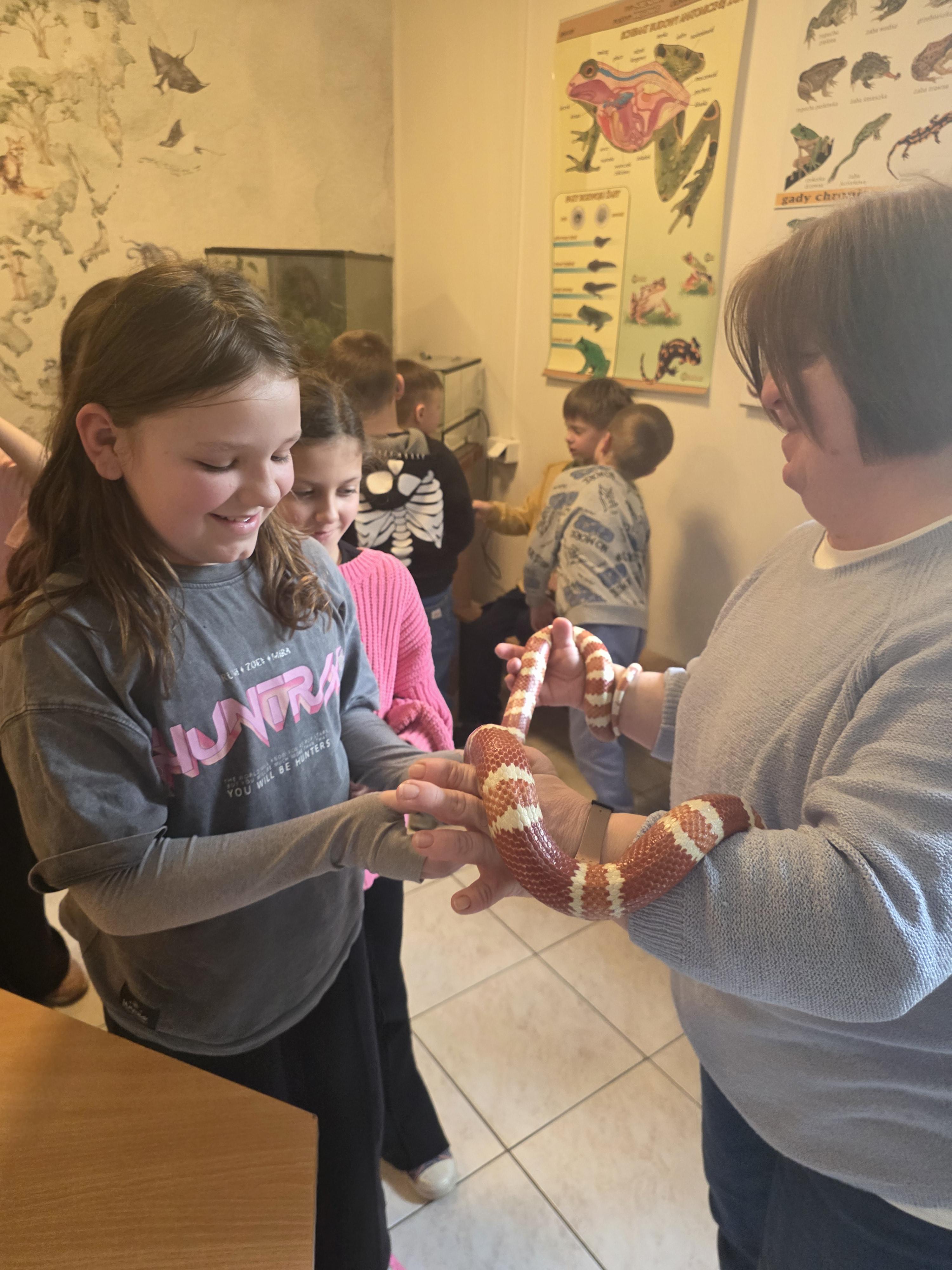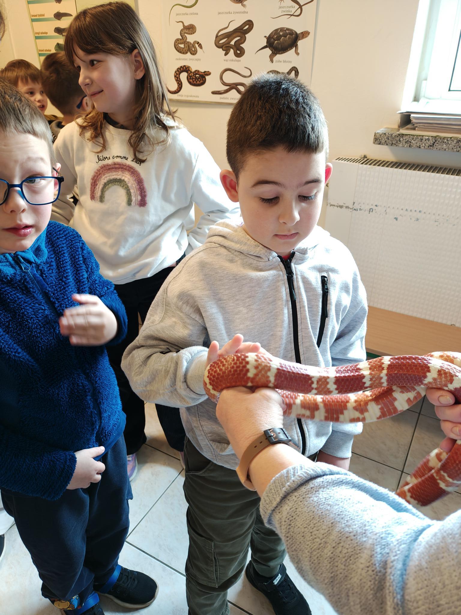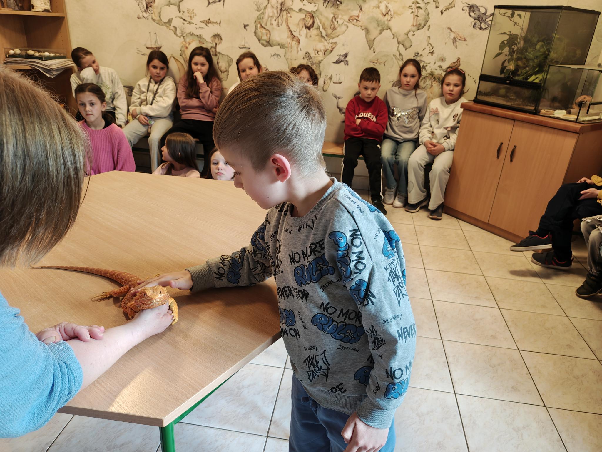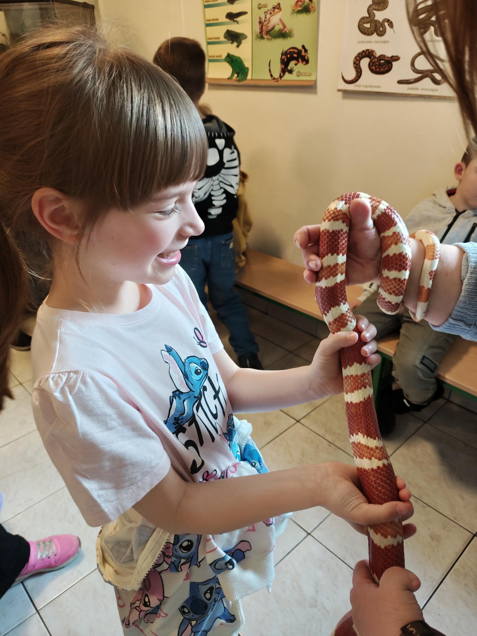 Podczas zajęć dzieci miały za zadanie posegregować różne pokarmy dla zwierząt roślinożernych, mięsożernych i wszystkożernych. Dowiedziały się również czym nie można karmić zwierząt. Miały także możliwość pogłaskać węża, jaszczurkę oraz potrzymać patyczaka. ![]()