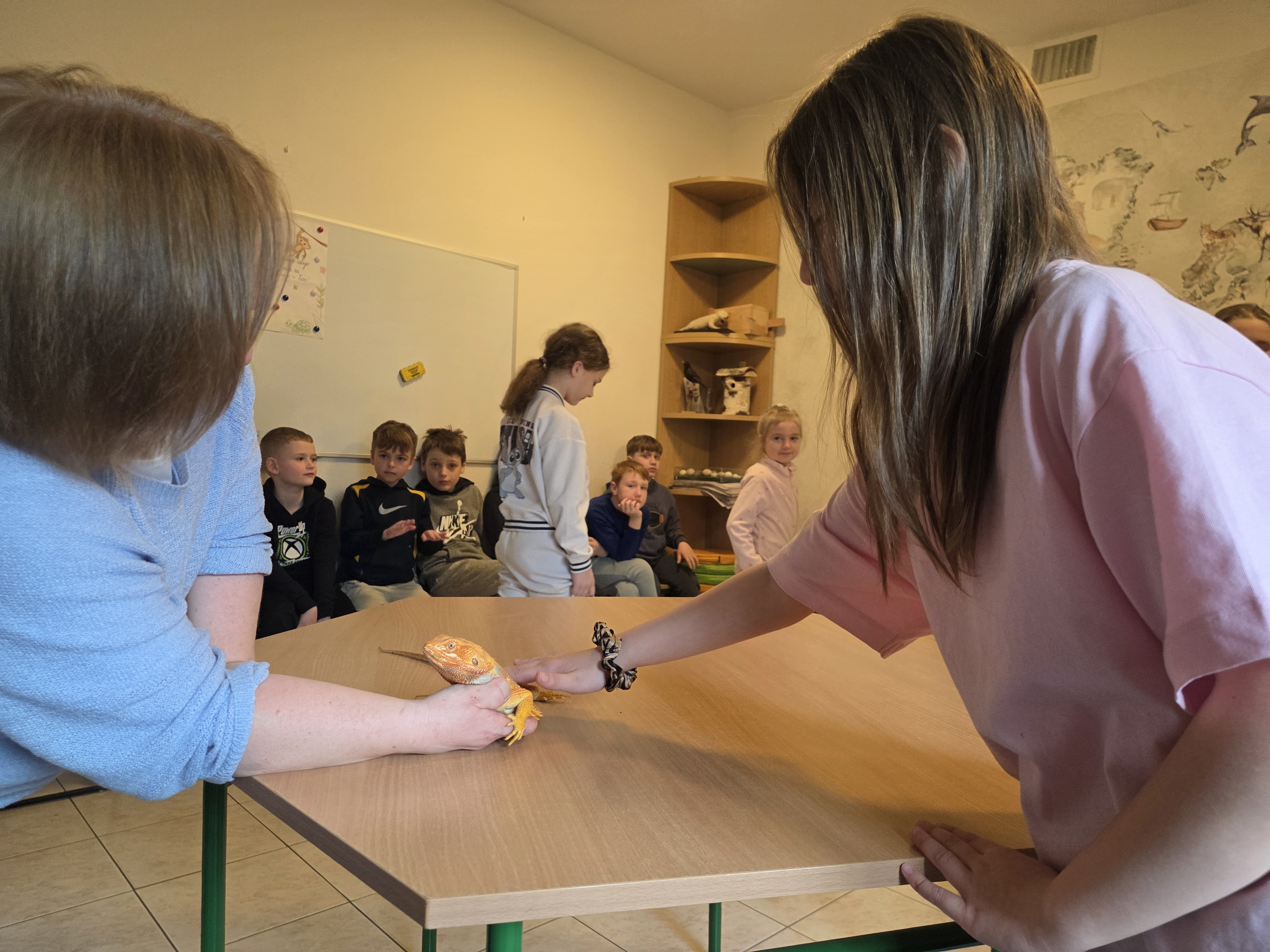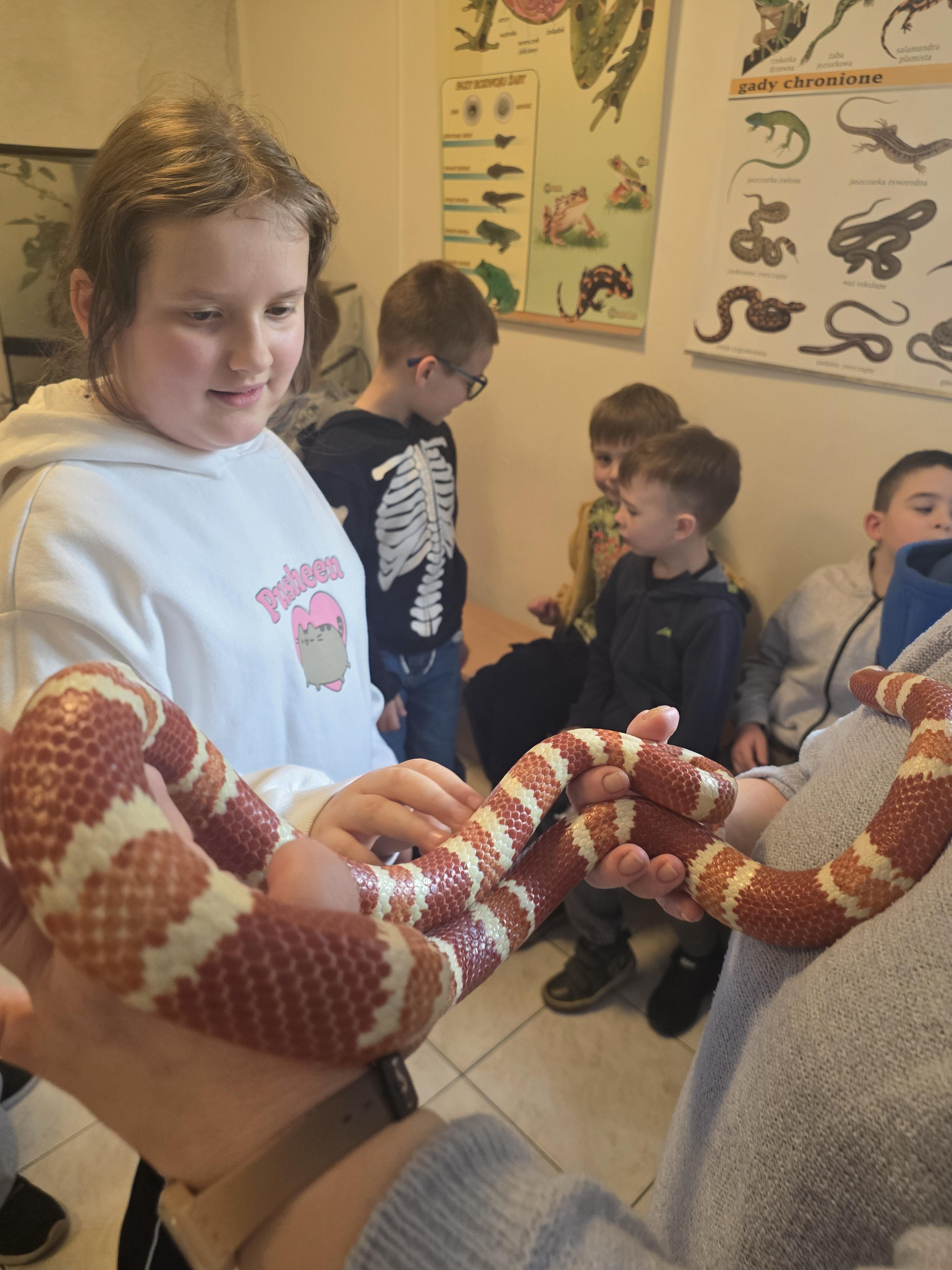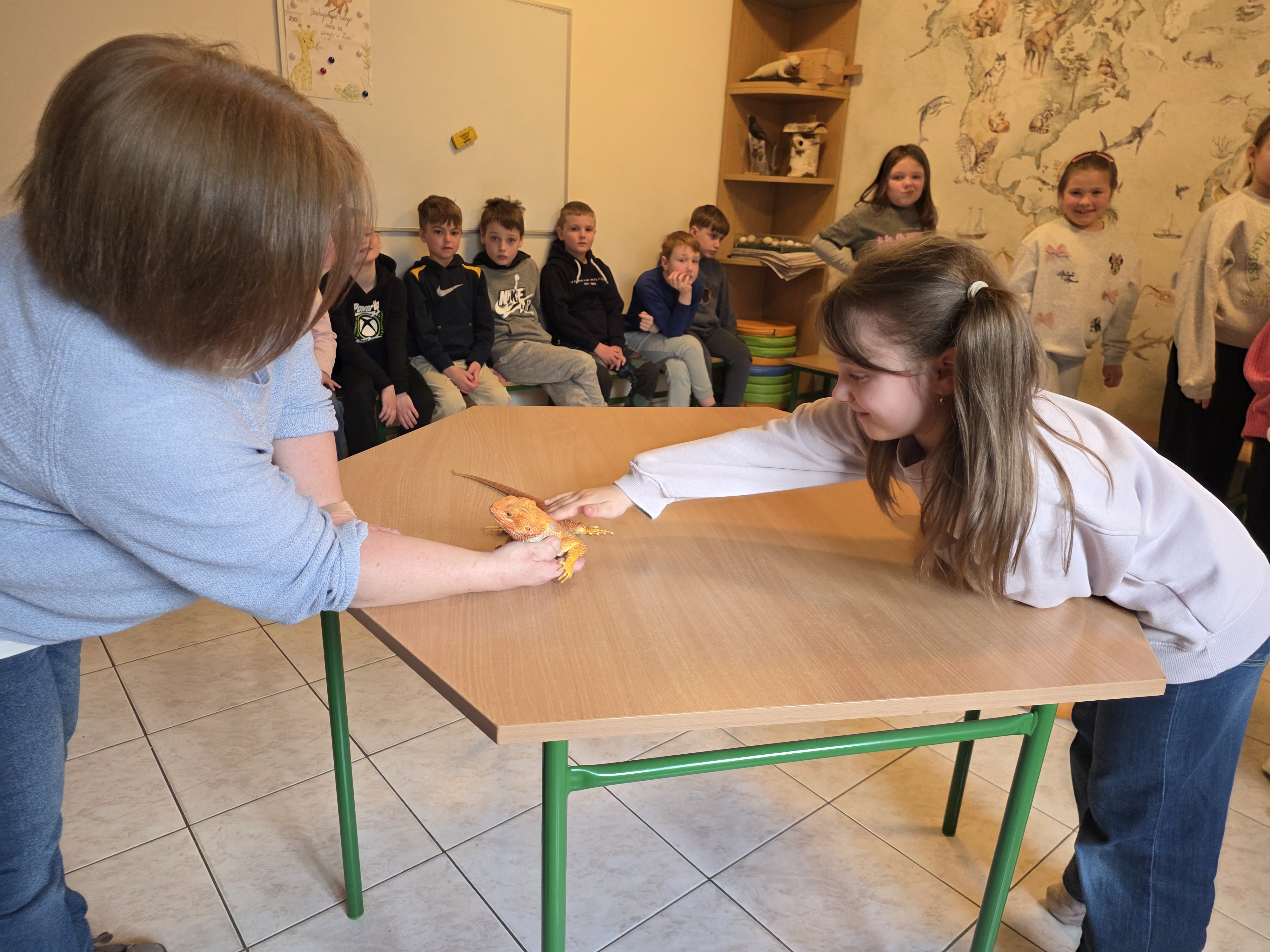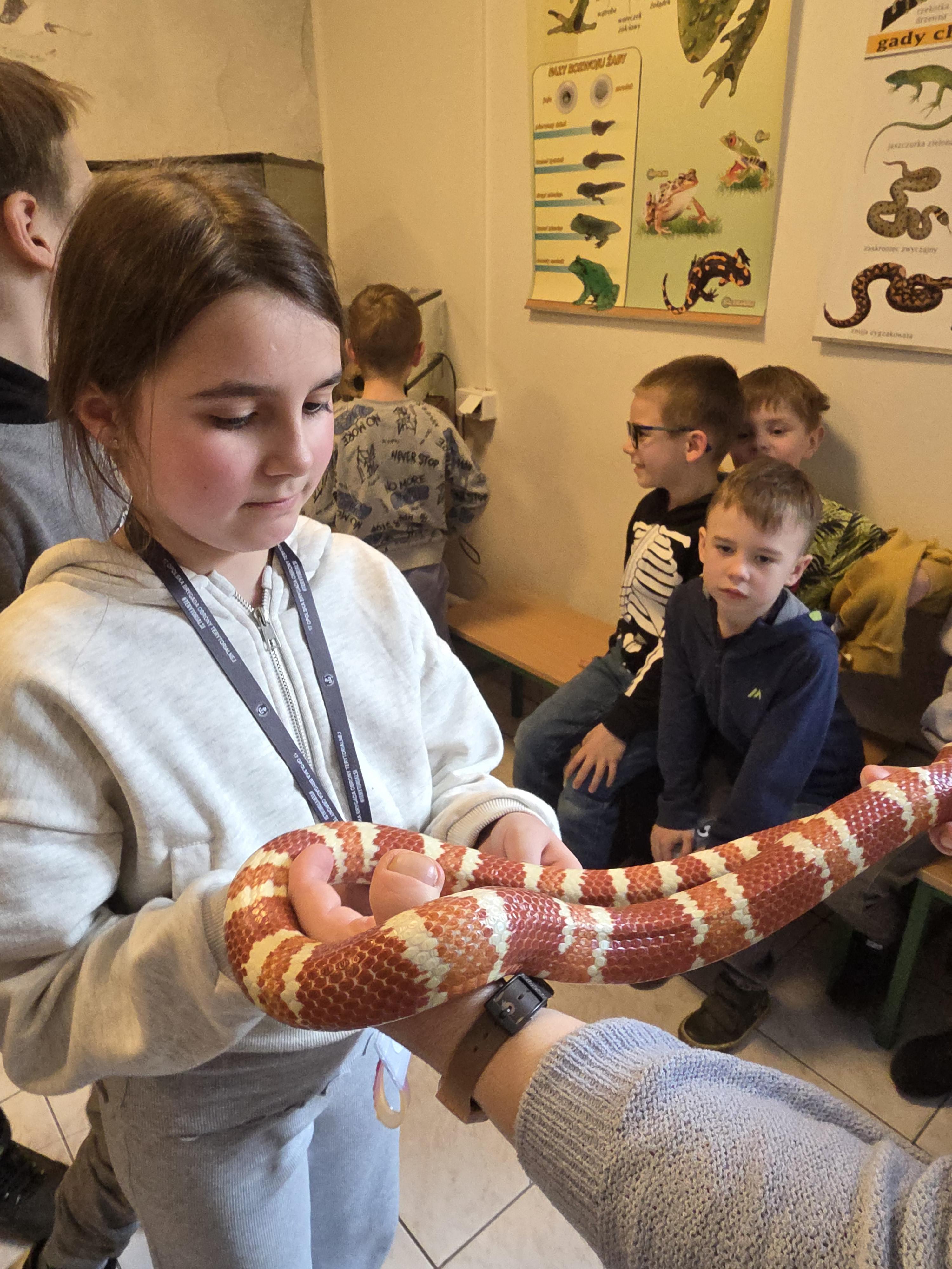 Podczas zajęć dzieci miały za zadanie posegregować różne pokarmy dla zwierząt roślinożernych, mięsożernych i wszystkożernych. Dowiedziały się również czym nie można karmić zwierząt. Miały także możliwość pogłaskać węża, jaszczurkę oraz potrzymać patyczaka. ![]()