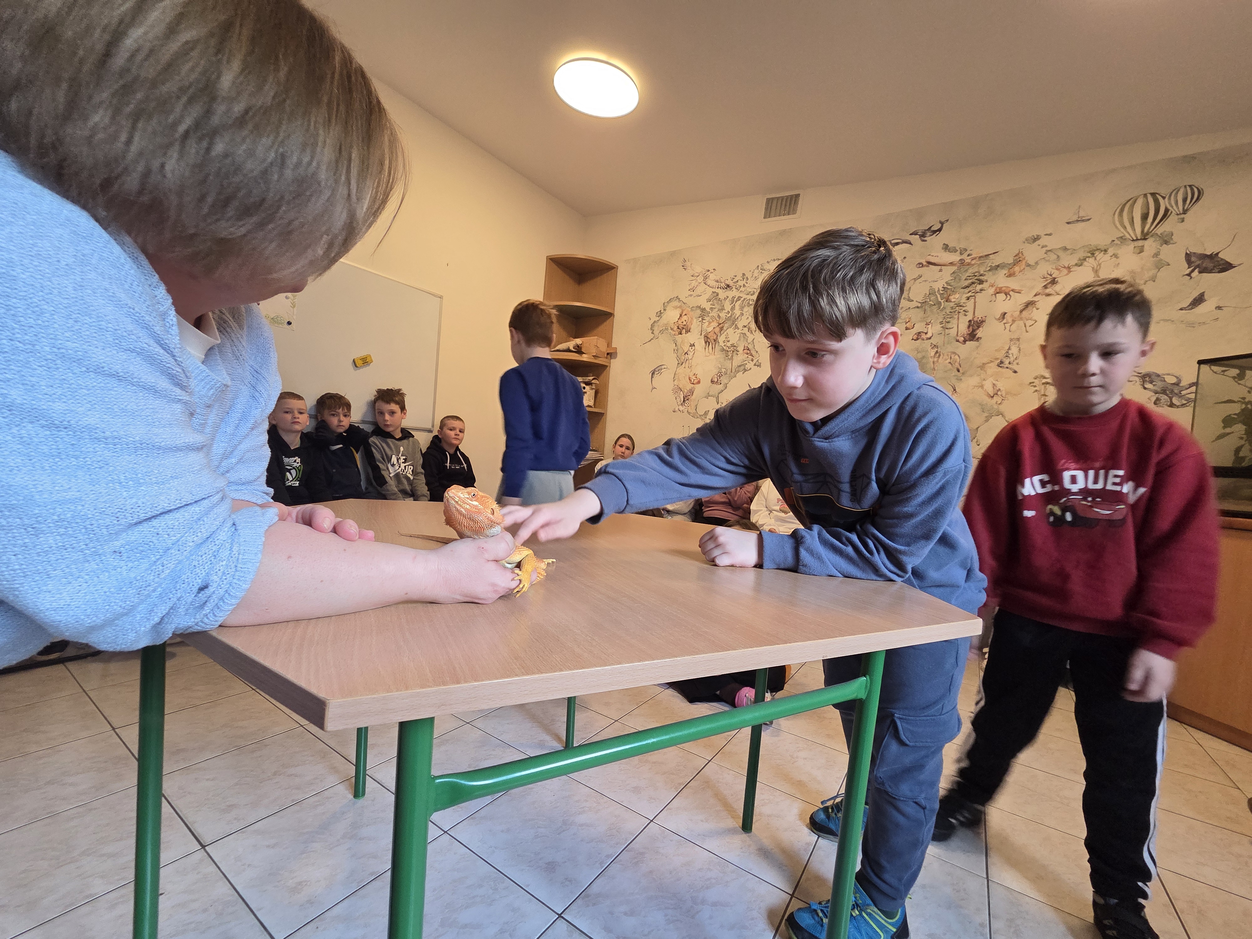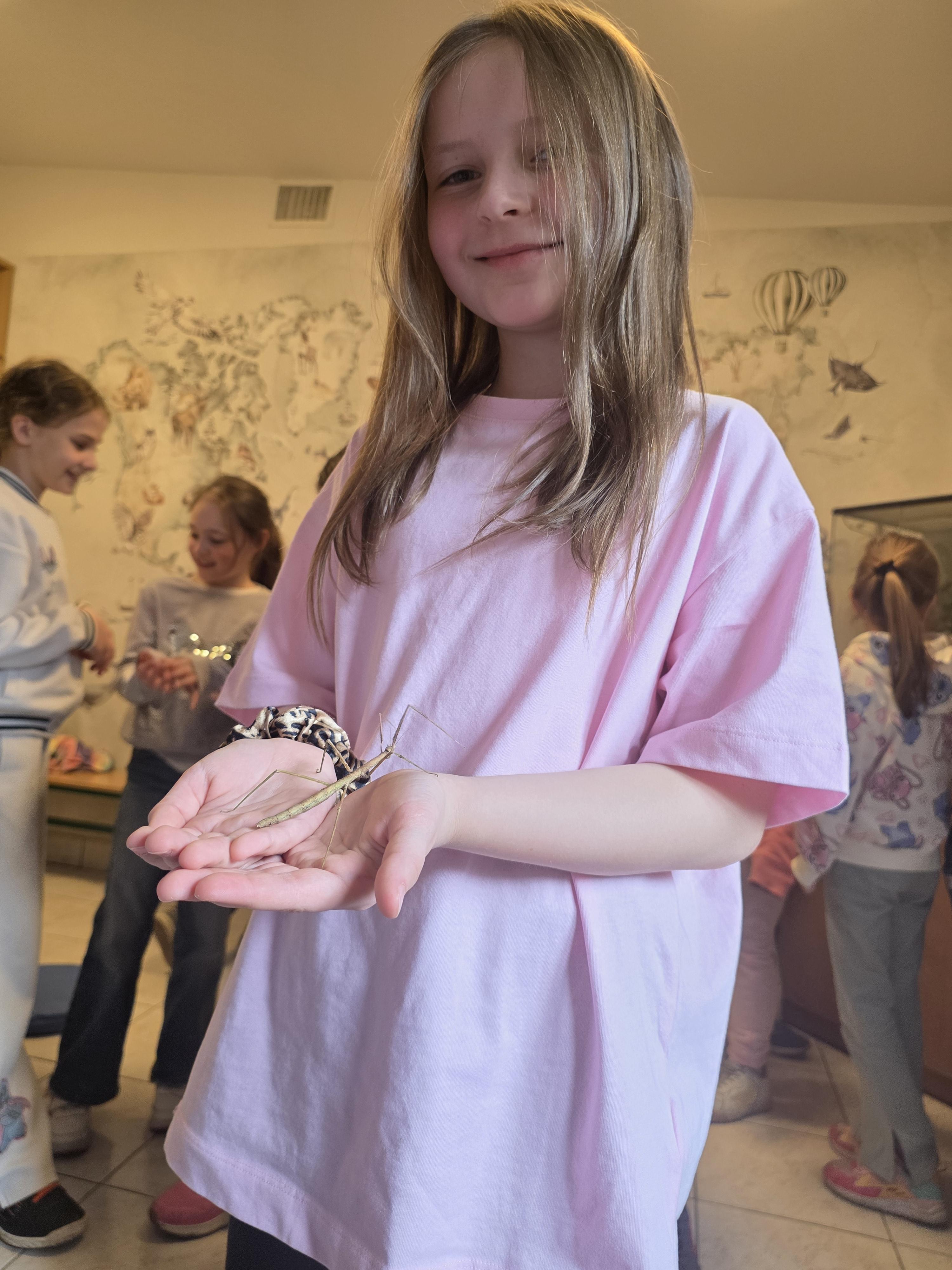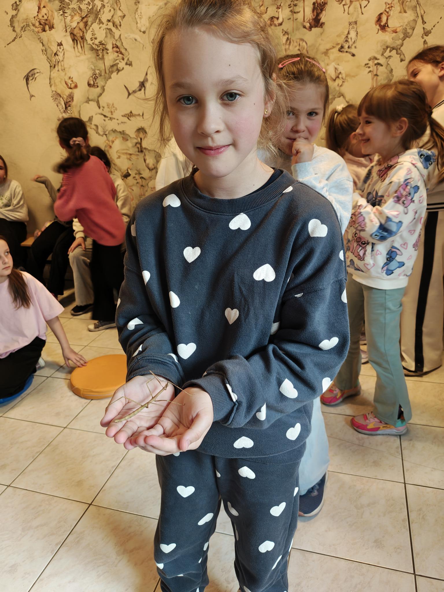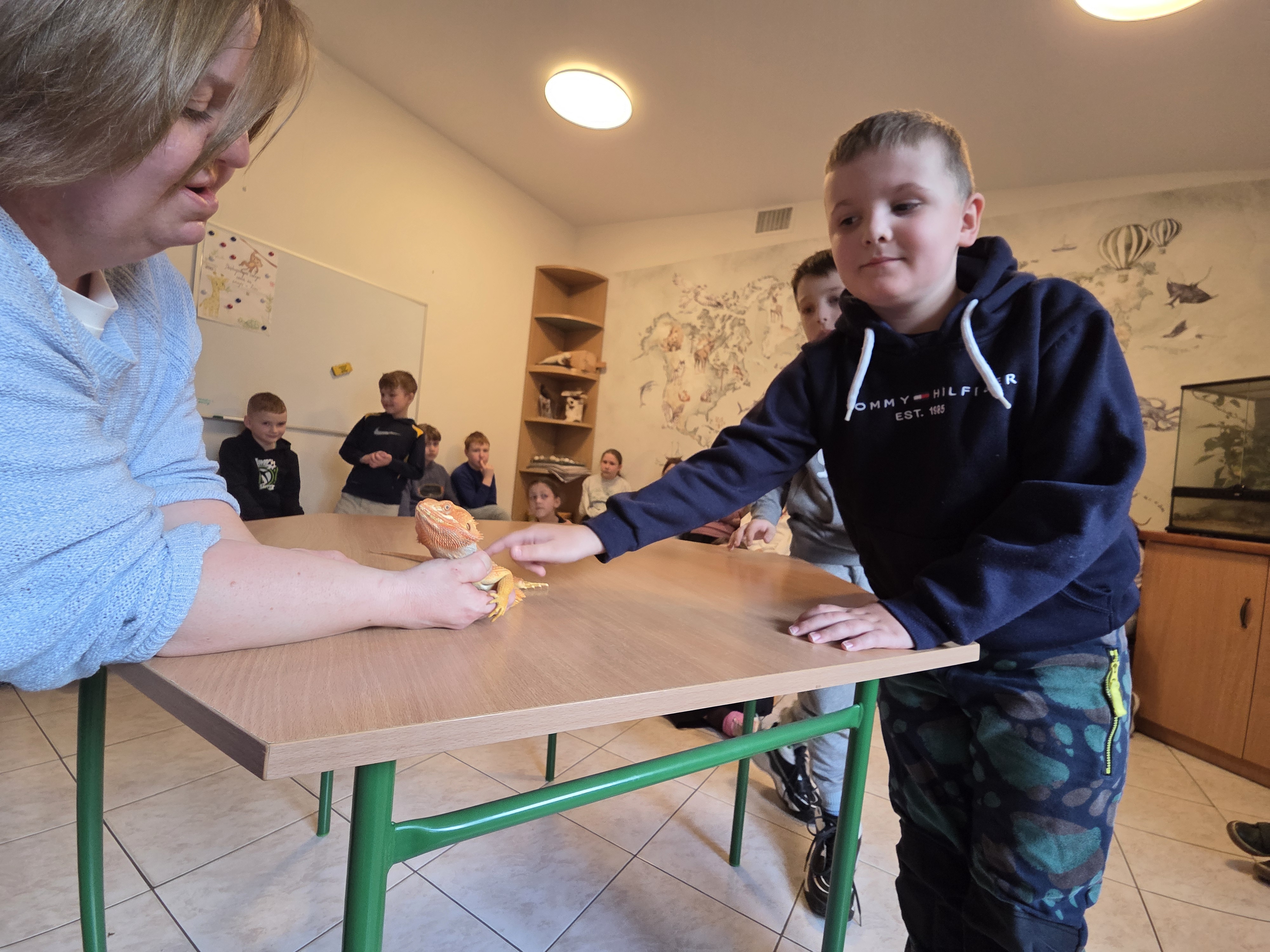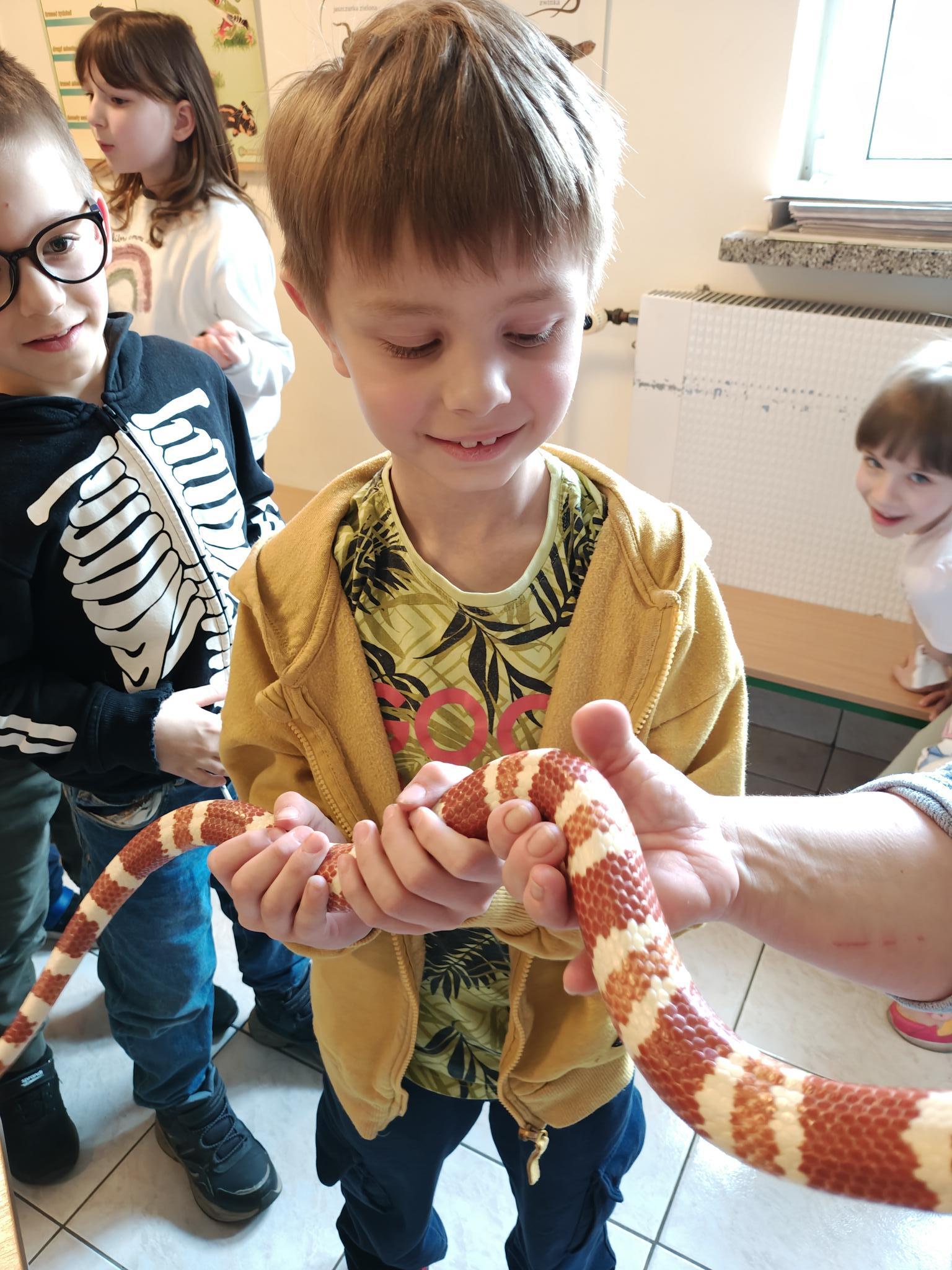 Podczas zajęć dzieci miały za zadanie posegregować różne pokarmy dla zwierząt roślinożernych, mięsożernych i wszystkożernych. Dowiedziały się również czym nie można karmić zwierząt. Miały także możliwość pogłaskać węża, jaszczurkę oraz potrzymać patyczaka. ![]()