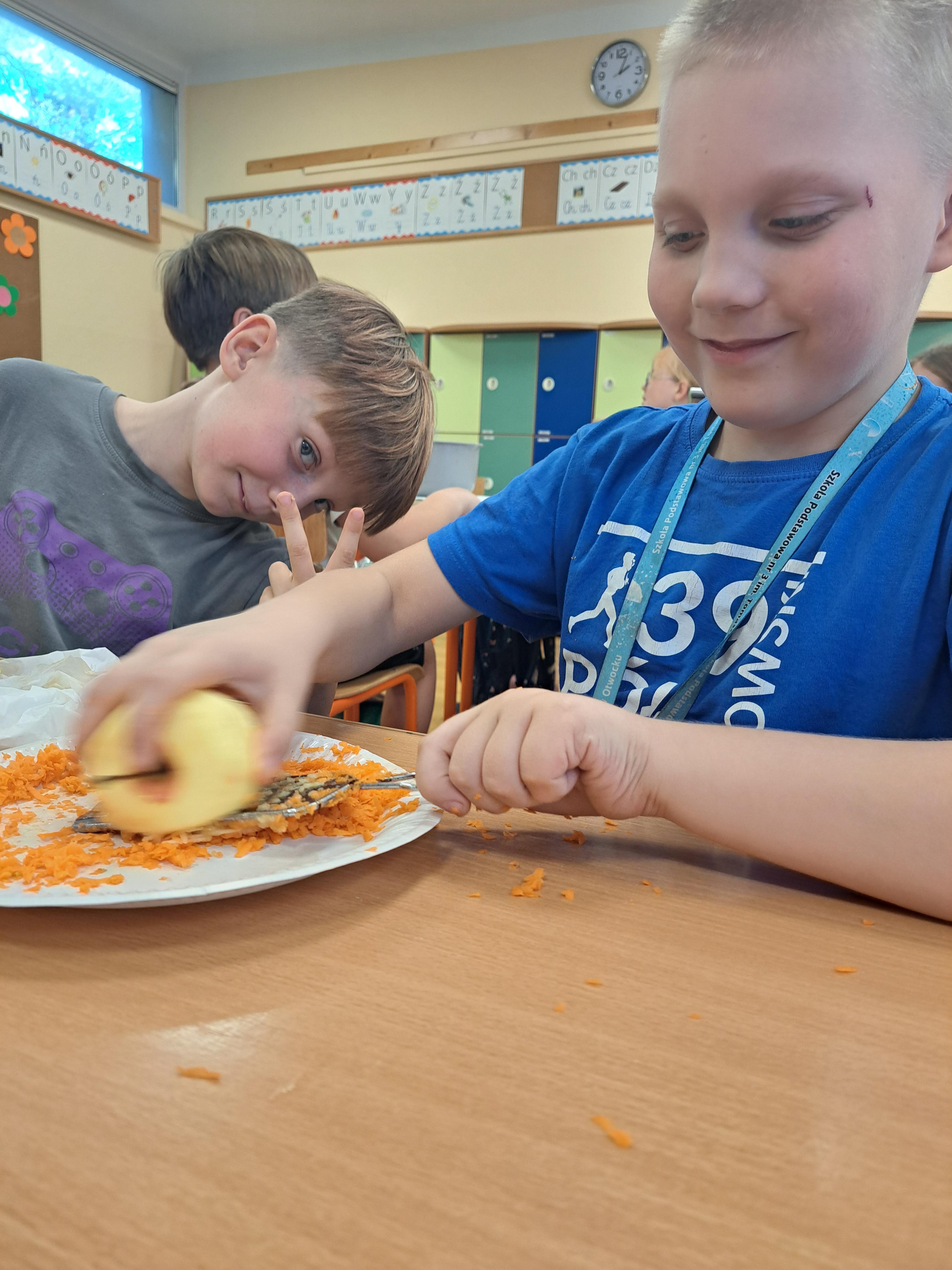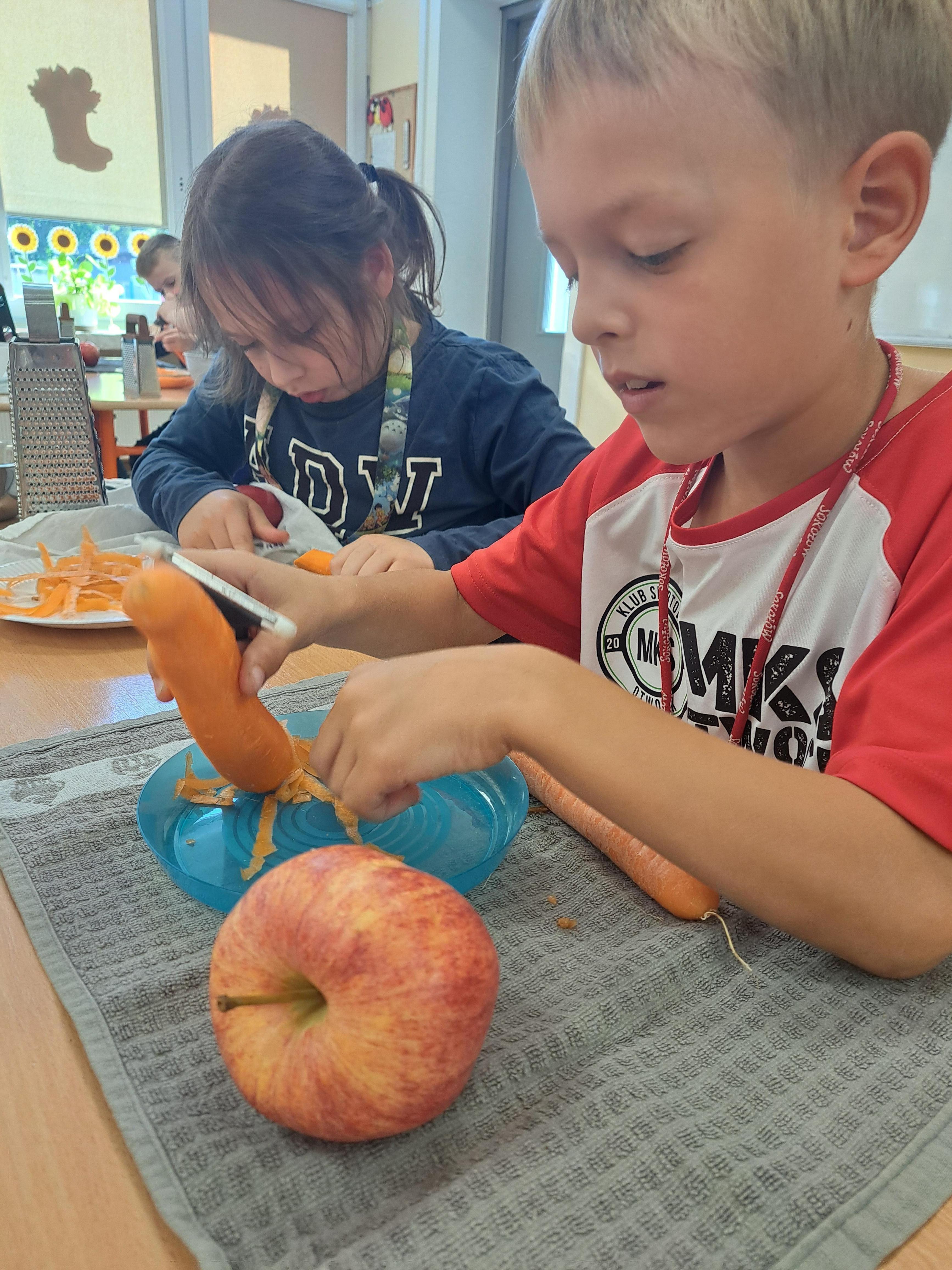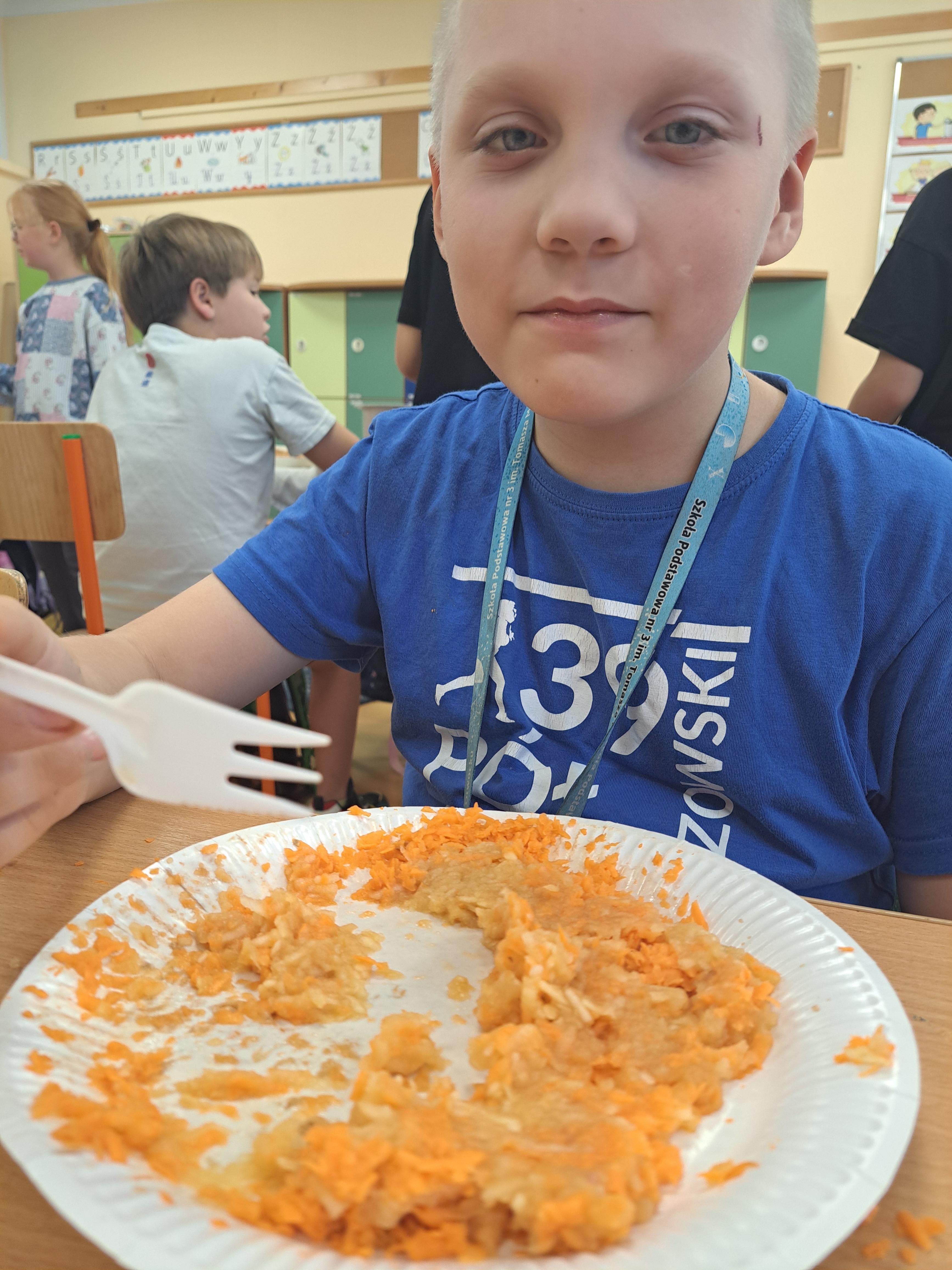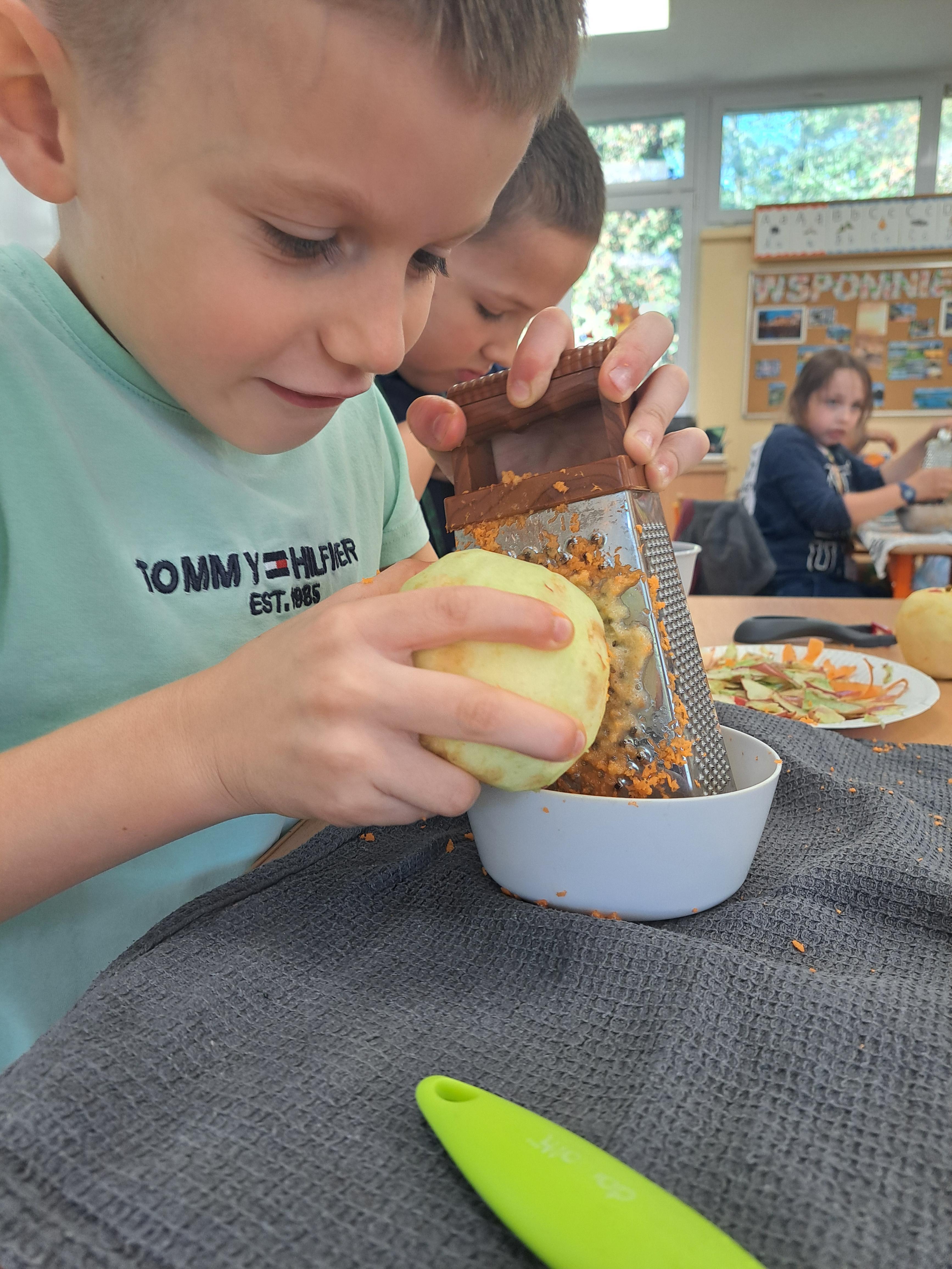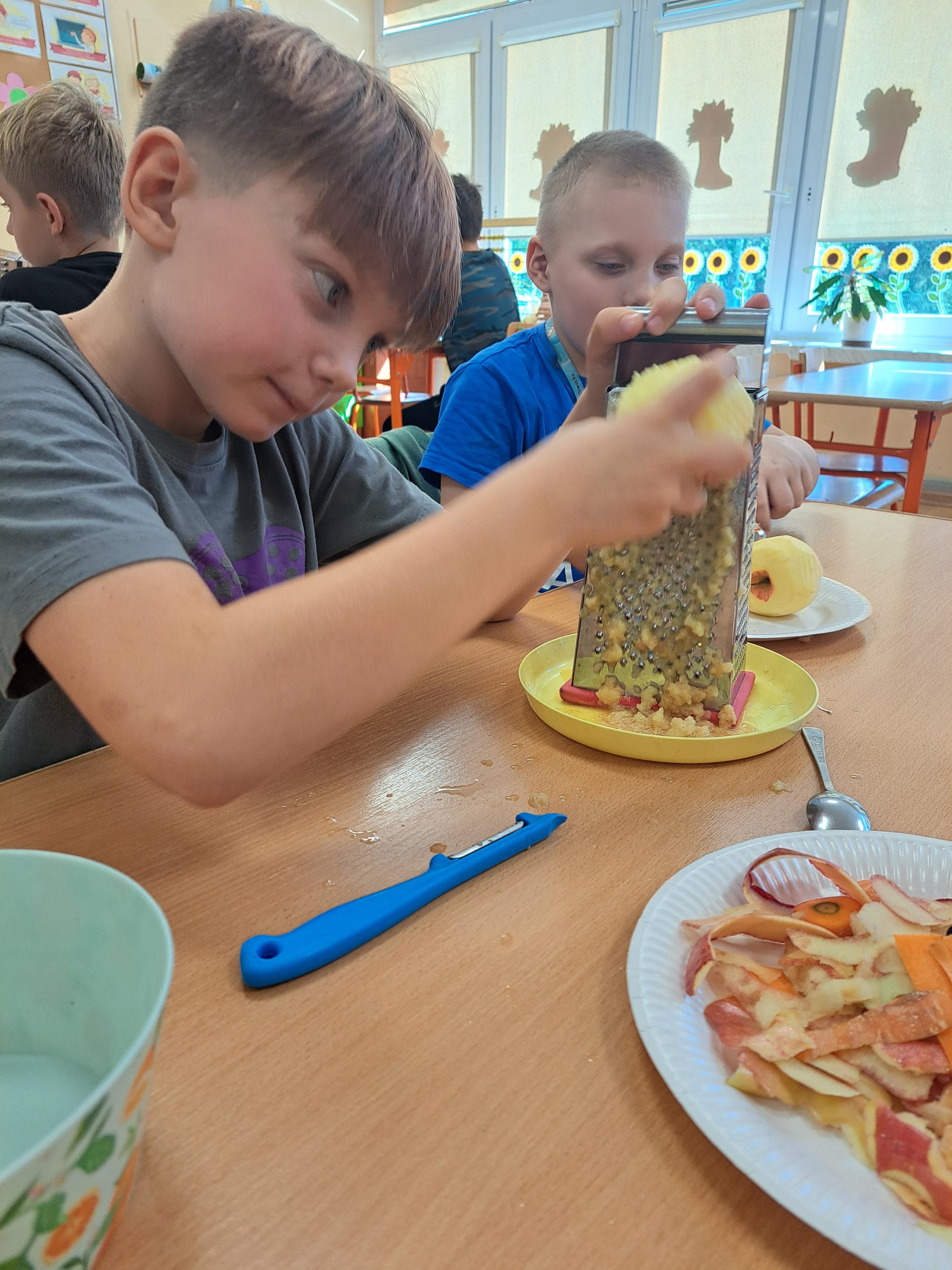 W ramach przygotowań do Dnia Jabłka uczniowie przygotowali soczyste witaminowe surówki z jabłka i marchewki.
