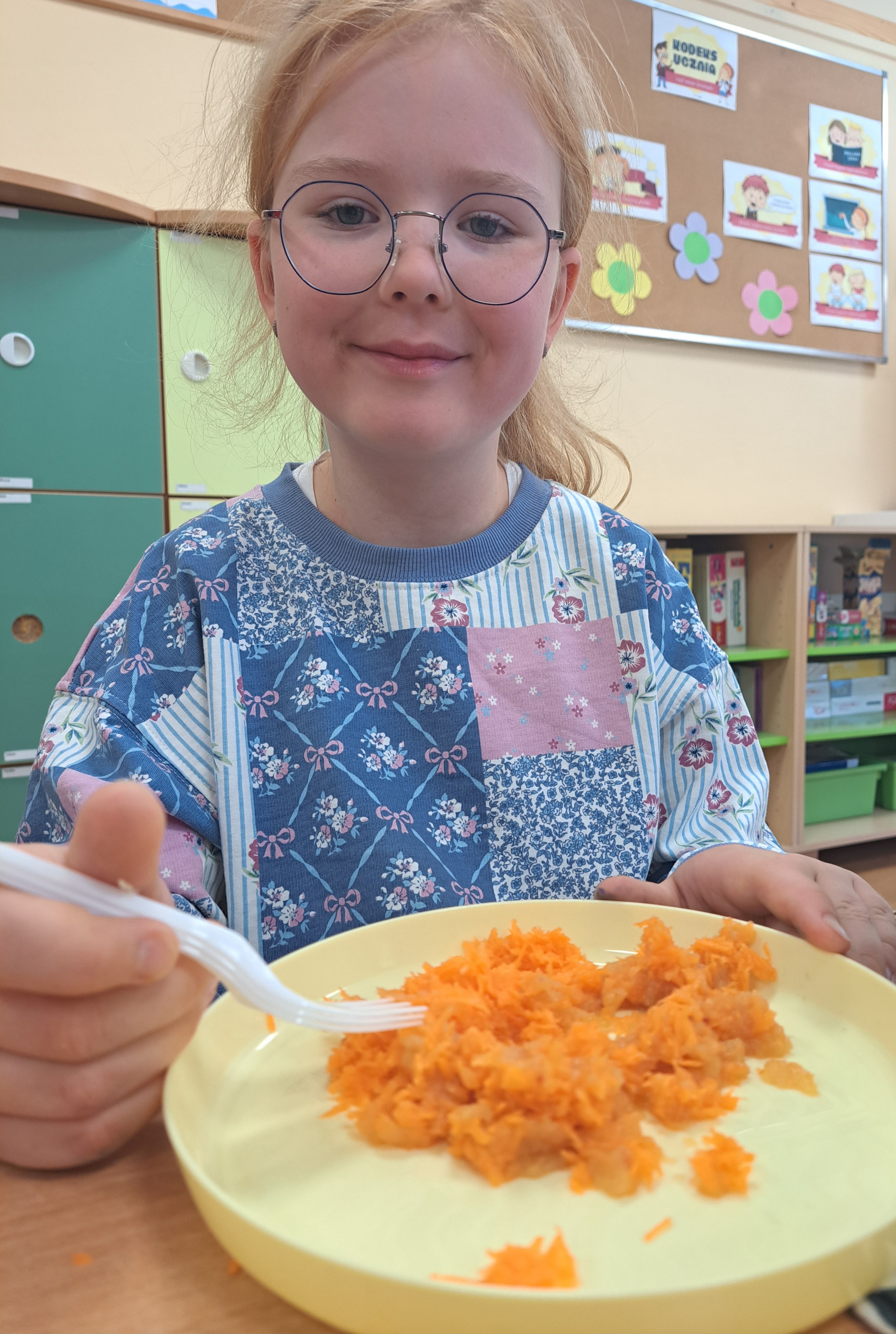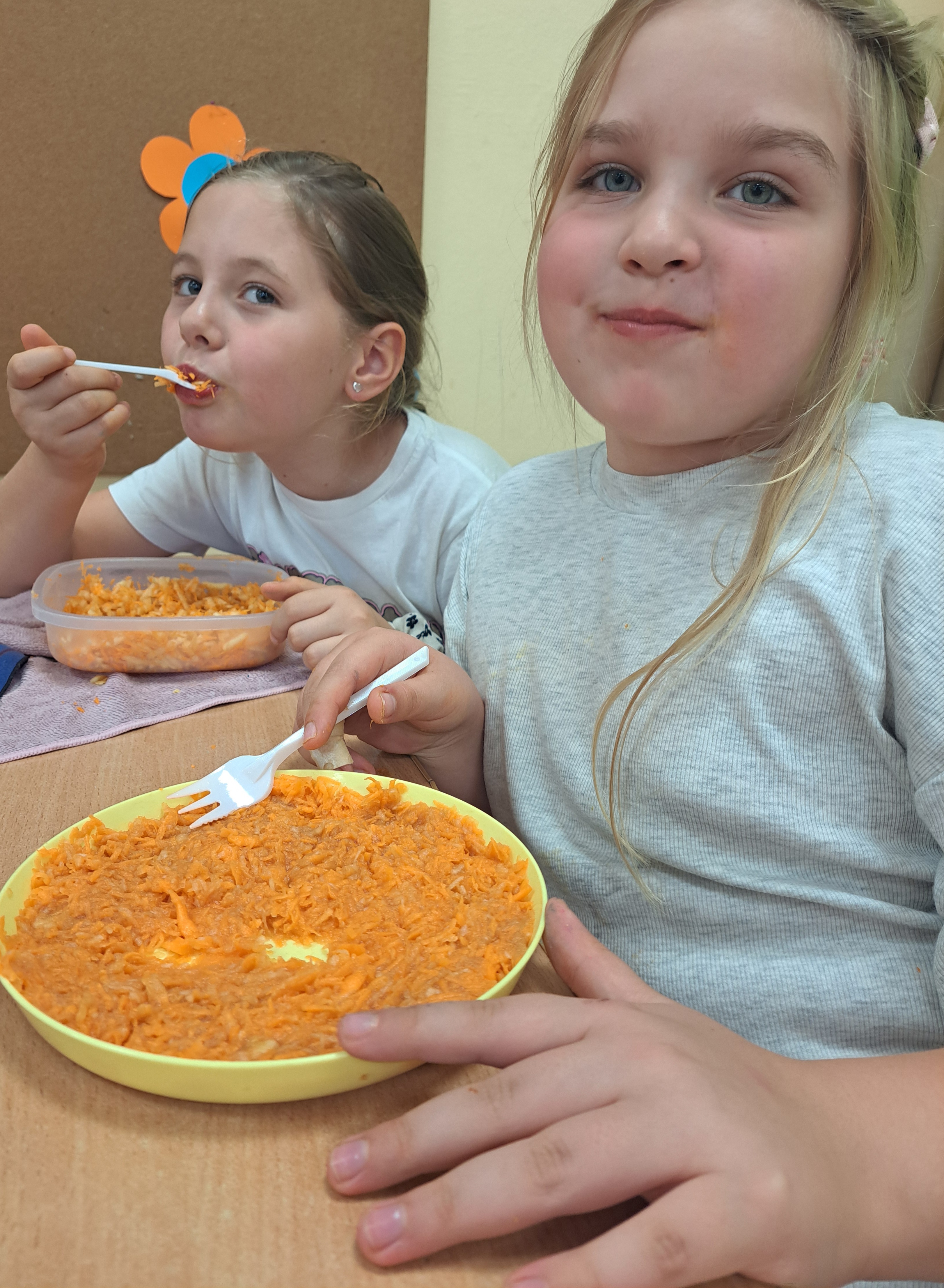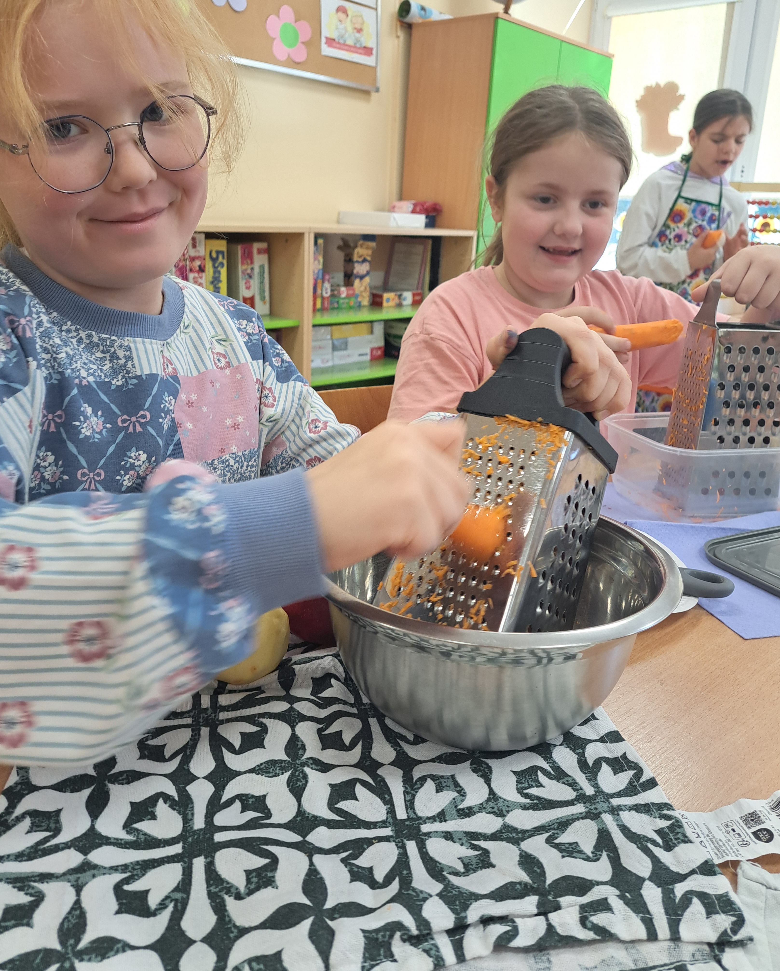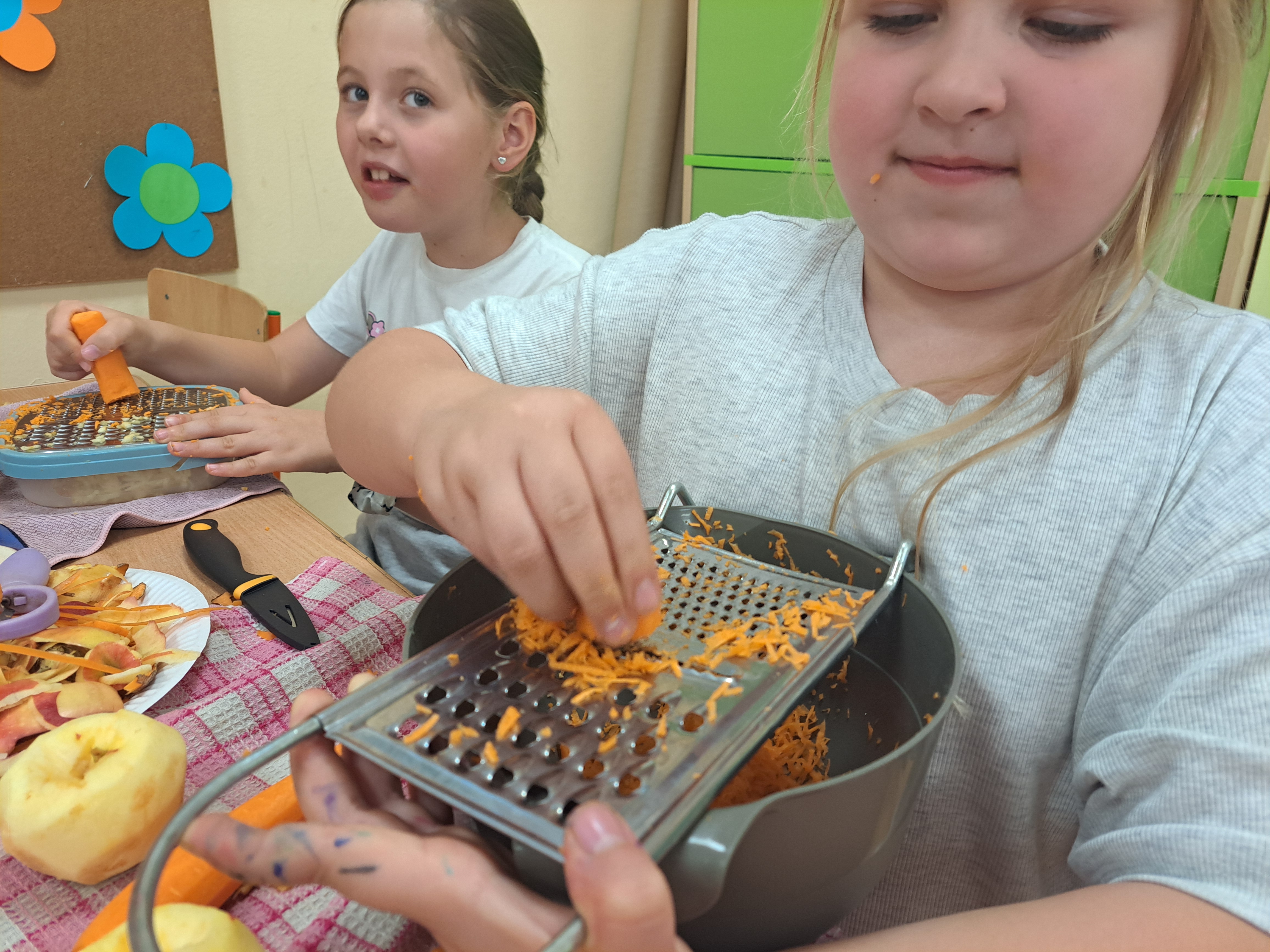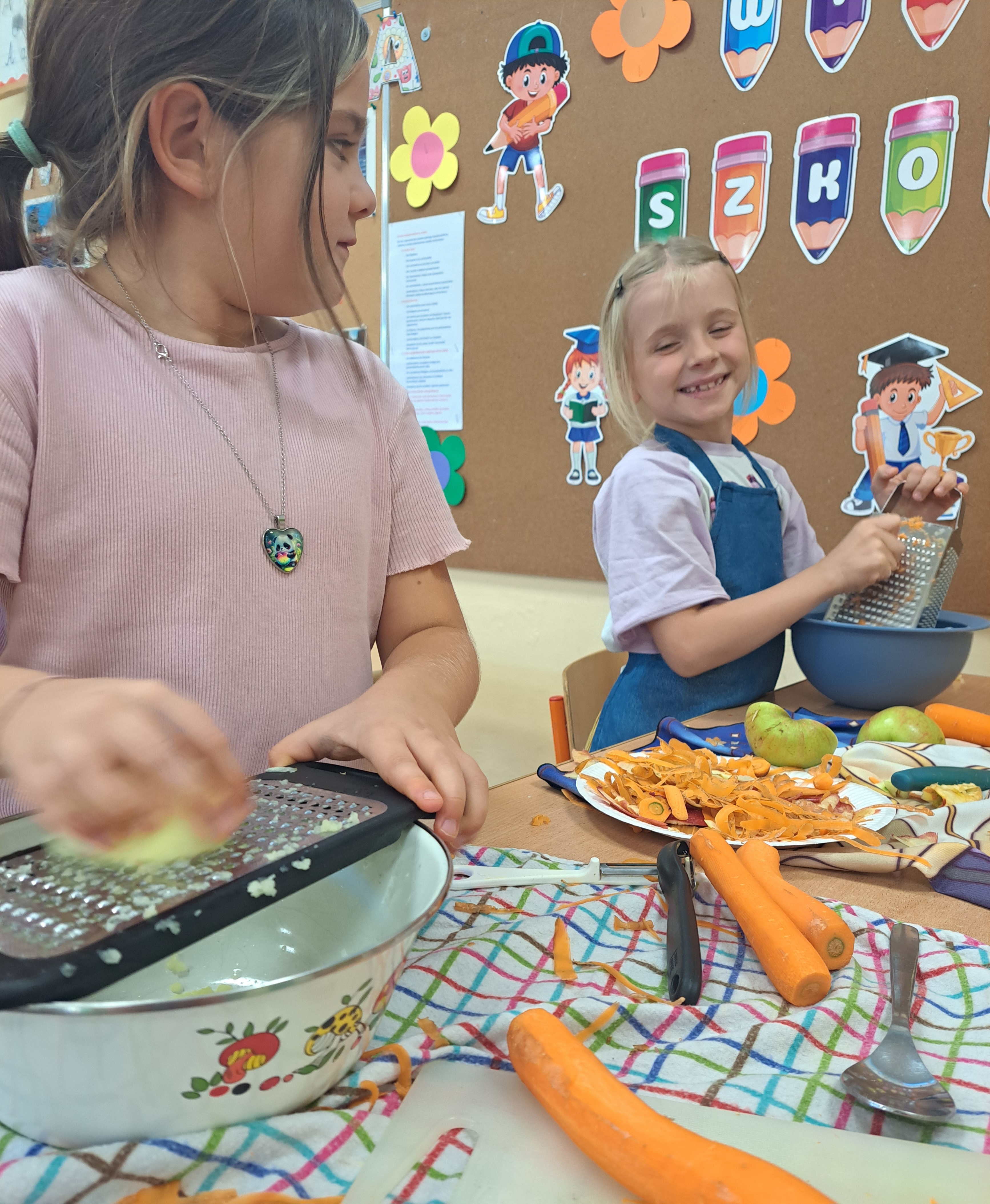 W ramach przygotowań do Dnia Jabłka uczniowie przygotowali soczyste witaminowe surówki z jabłka i marchewki.