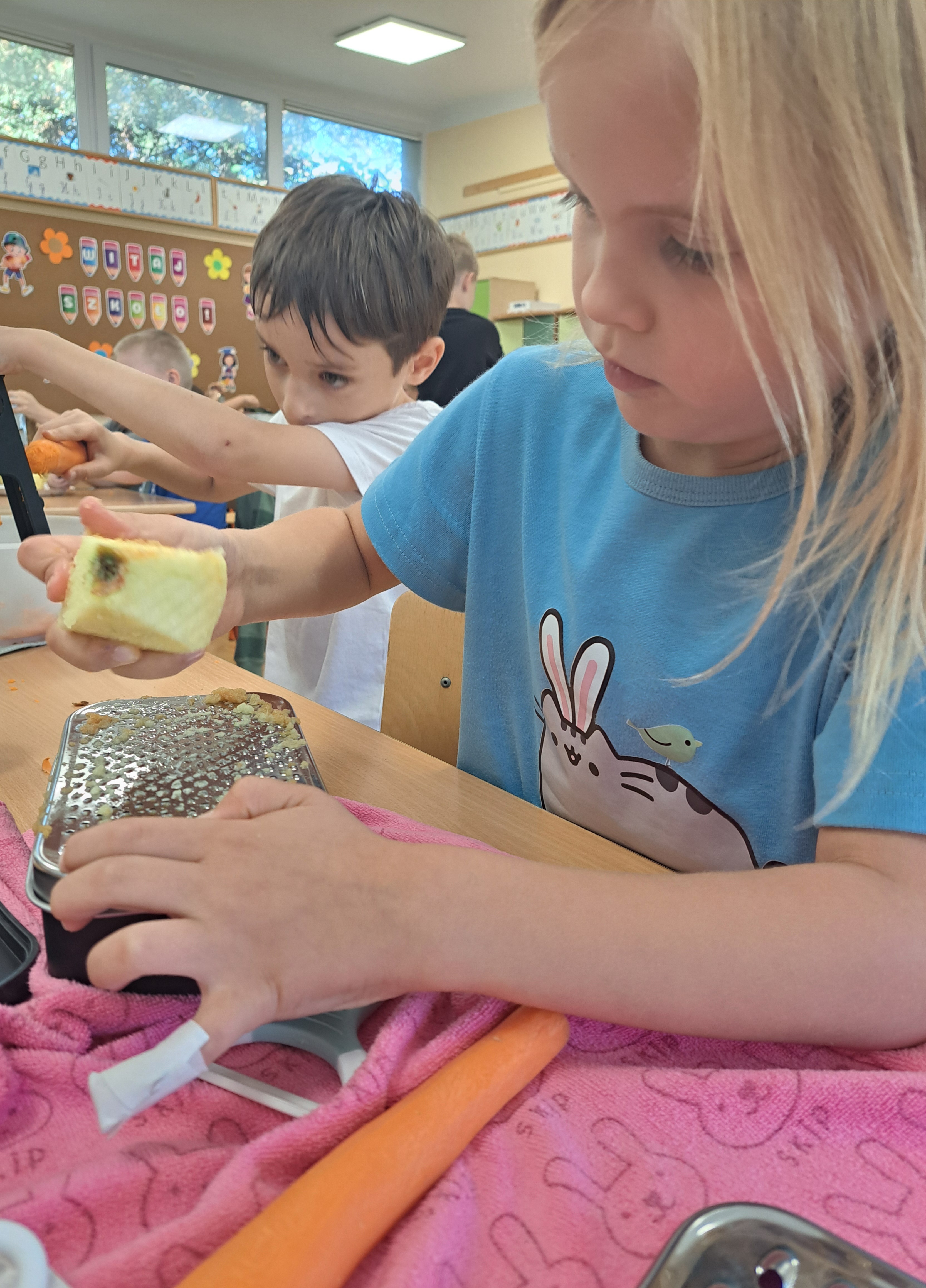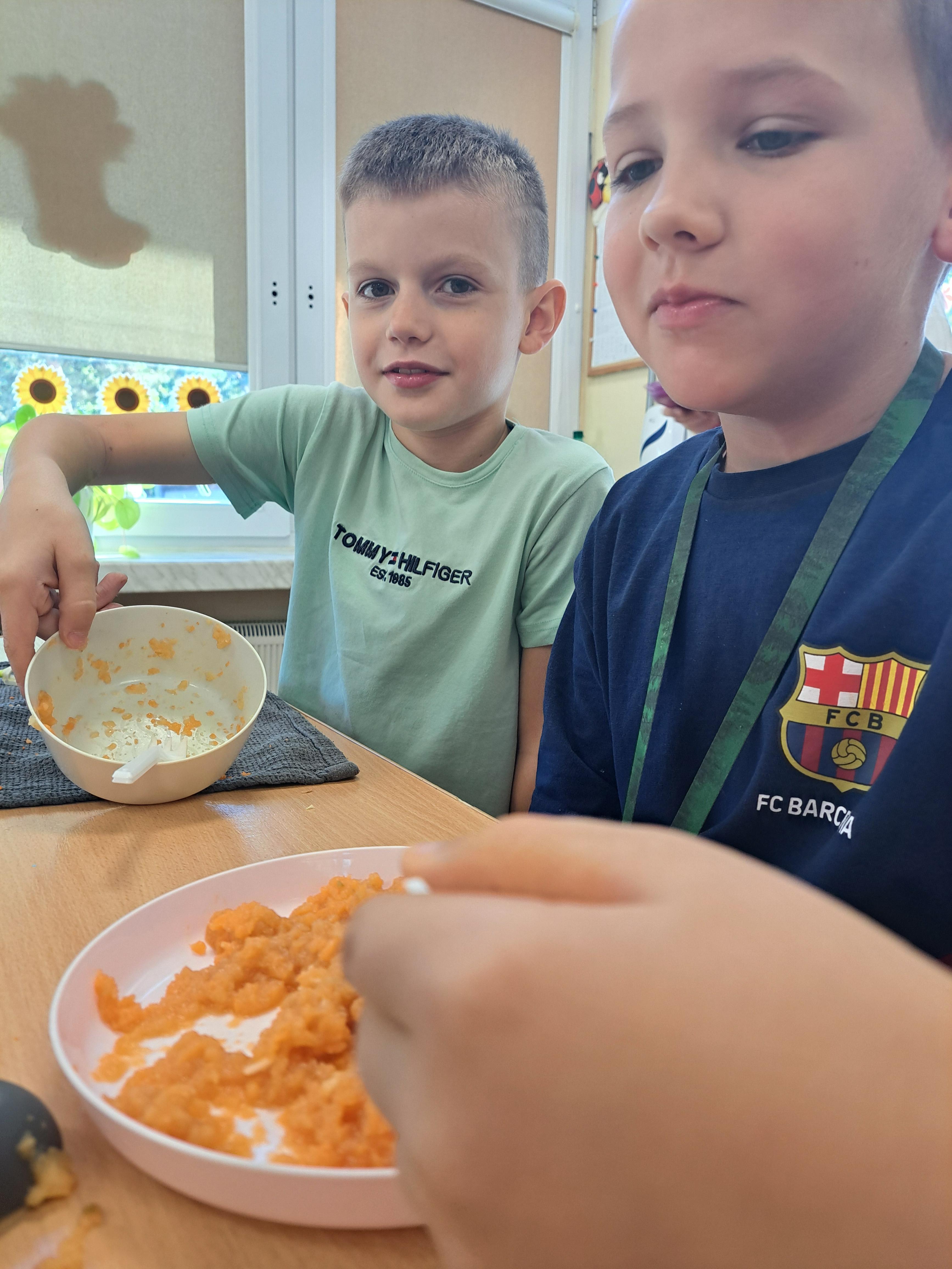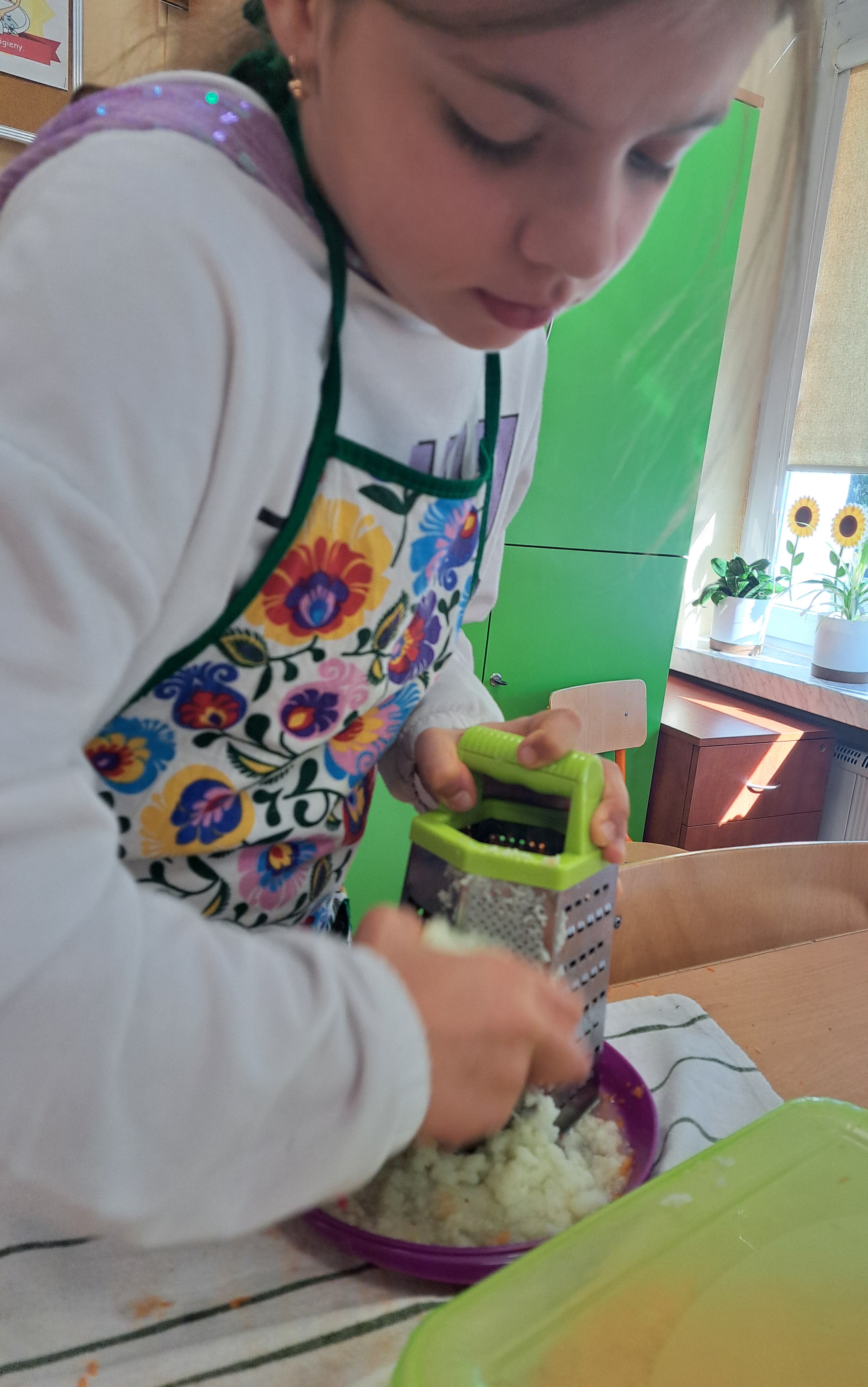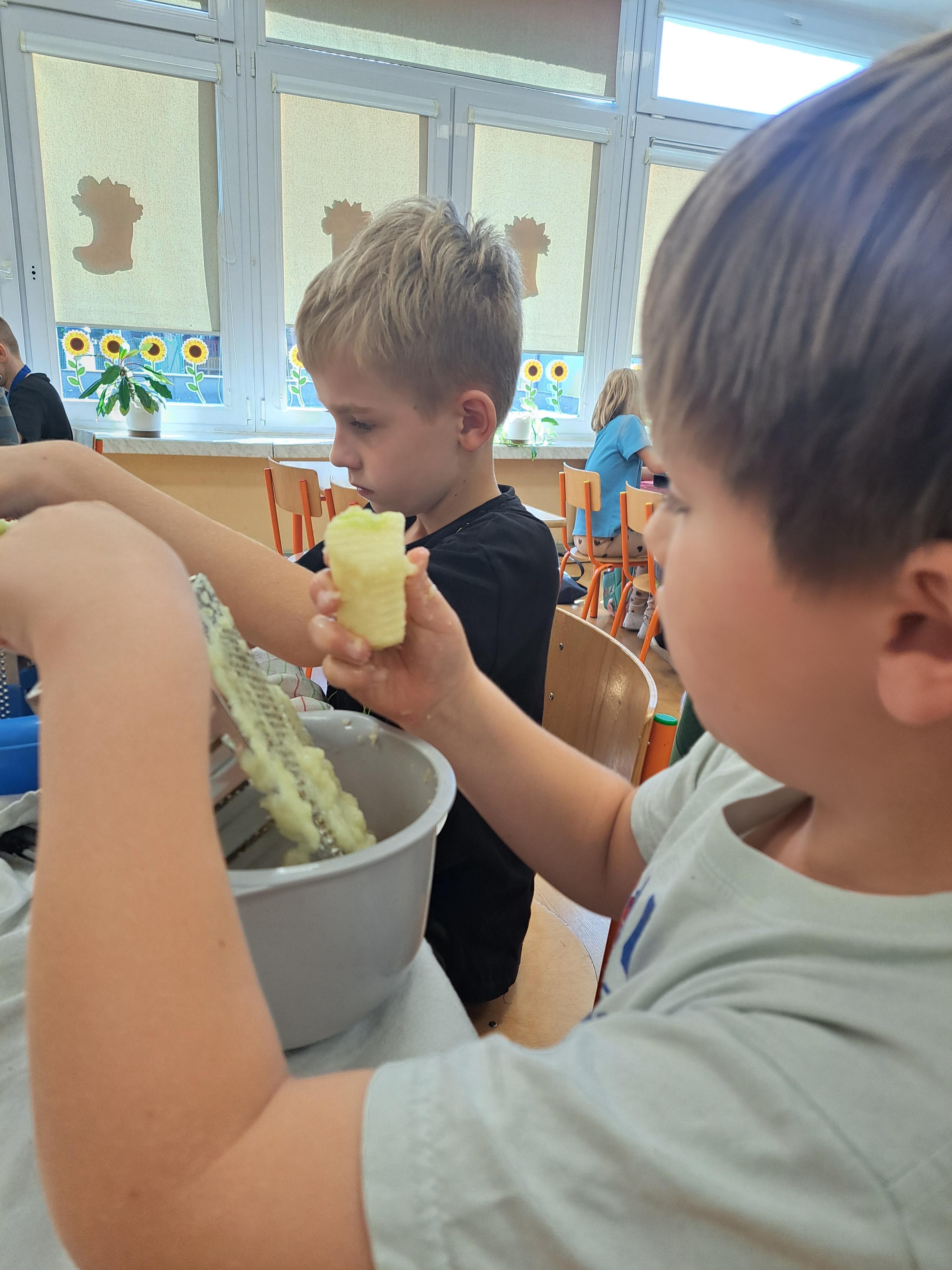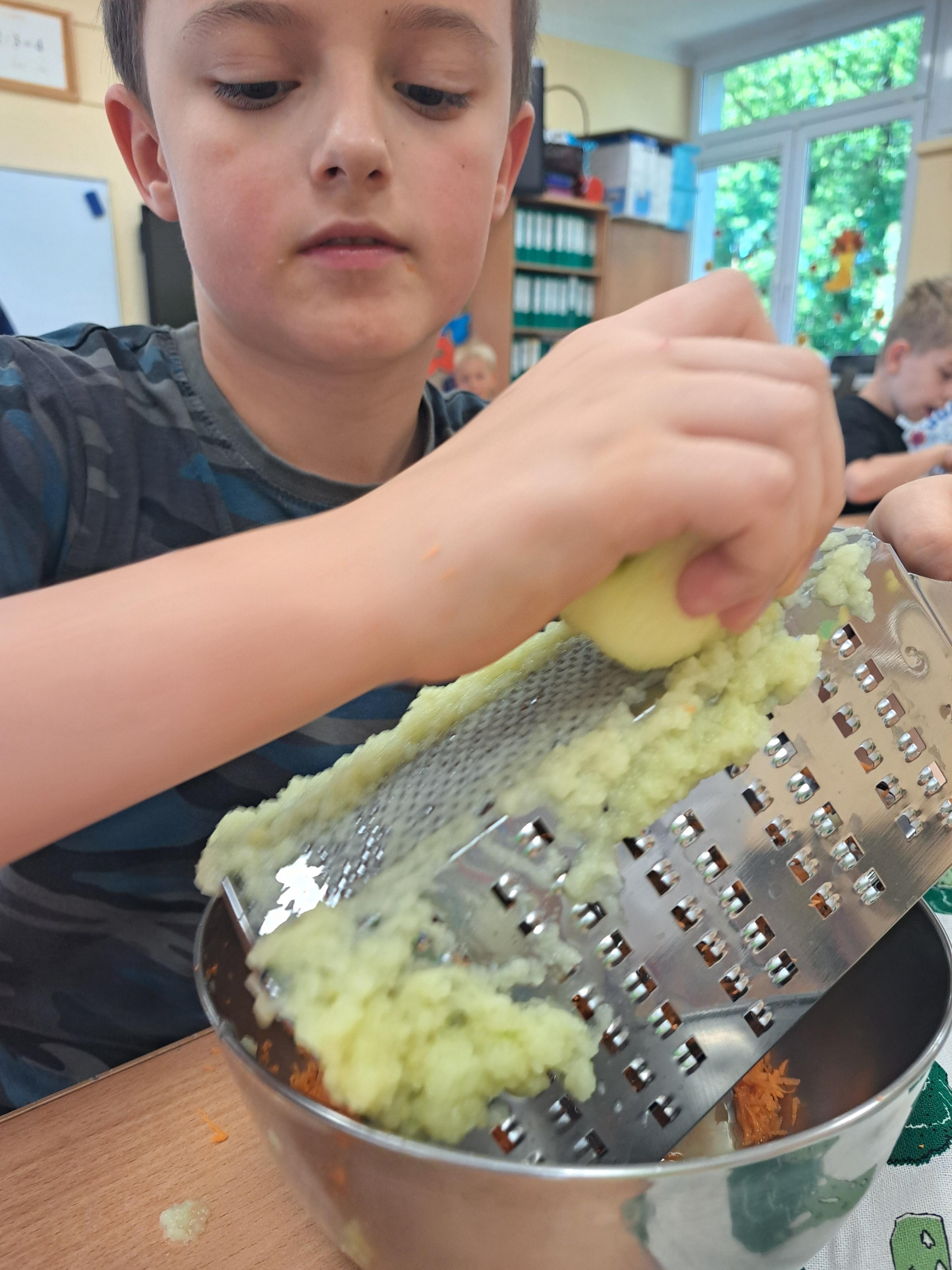 W ramach przygotowań do Dnia Jabłka uczniowie przygotowali soczyste witaminowe surówki z jabłka i marchewki.