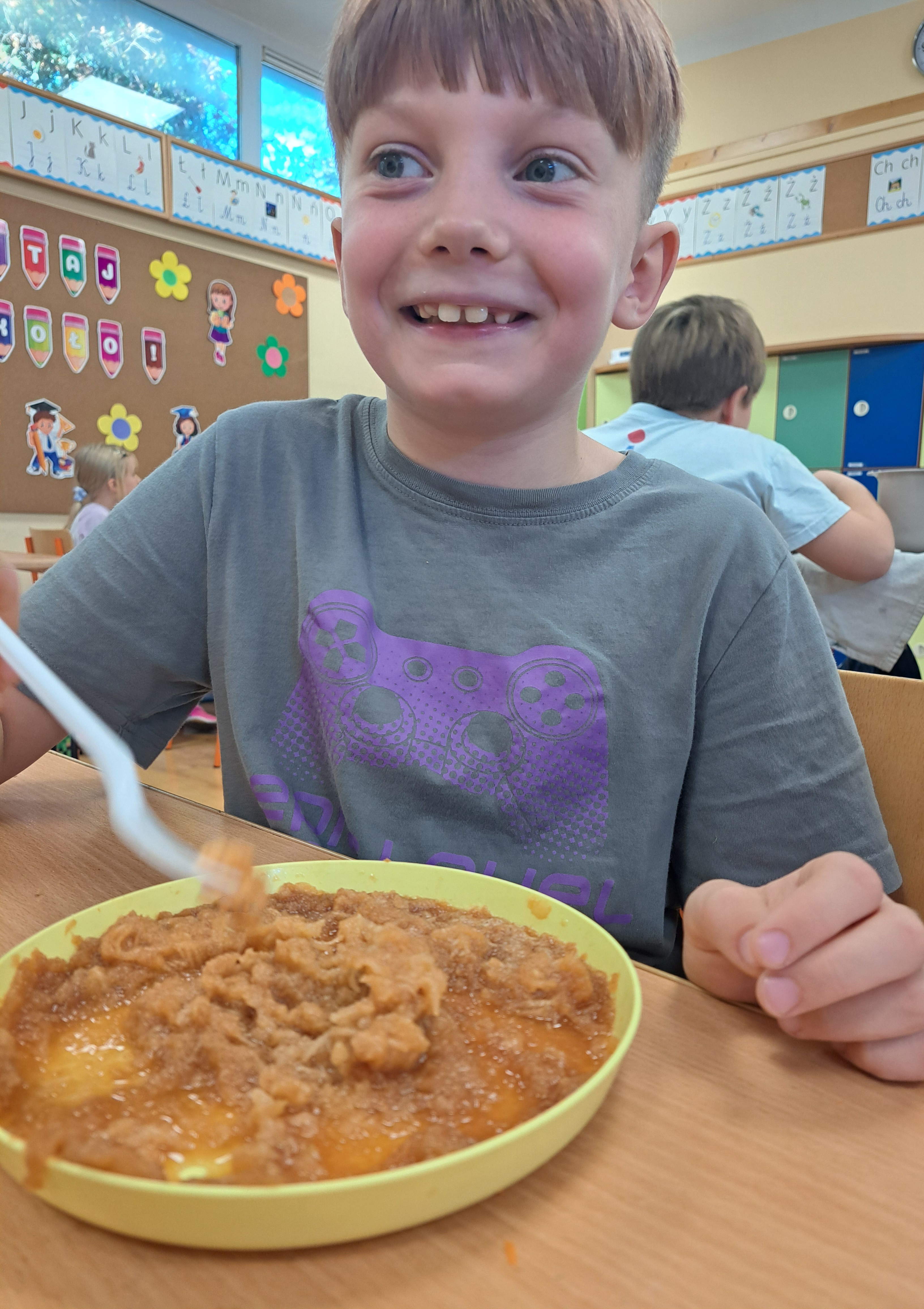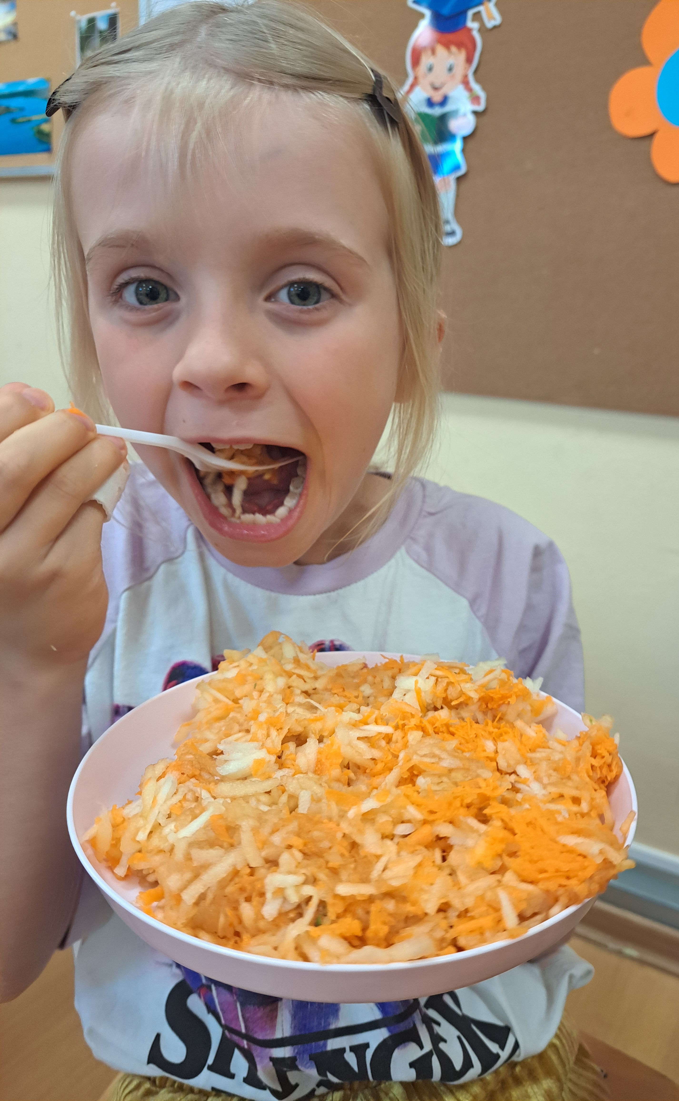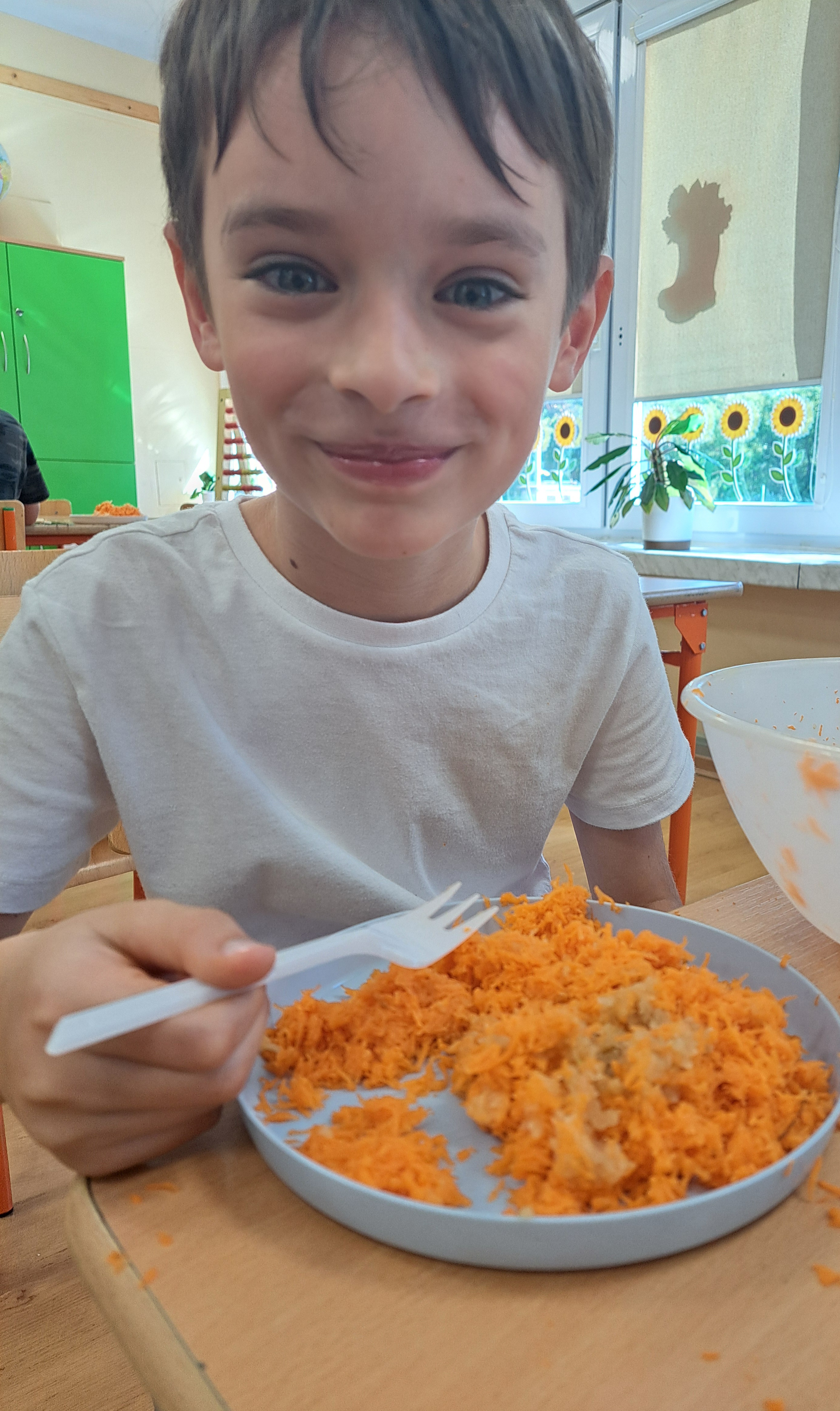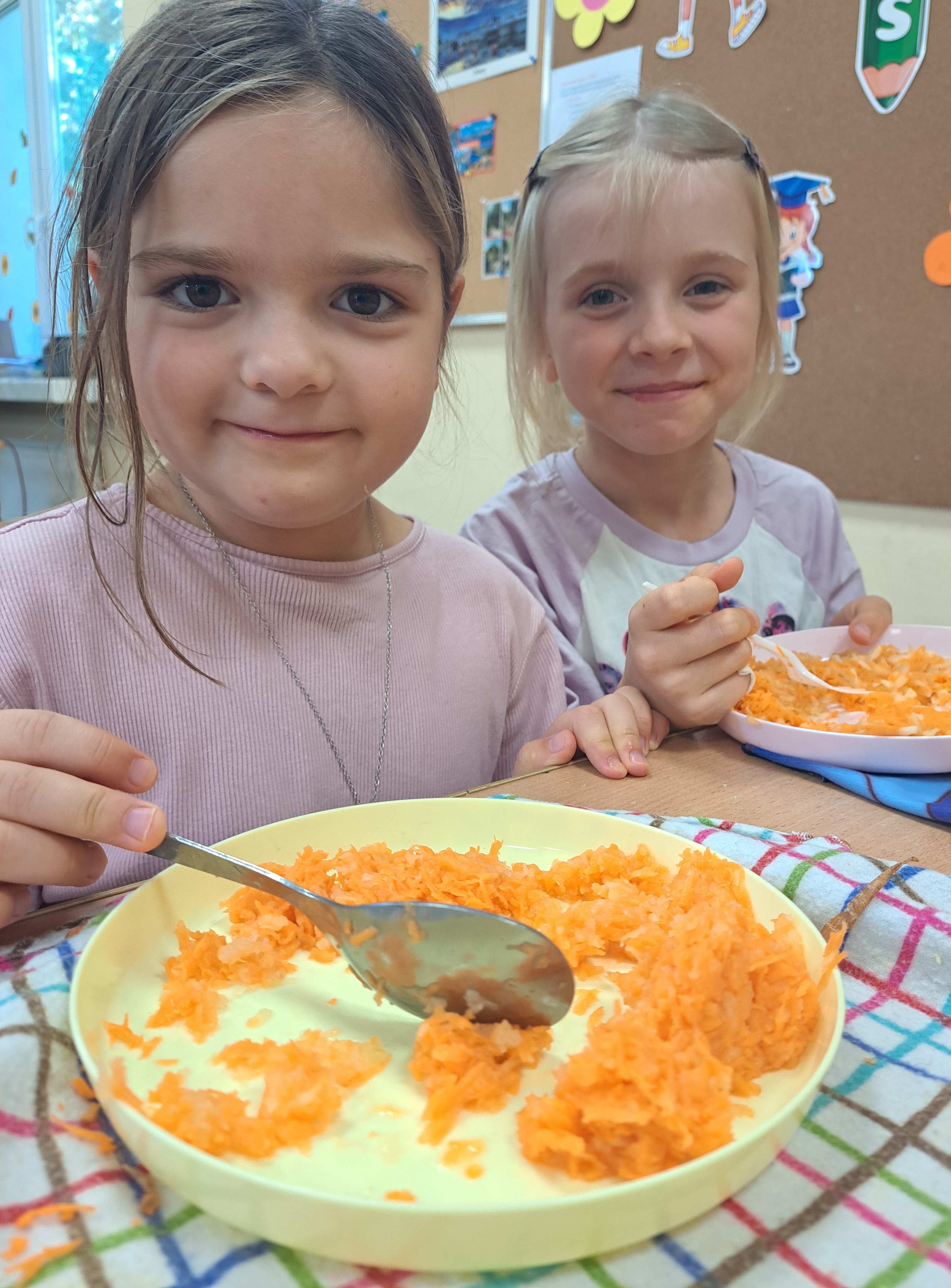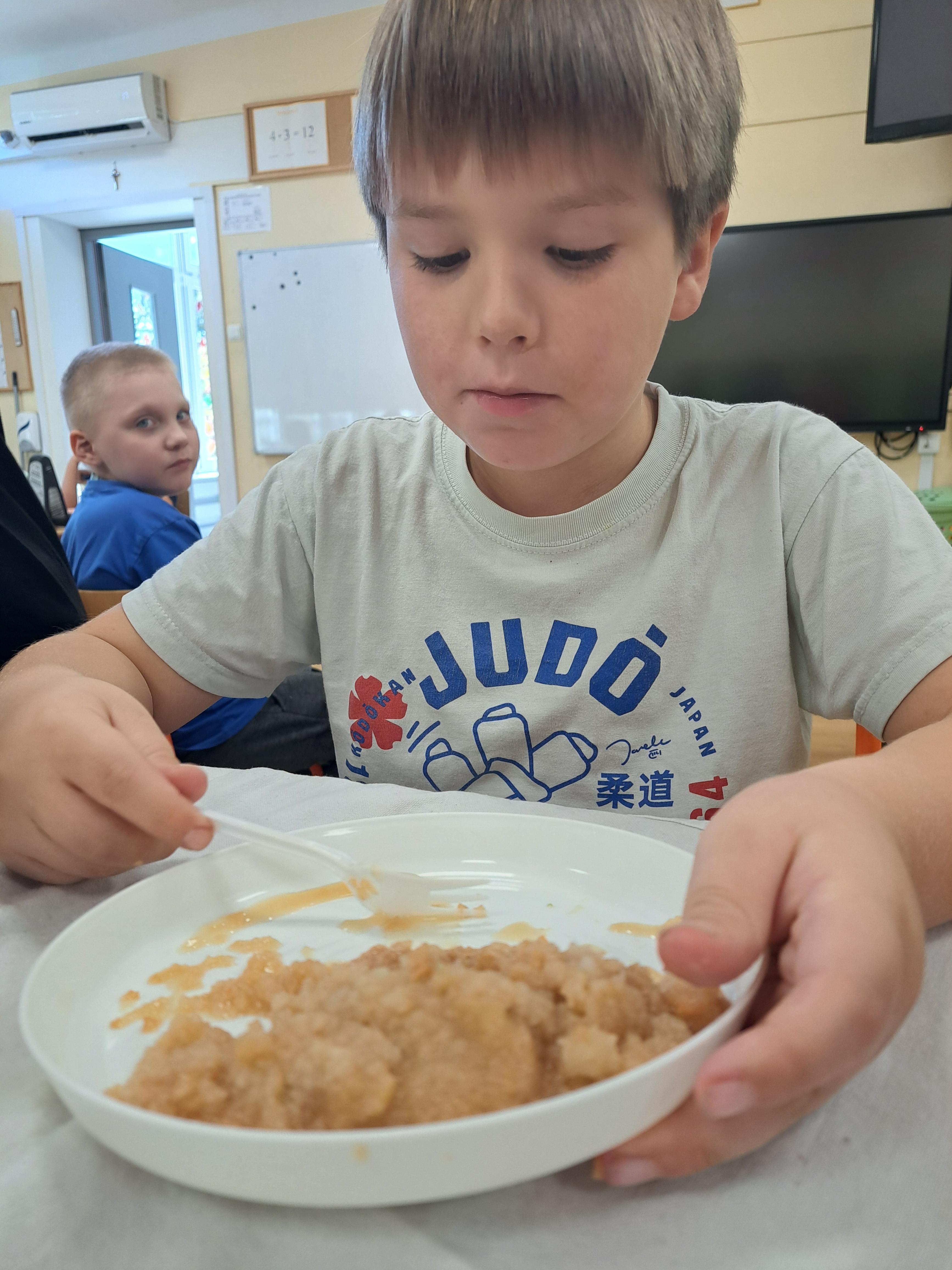 W ramach przygotowań do Dnia Jabłka uczniowie przygotowali soczyste witaminowe surówki z jabłka i marchewki.